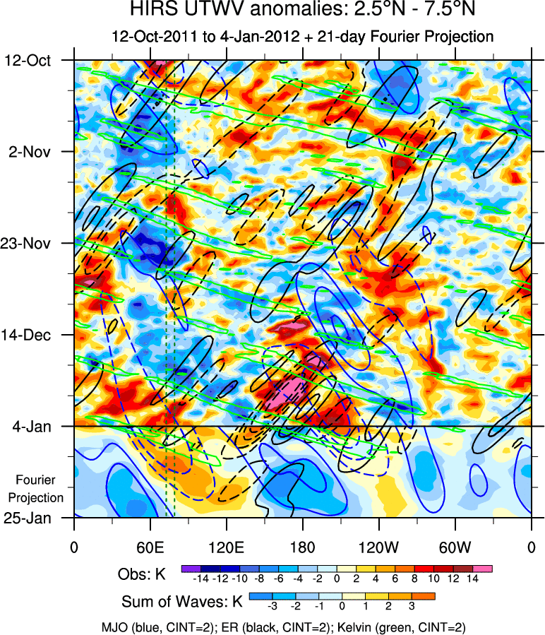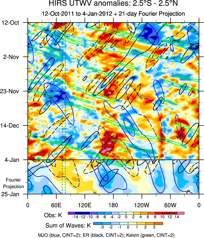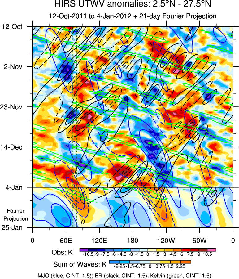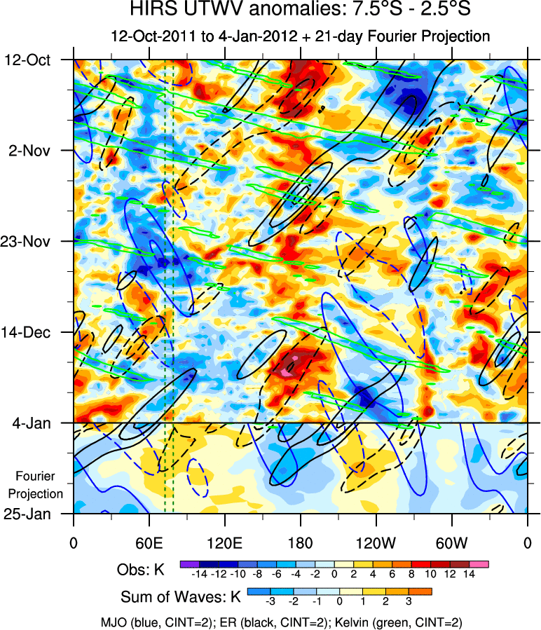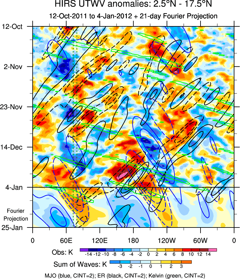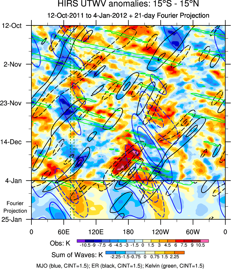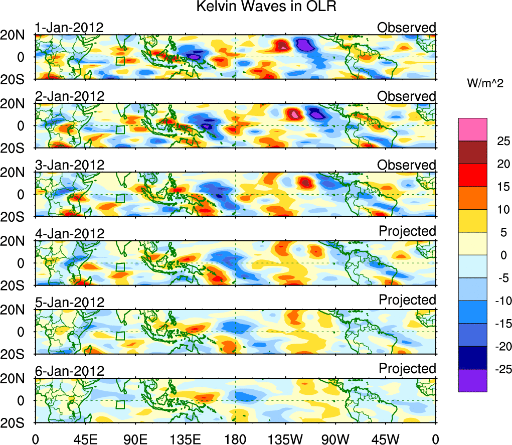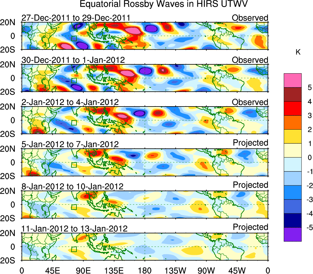 To identify tropical waves in near real-time, the OLR and UTWV data are filtered following Wheeler & Weickmann (2001 MWR). The daily anomalies are calculated using the first 3 harmonics of the seasonal cycle for 1979–2009. Missing values are then filled using linear interpolation in space and time. The most recent 365 days of anomalies are padded with 659 days of zeroes, and the result is filtered for each wave type.