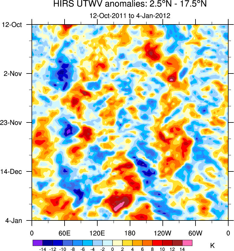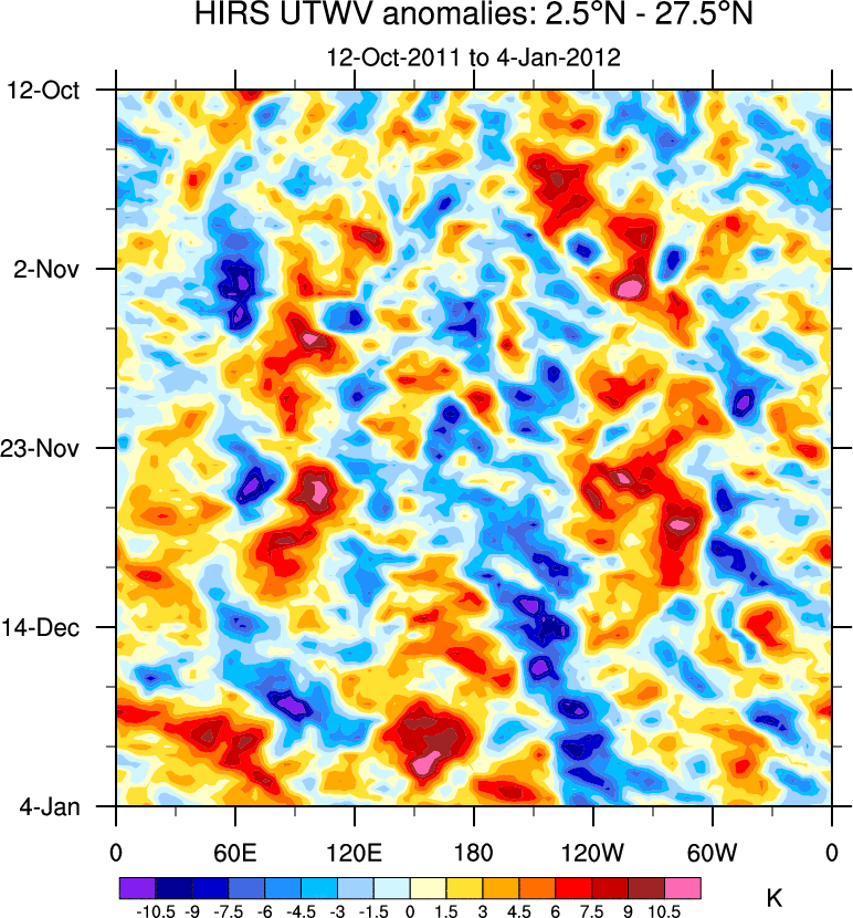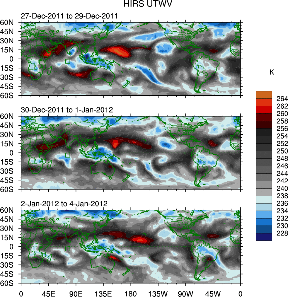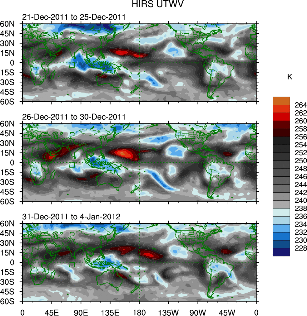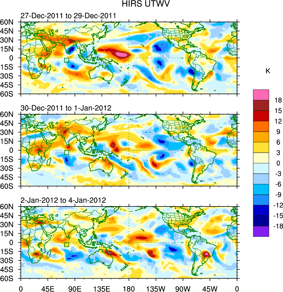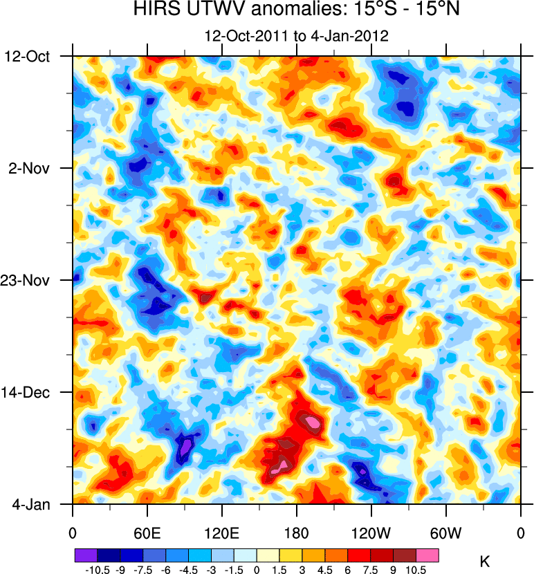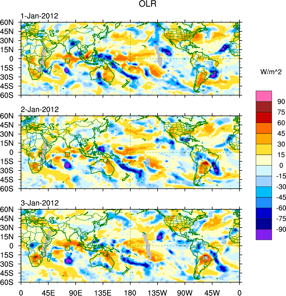 To identify tropical waves in near real-time, the OLR and UTWV data are filtered following Wheeler & Weickmann (2001 MWR). The daily anomalies are calculated using the first 3 harmonics of the seasonal cycle for 1979–2009. Missing values are then filled using linear interpolation in space and time. The most recent 365 days of anomalies are padded with 659 days of zeroes, and the result is filtered for each wave type.
