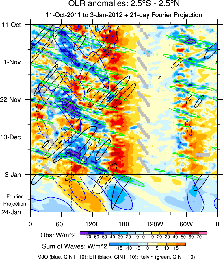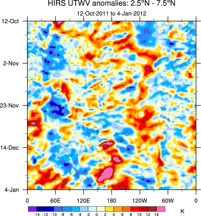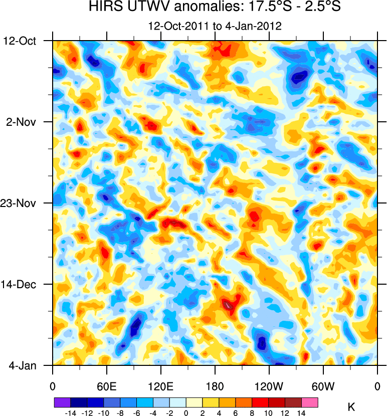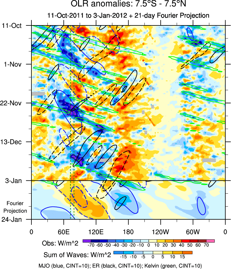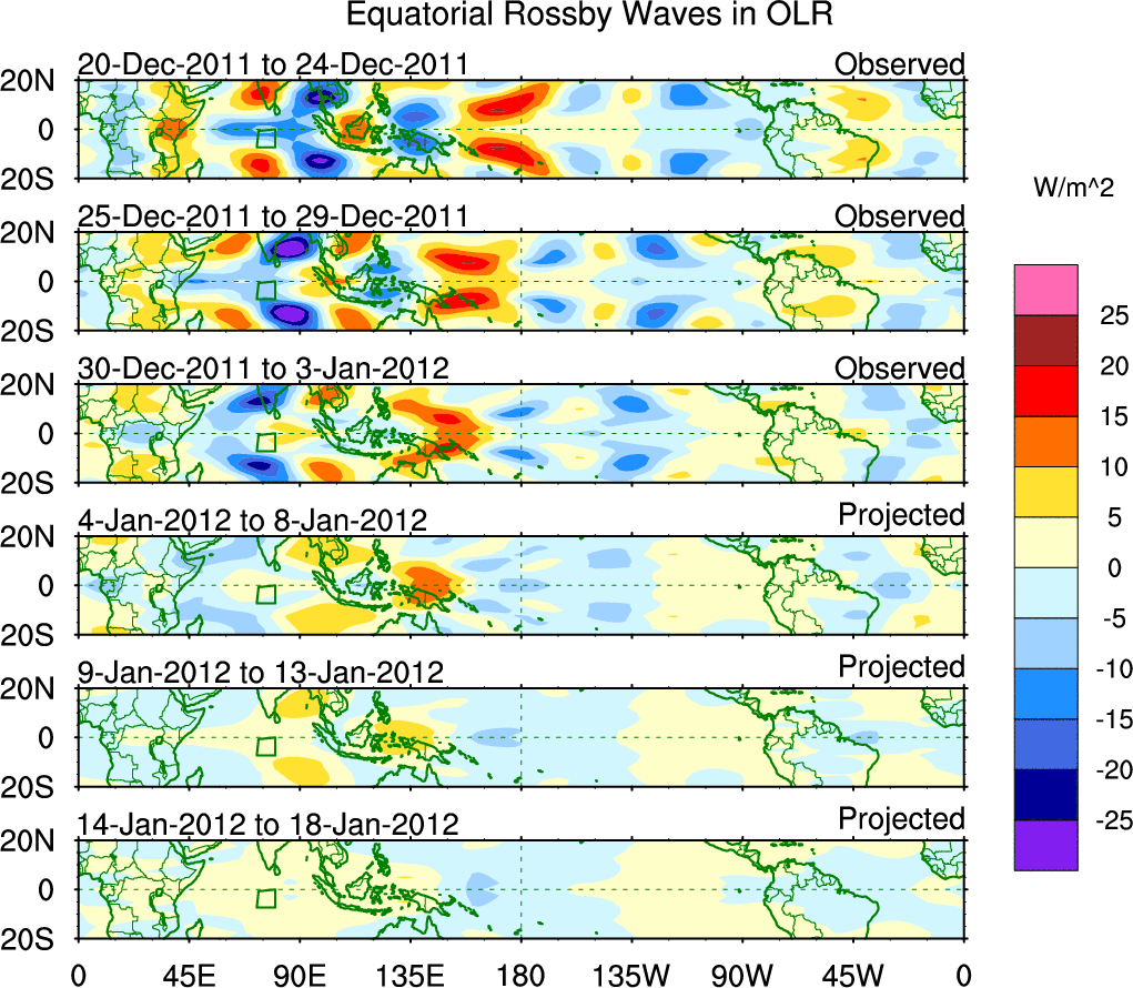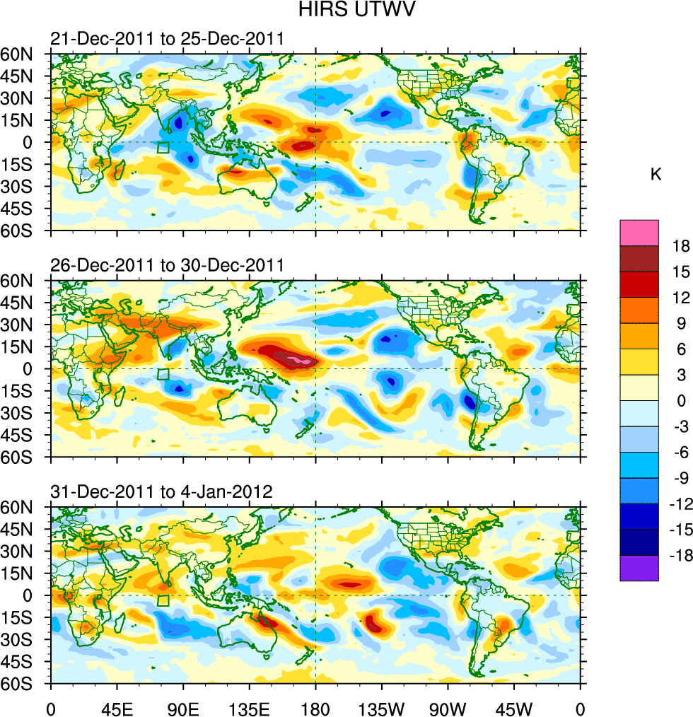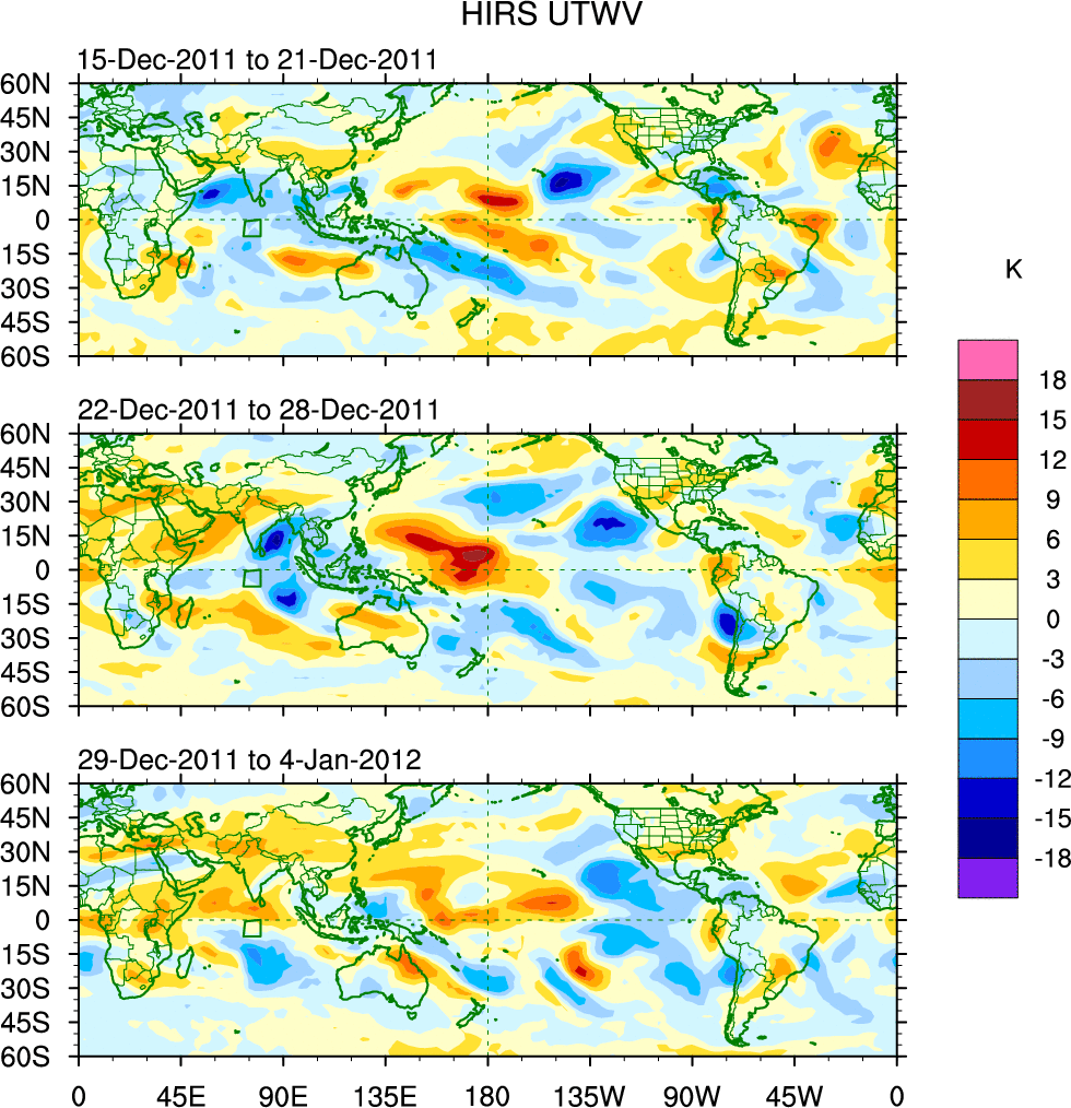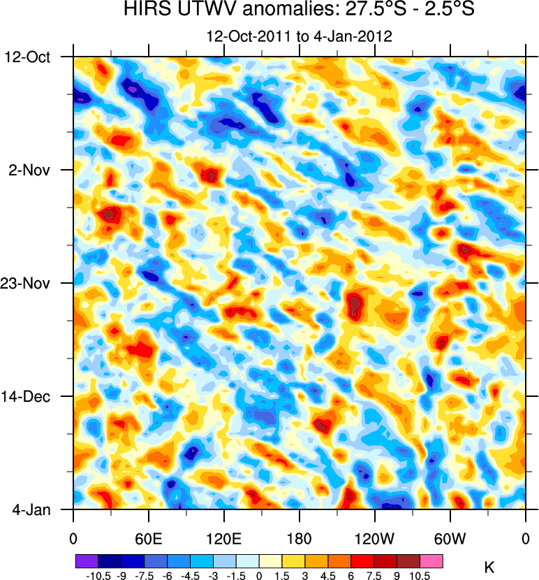 To identify tropical waves in near real-time, the OLR and UTWV data are filtered following Wheeler & Weickmann (2001 MWR). The daily anomalies are calculated using the first 3 harmonics of the seasonal cycle for 1979–2009. Missing values are then filled using linear interpolation in space and time. The most recent 365 days of anomalies are padded with 659 days of zeroes, and the result is filtered for each wave type.