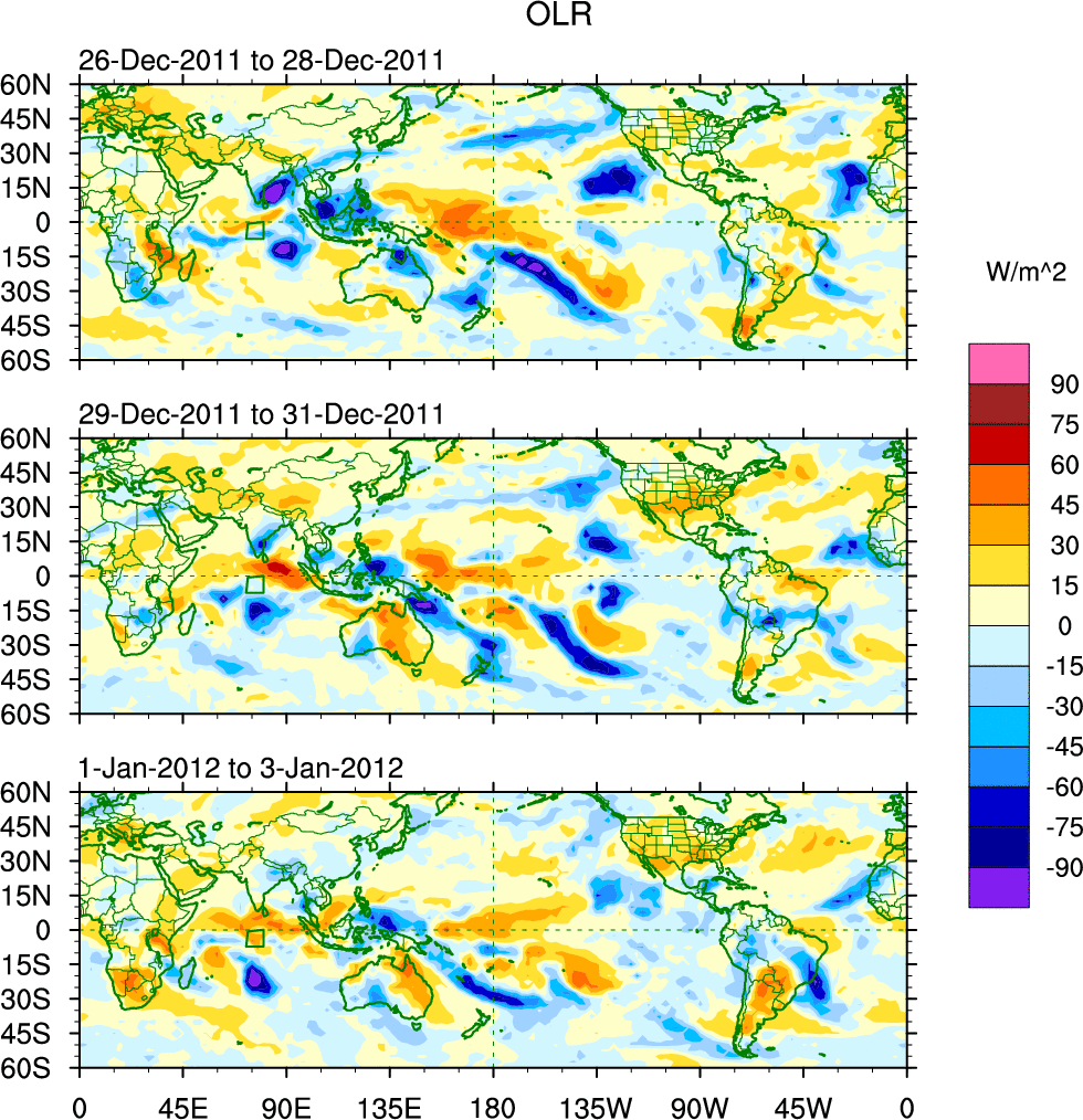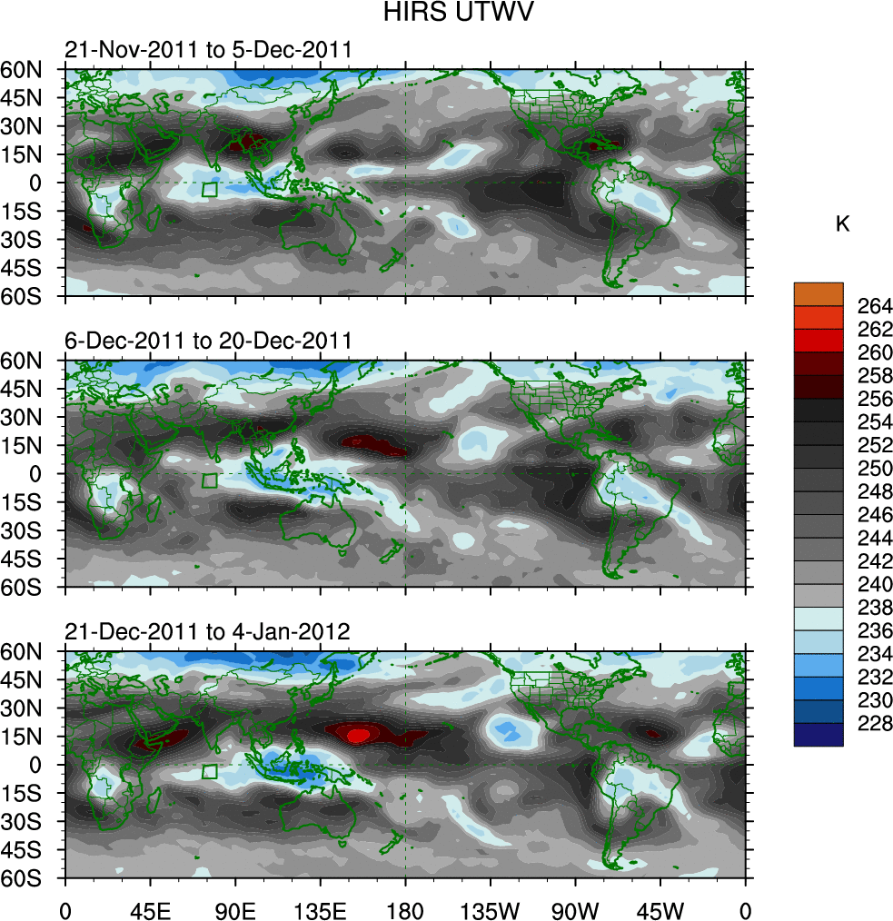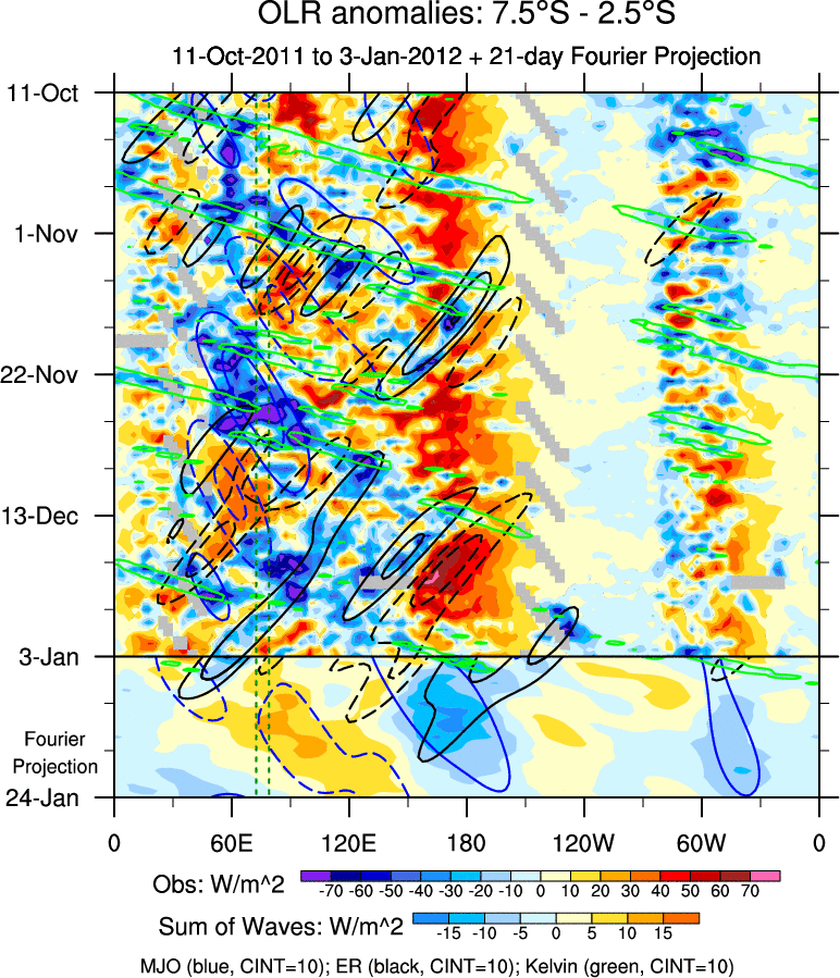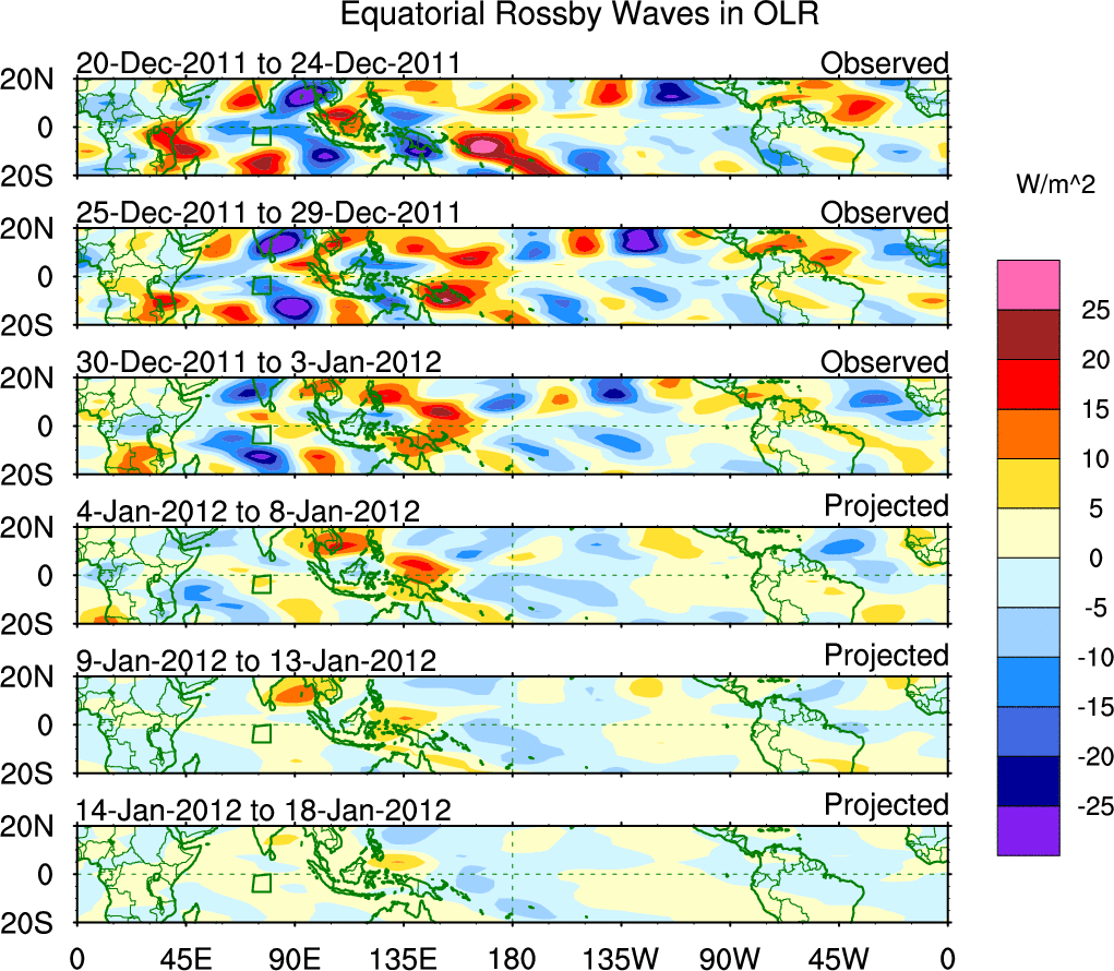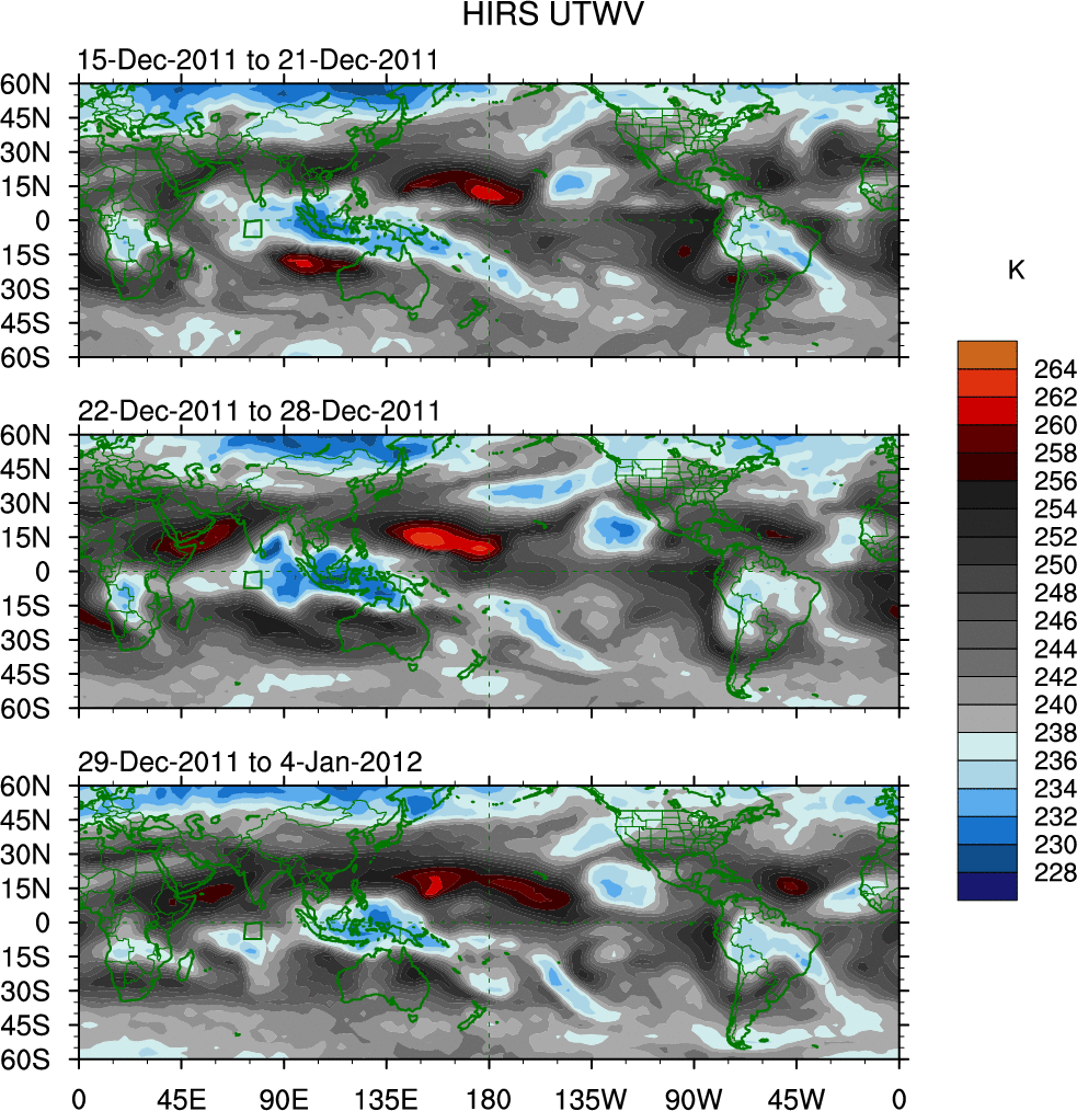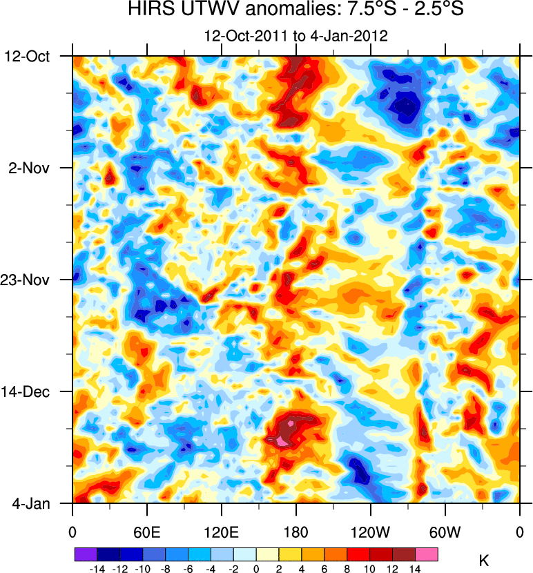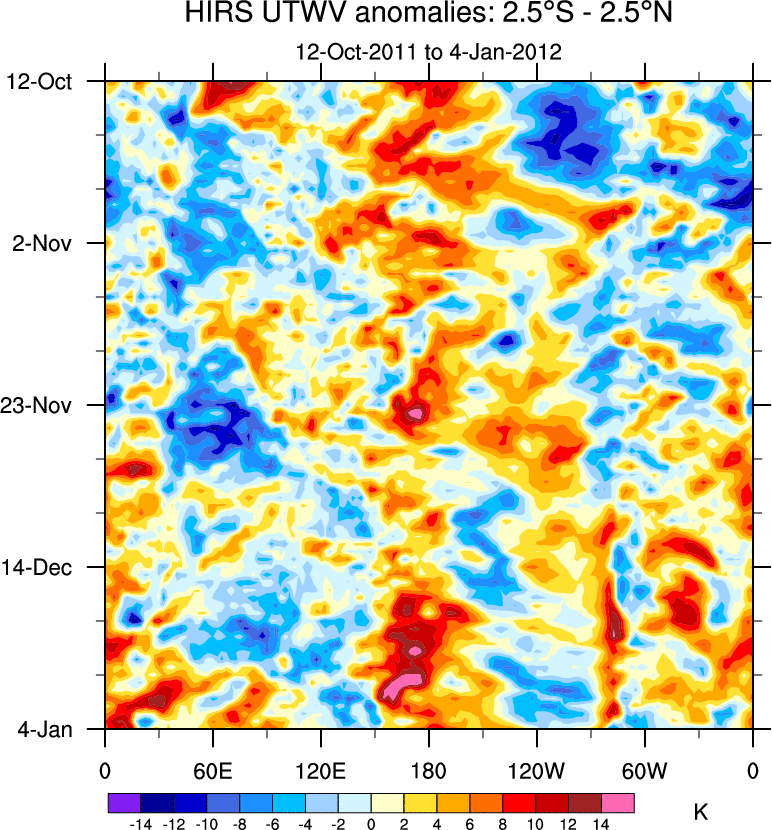 To identify tropical waves in near real-time, the OLR and UTWV data are filtered following Wheeler & Weickmann (2001 MWR). The daily anomalies are calculated using the first 3 harmonics of the seasonal cycle for 1979–2009. Missing values are then filled using linear interpolation in space and time. The most recent 365 days of anomalies are padded with 659 days of zeroes, and the result is filtered for each wave type.