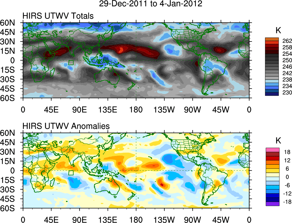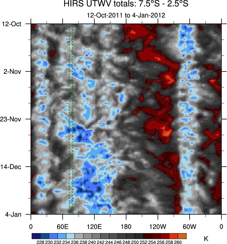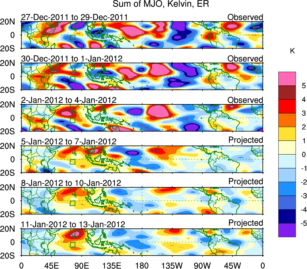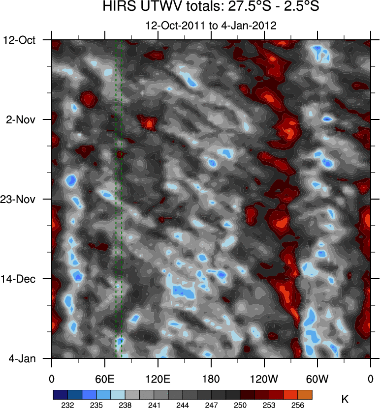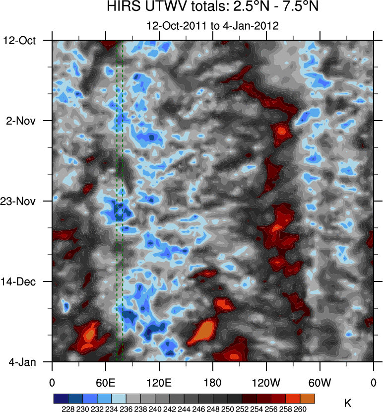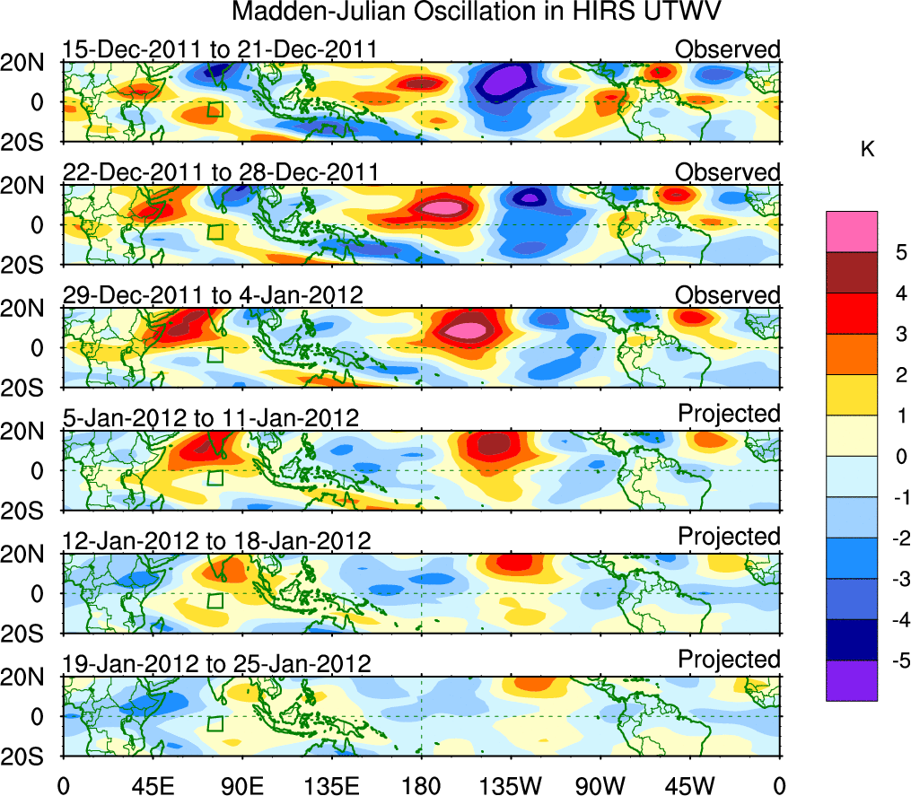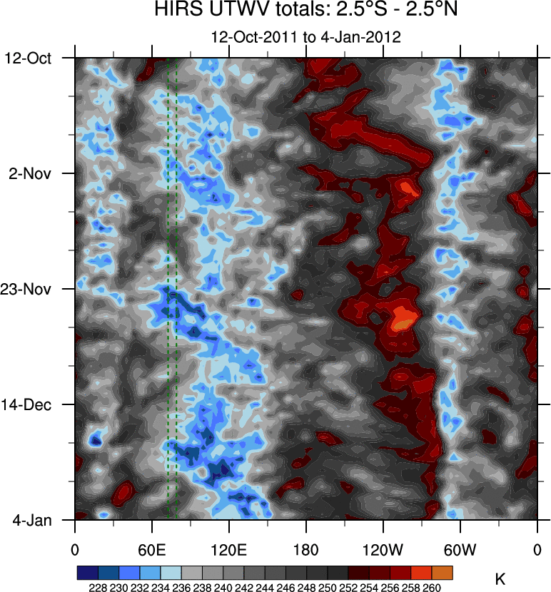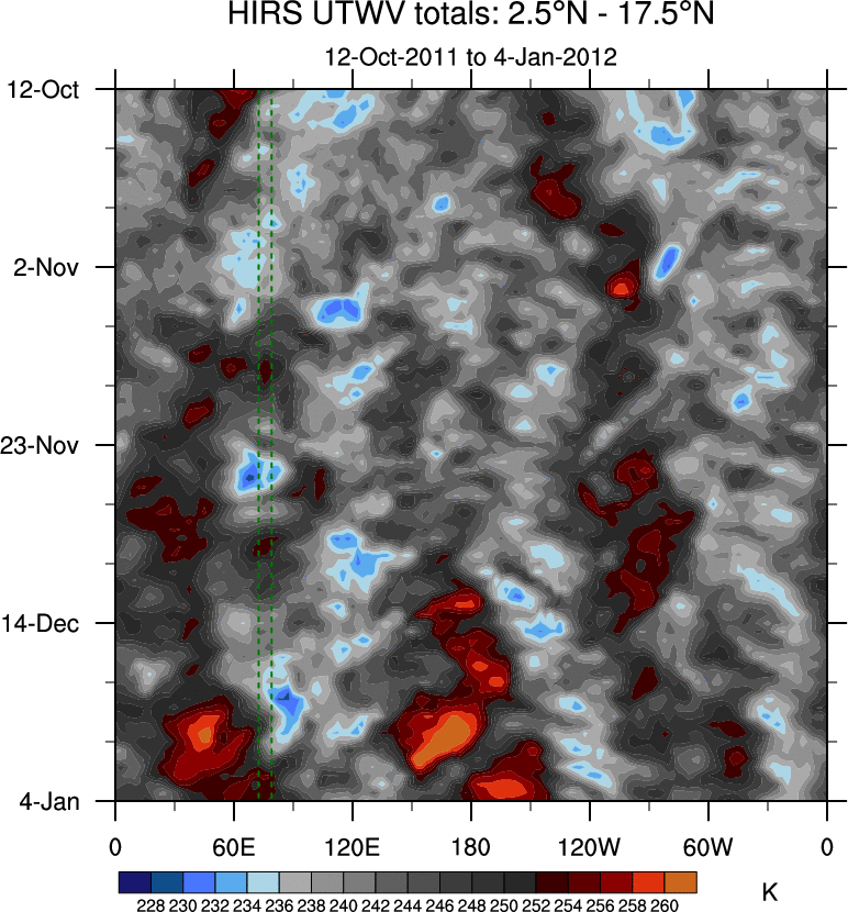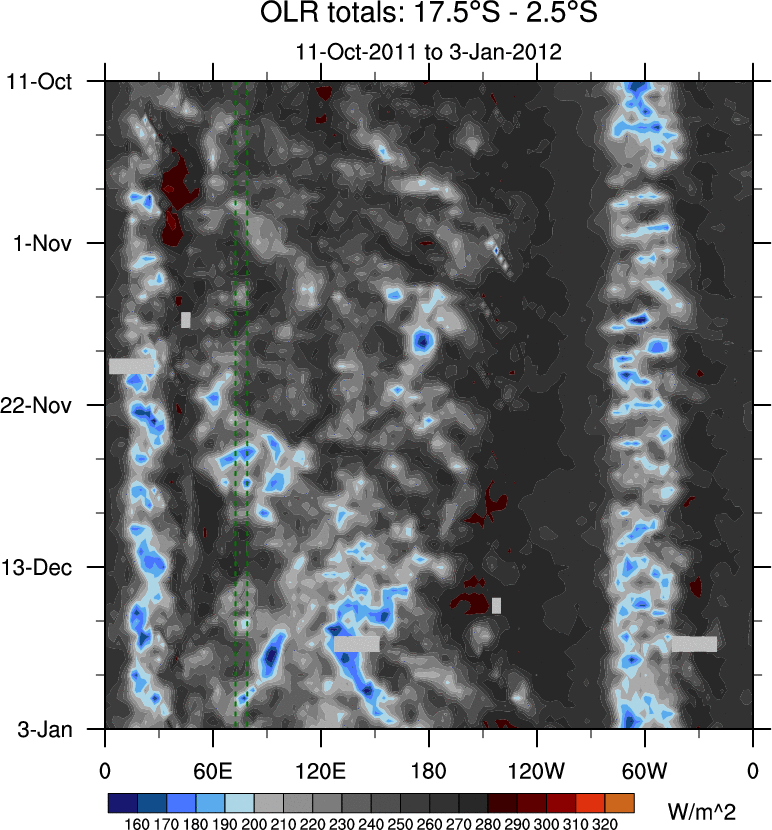 To identify tropical waves in near real-time, the OLR and UTWV data are filtered following Wheeler & Weickmann (2001 MWR). The daily anomalies are calculated using the first 3 harmonics of the seasonal cycle for 1979–2009. Missing values are then filled using linear interpolation in space and time. The most recent 365 days of anomalies are padded with 659 days of zeroes, and the result is filtered for each wave type.