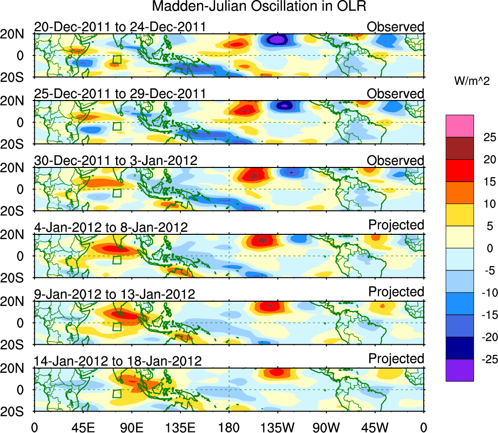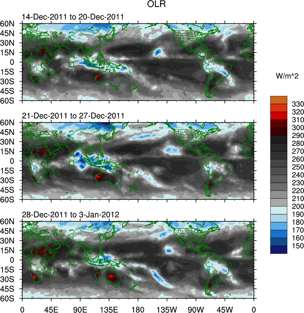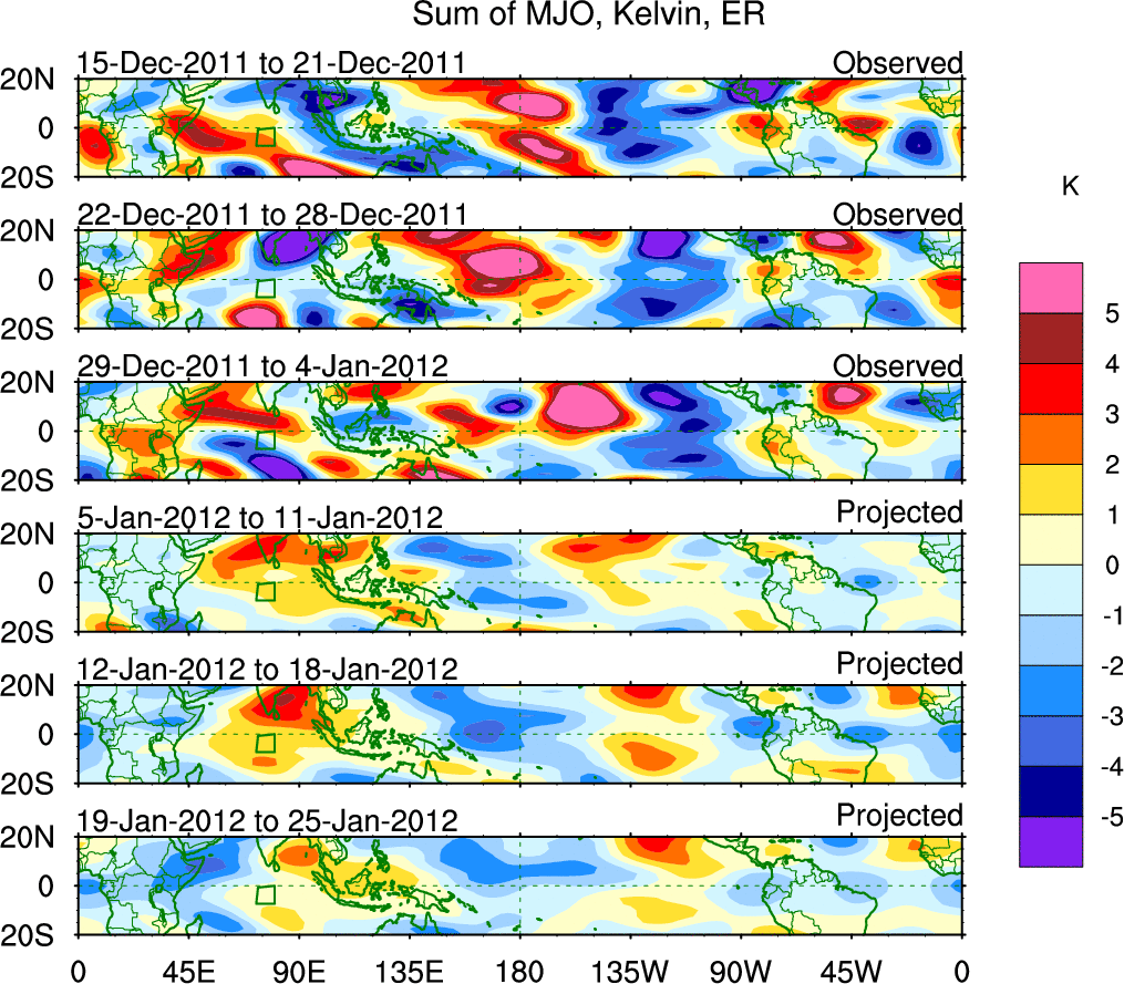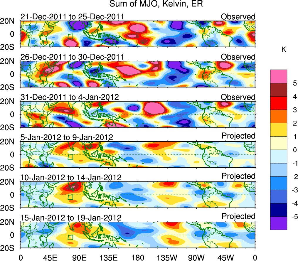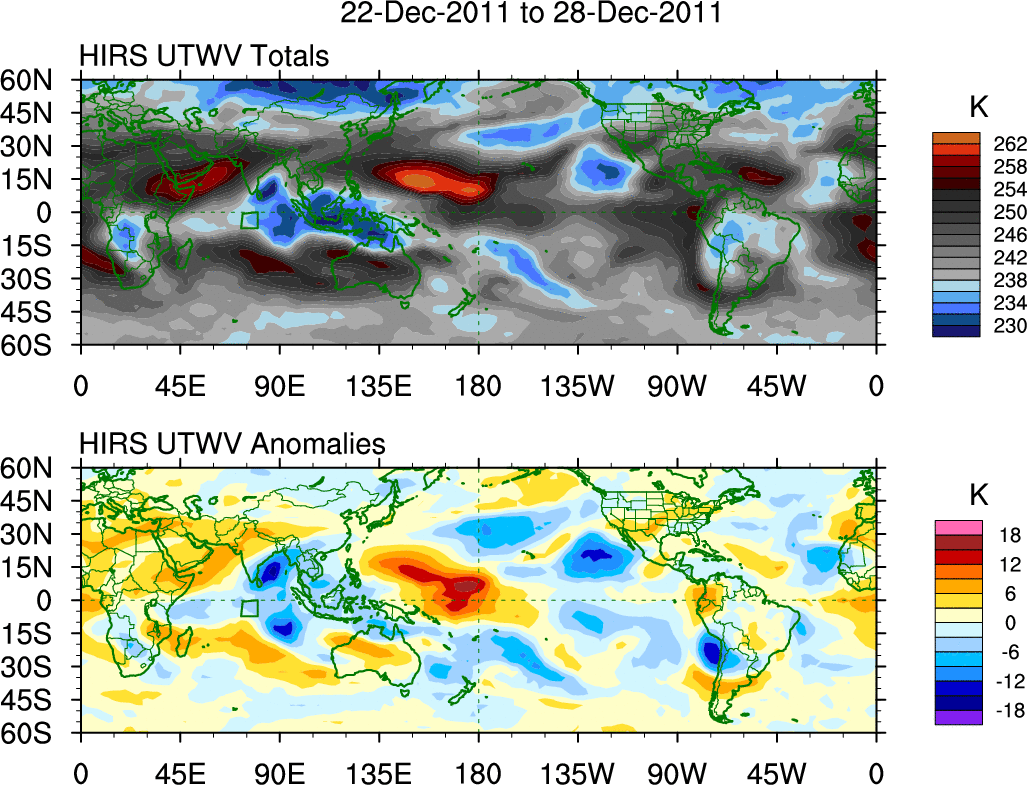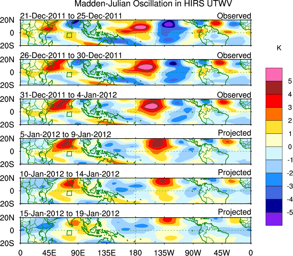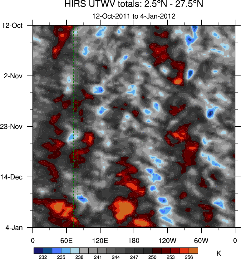 To identify tropical waves in near real-time, the OLR and UTWV data are filtered following Wheeler & Weickmann (2001 MWR). The daily anomalies are calculated using the first 3 harmonics of the seasonal cycle for 1979–2009. Missing values are then filled using linear interpolation in space and time. The most recent 365 days of anomalies are padded with 659 days of zeroes, and the result is filtered for each wave type.