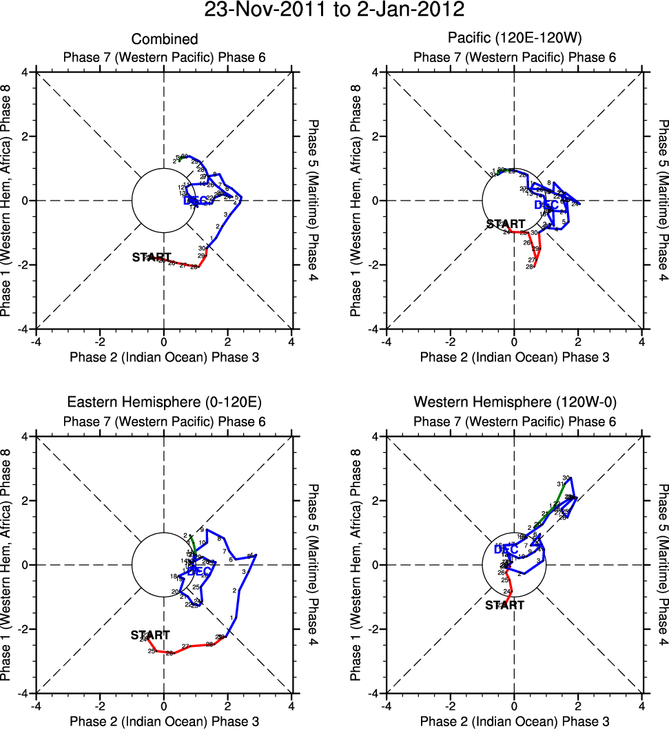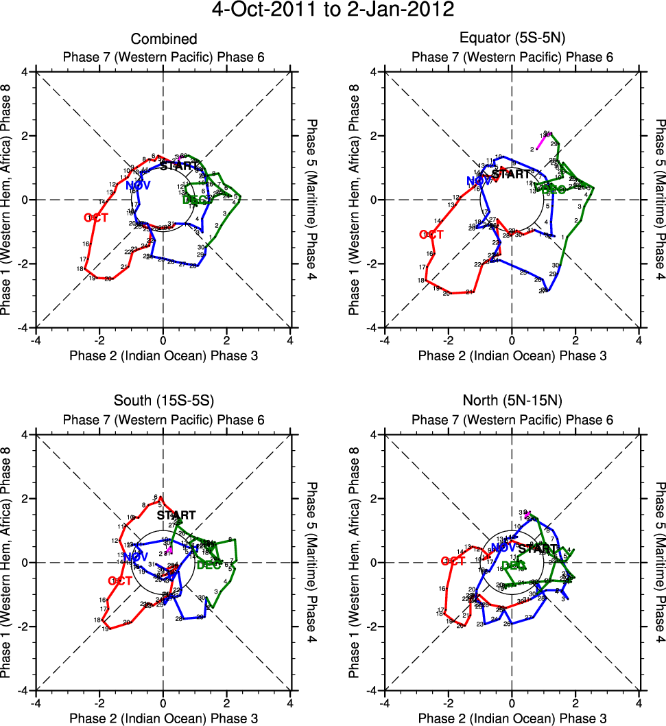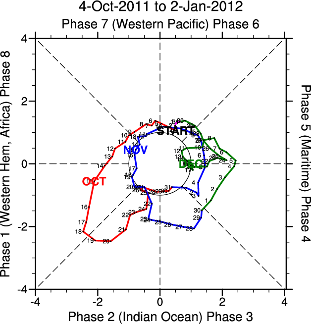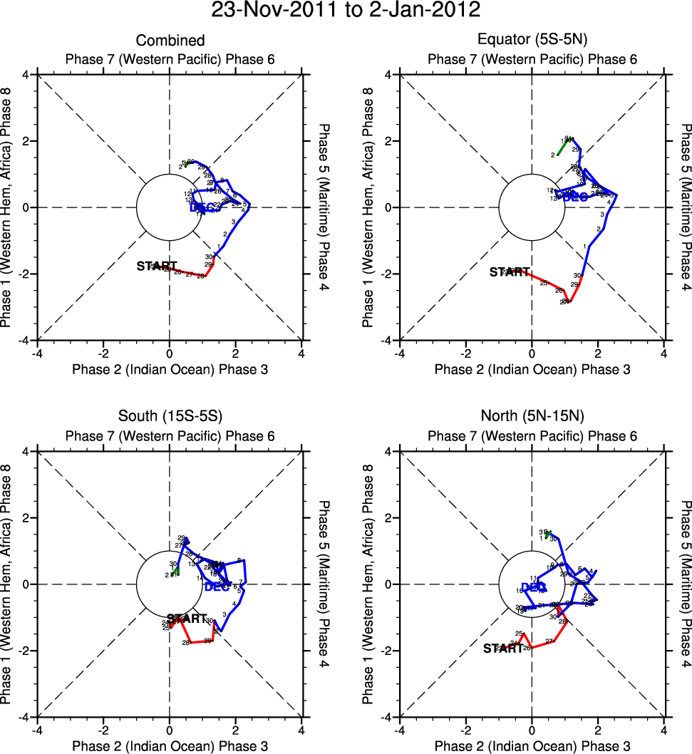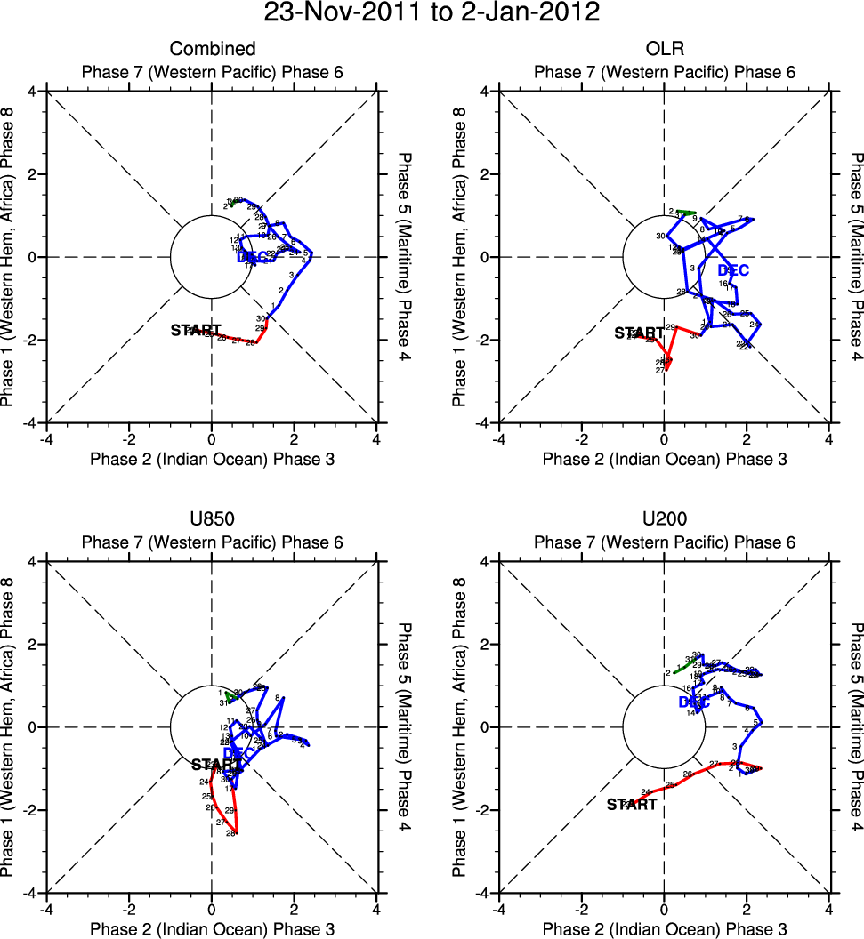 Wheeler and Hendon (2004) constructed the RMM index for monitoring the MJO. This index consists of the first two principal components (PCs) of OLR, 850-hPa zonal wind, and 200-hPa zonal wind averaged 15S-15N.