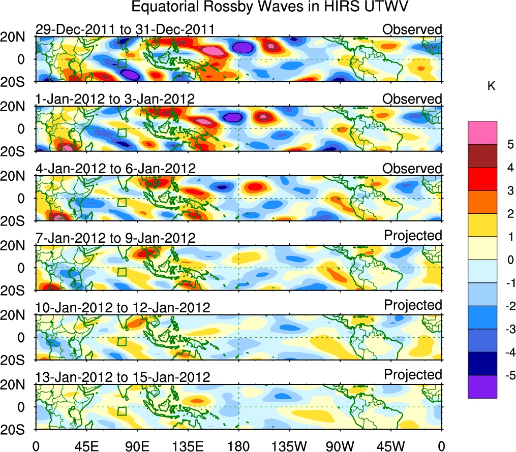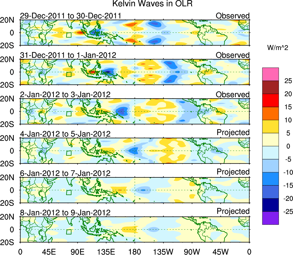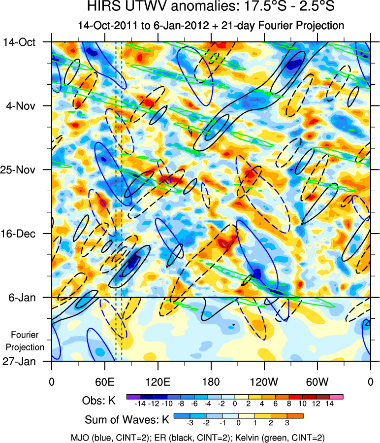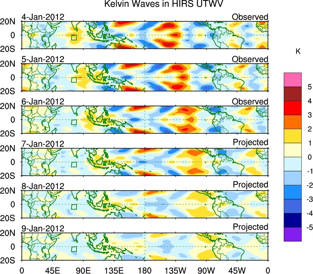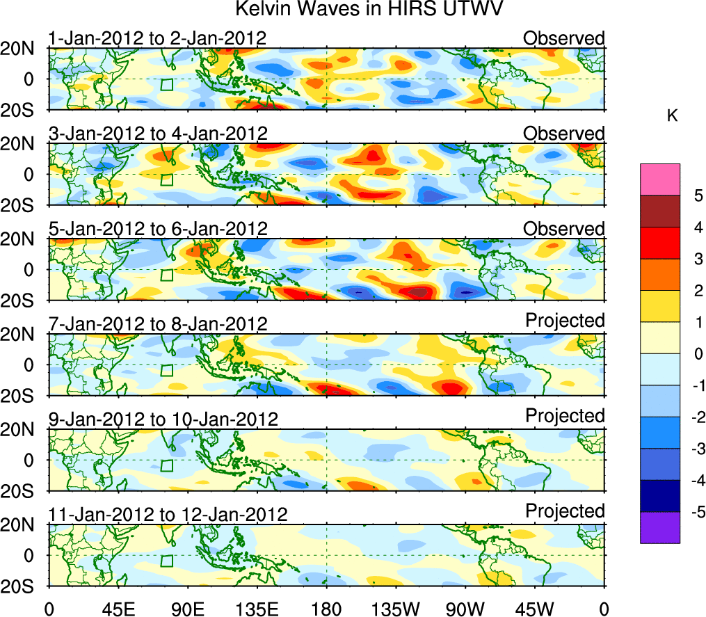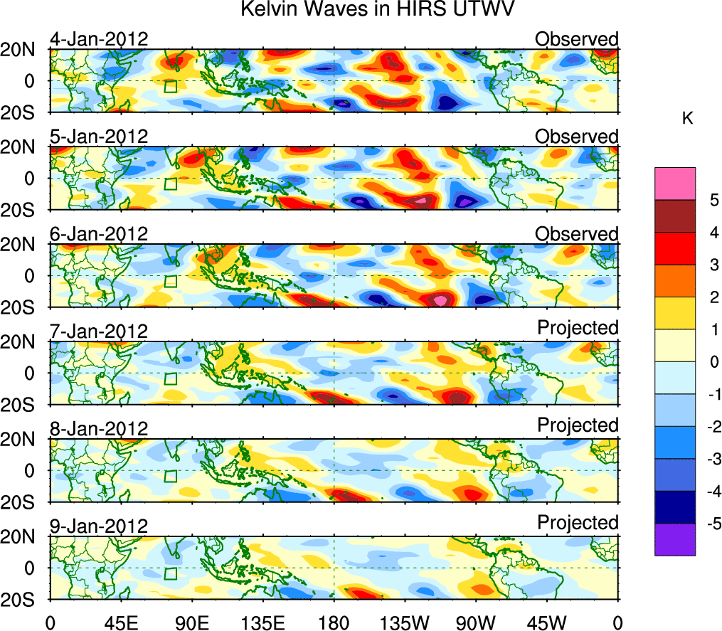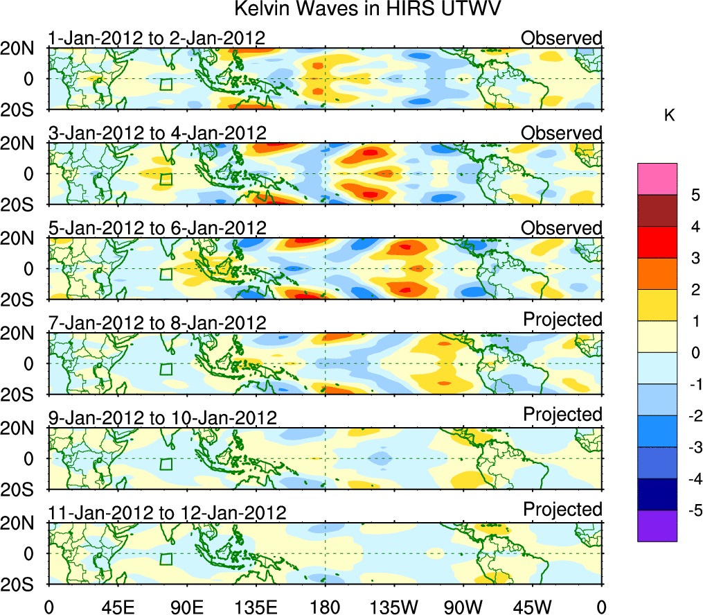 To identify tropical waves in near real-time, the OLR and UTWV data are filtered following Wheeler & Weickmann (2001 MWR). The daily anomalies are calculated using the first 3 harmonics of the seasonal cycle for 1979–2009. Missing values are then filled using linear interpolation in space and time. The most recent 365 days of anomalies are padded with 659 days of zeroes, and the result is filtered for each wave type.