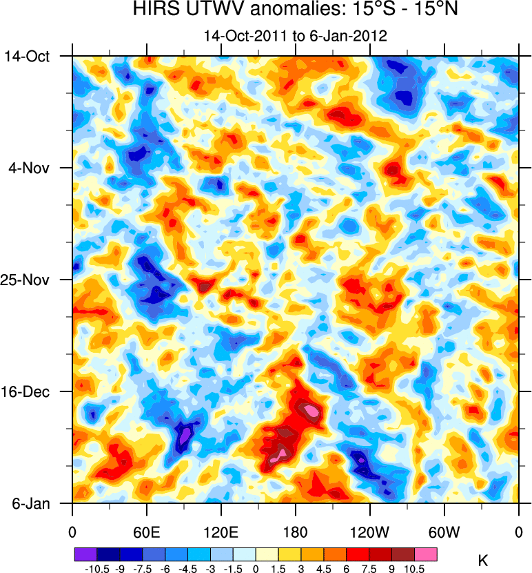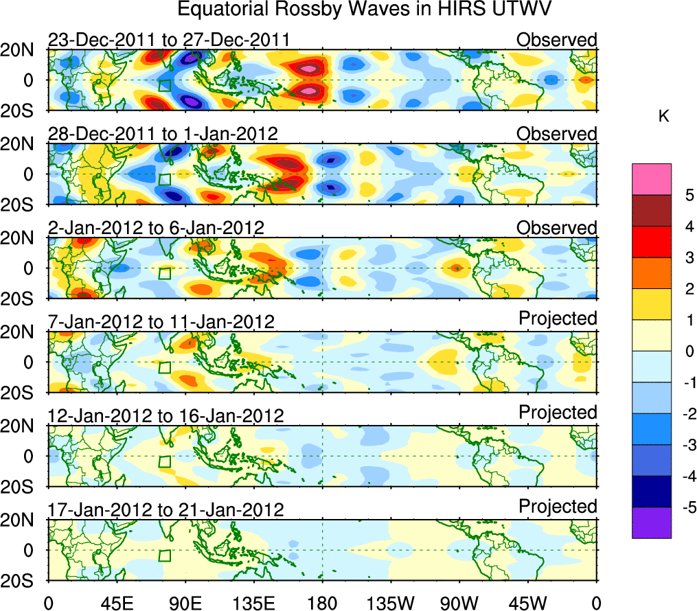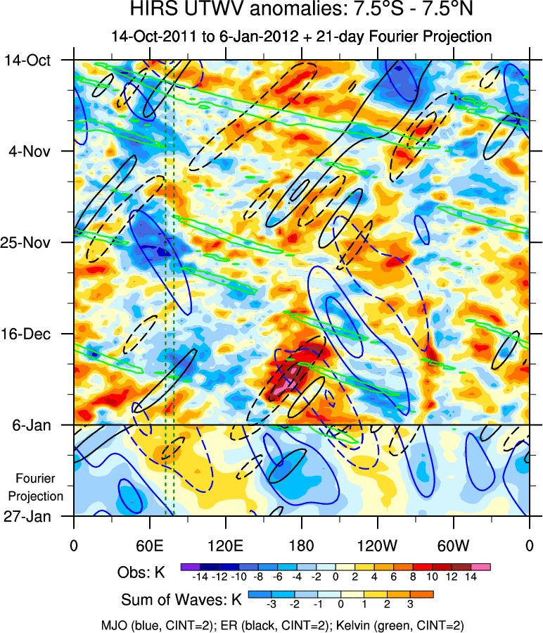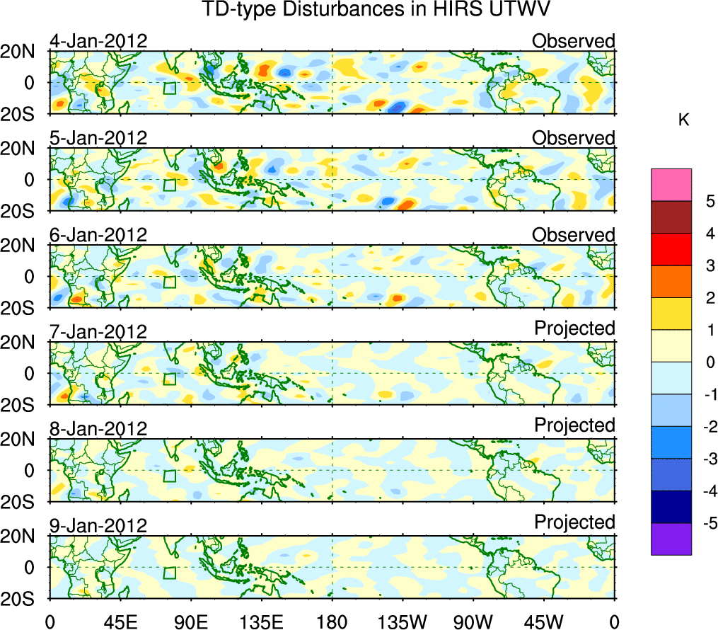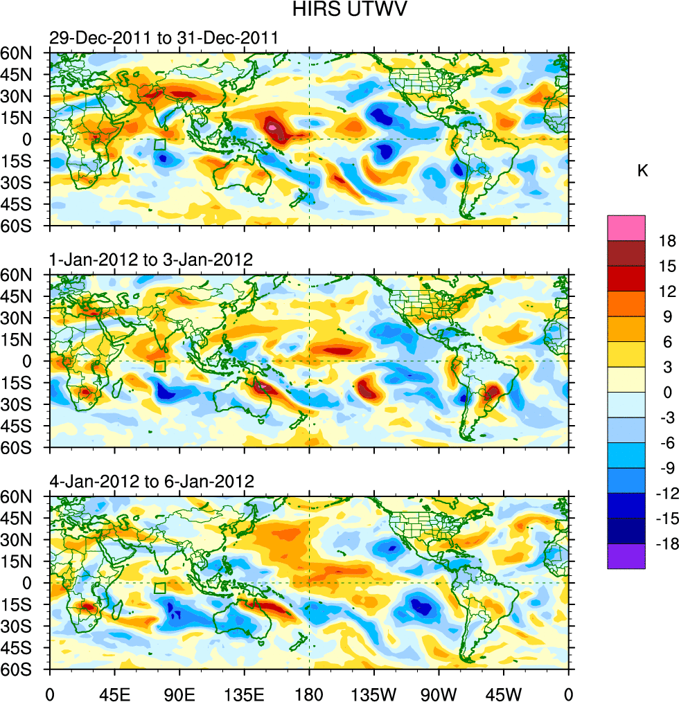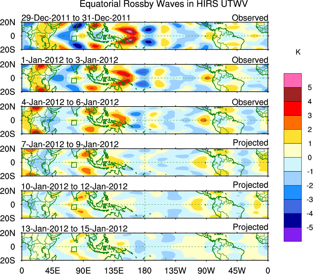 To identify tropical waves in near real-time, the OLR and UTWV data are filtered following Wheeler & Weickmann (2001 MWR). The daily anomalies are calculated using the first 3 harmonics of the seasonal cycle for 1979–2009. Missing values are then filled using linear interpolation in space and time. The most recent 365 days of anomalies are padded with 659 days of zeroes, and the result is filtered for each wave type.