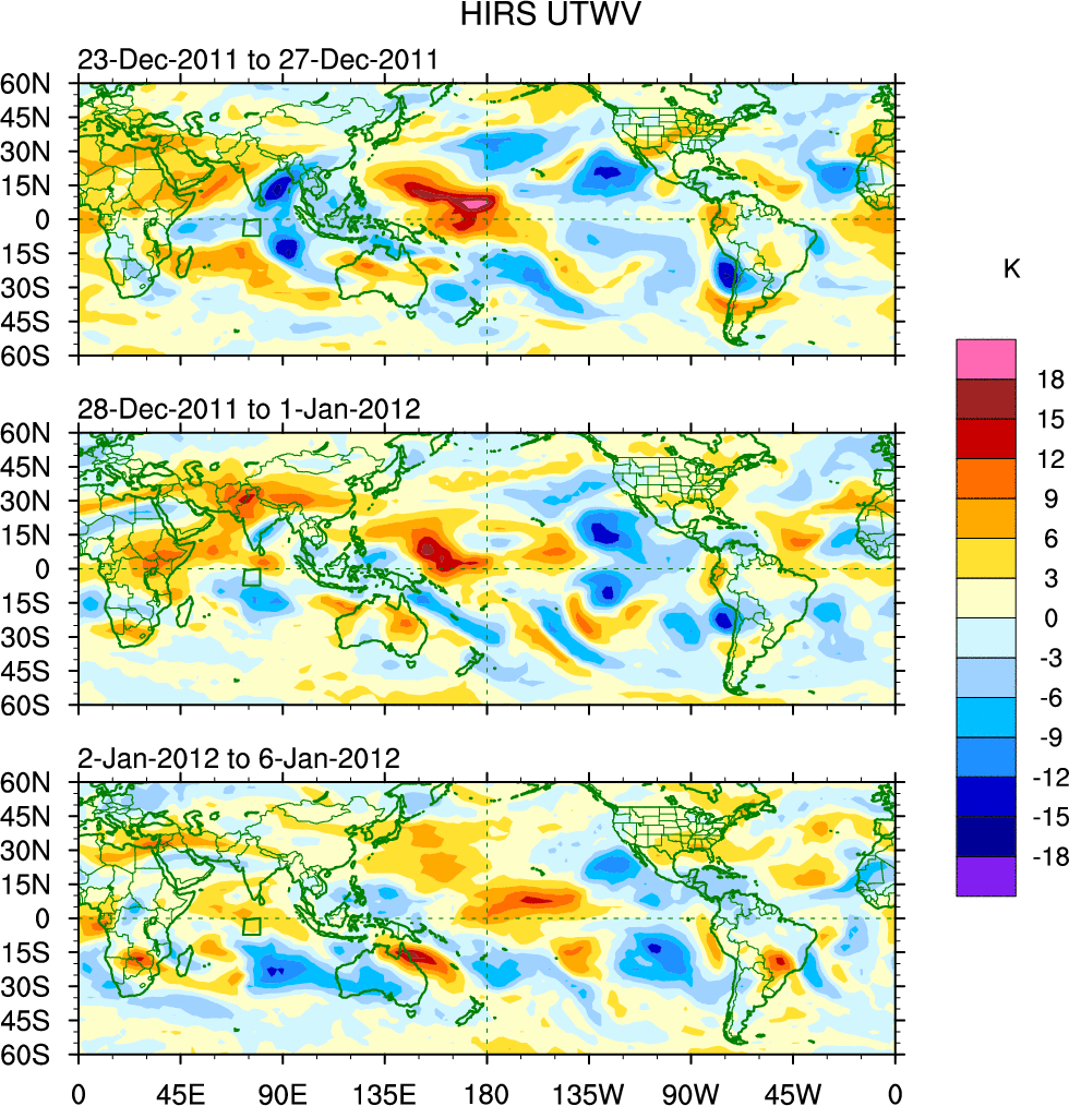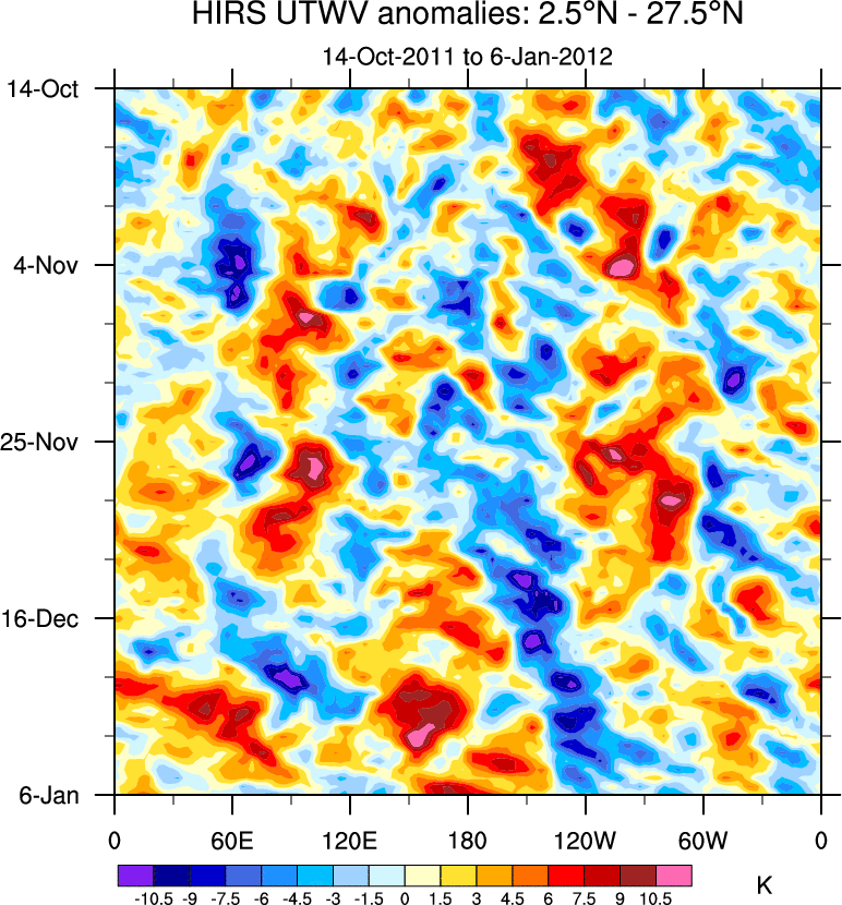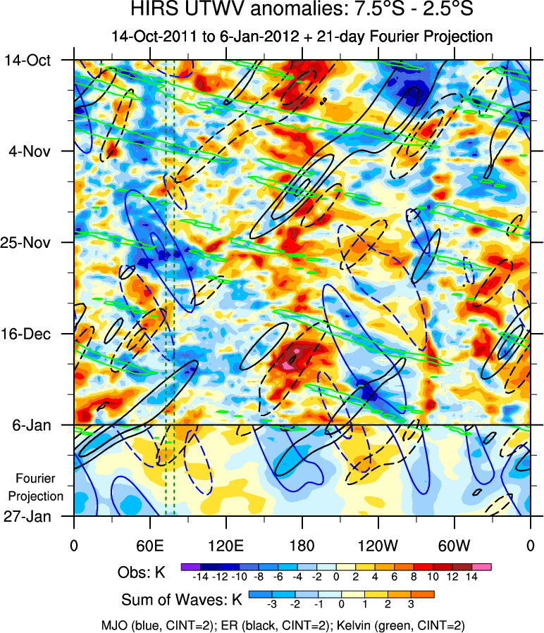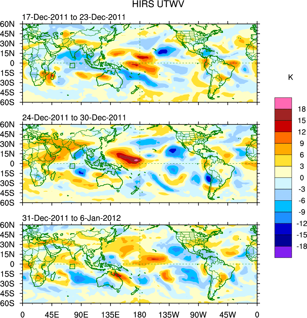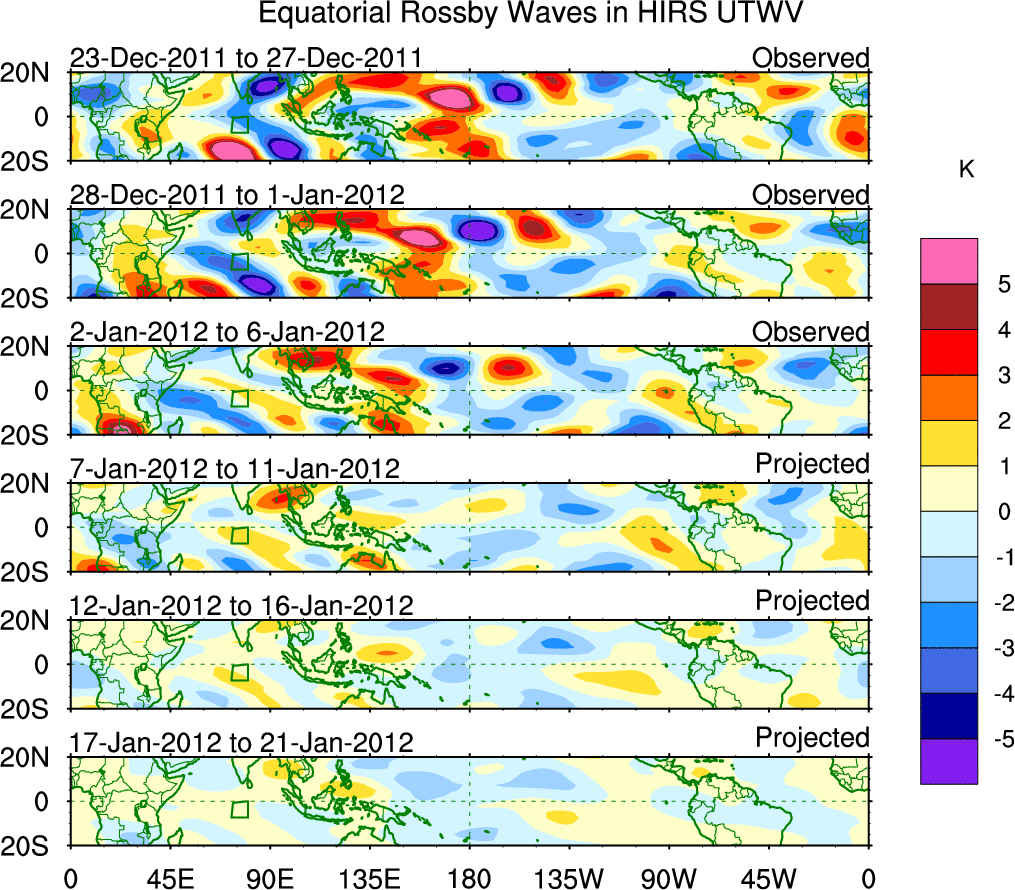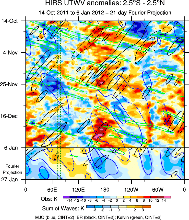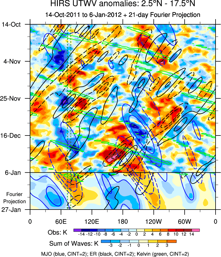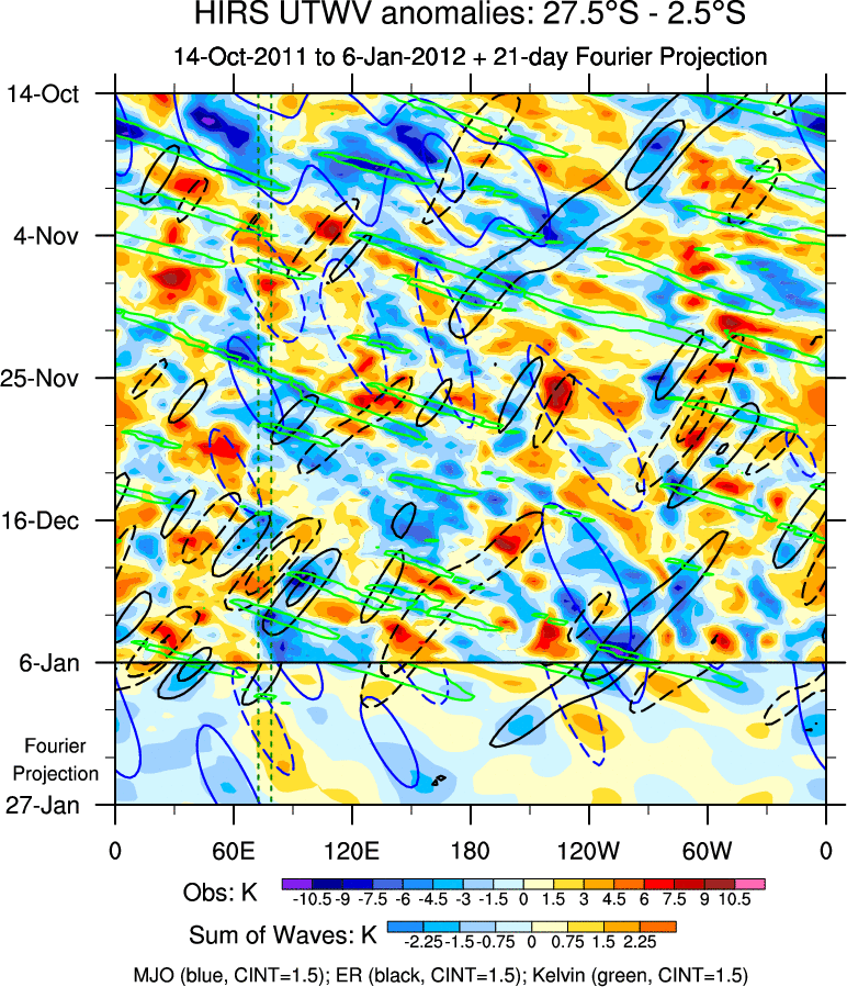To identify tropical waves in near real-time, the OLR and UTWV data are filtered following Wheeler & Weickmann (2001 MWR). The daily anomalies are calculated using the first 3 harmonics of the seasonal cycle for 1979–2009. Missing values are then filled using linear interpolation in space and time. The most recent 365 days of anomalies are padded with 659 days of zeroes, and the result is filtered for each wave type.