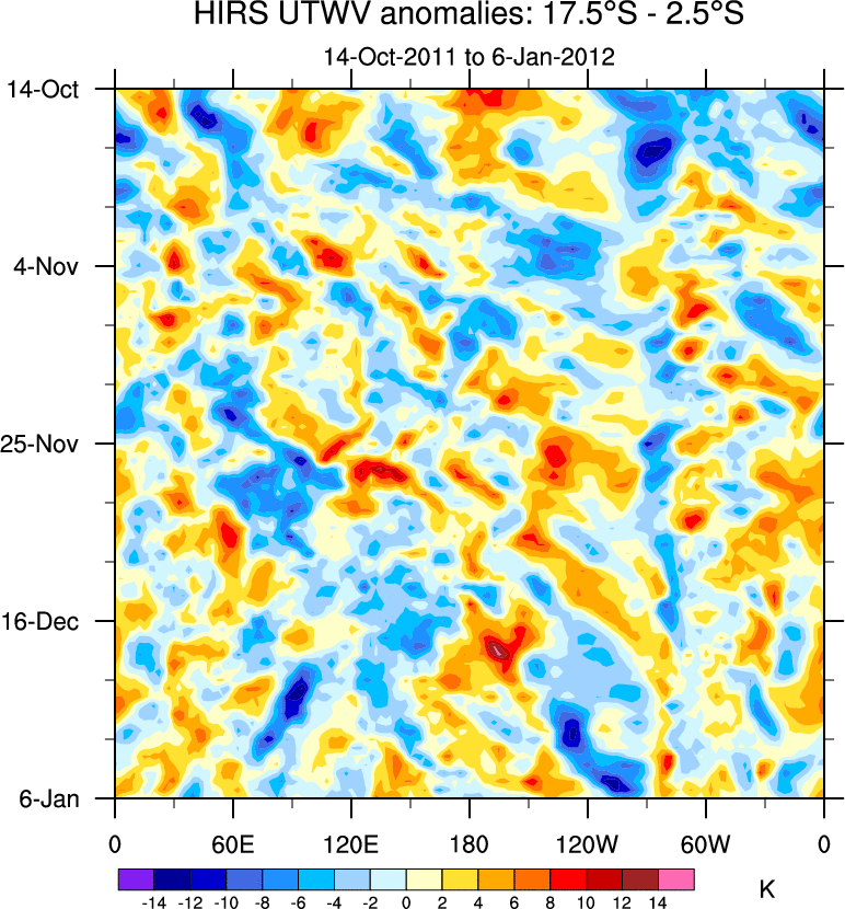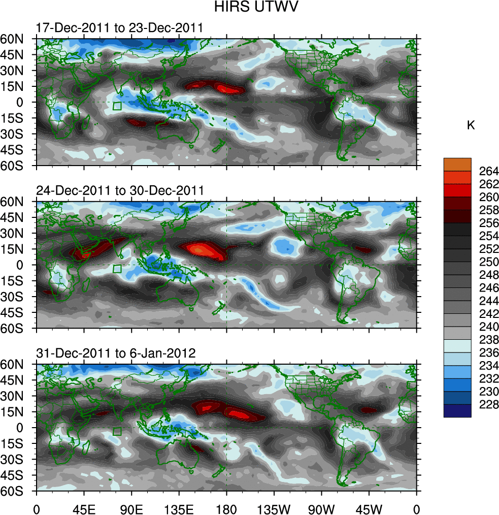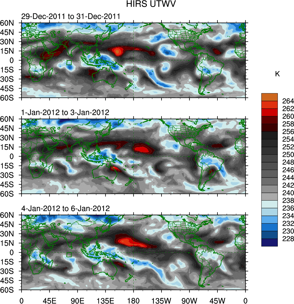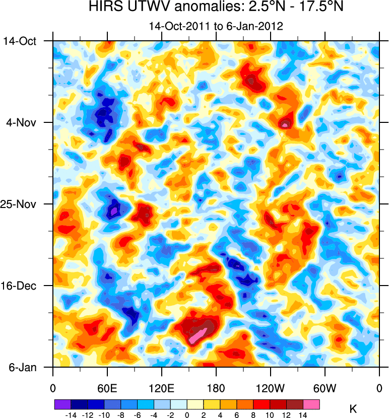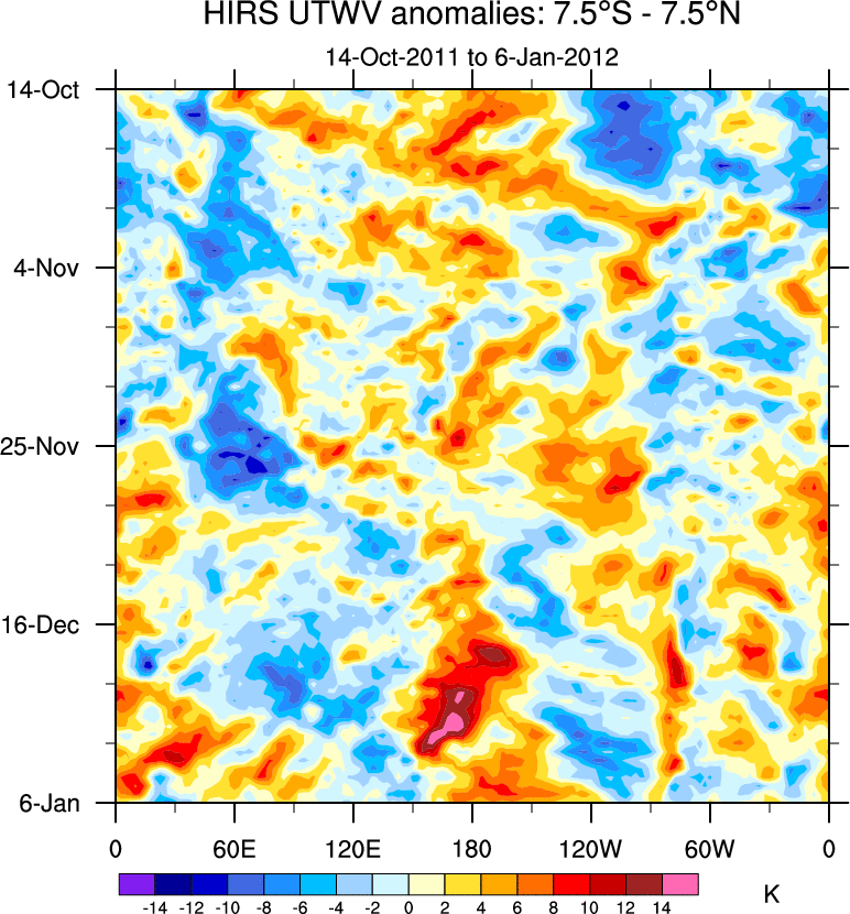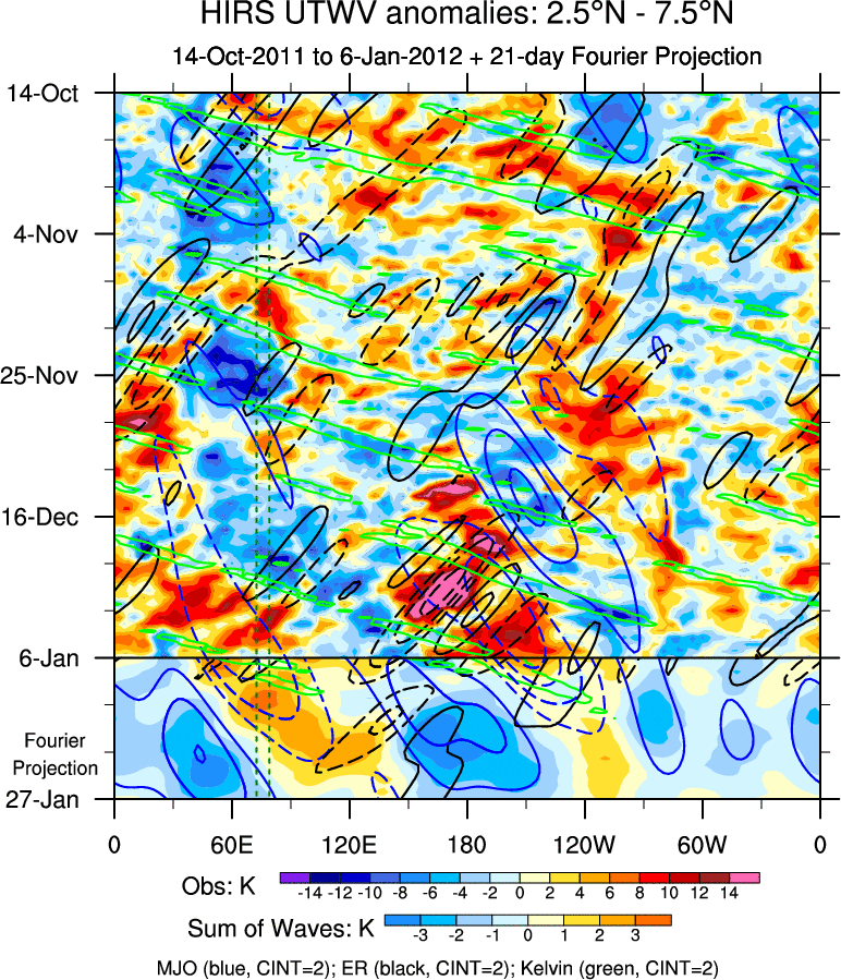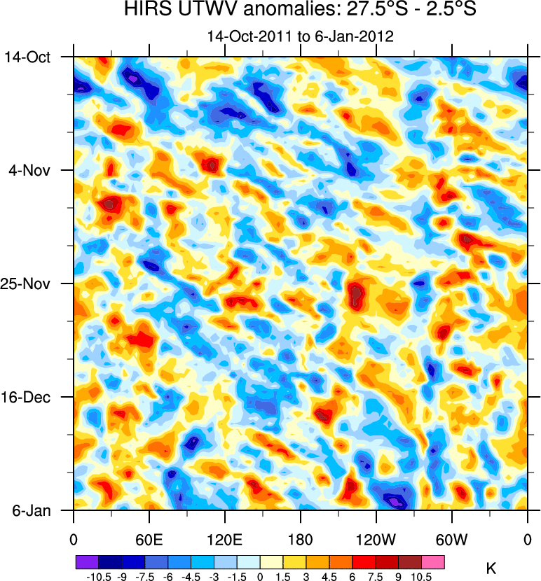 To identify tropical waves in near real-time, the OLR and UTWV data are filtered following Wheeler & Weickmann (2001 MWR). The daily anomalies are calculated using the first 3 harmonics of the seasonal cycle for 1979–2009. Missing values are then filled using linear interpolation in space and time. The most recent 365 days of anomalies are padded with 659 days of zeroes, and the result is filtered for each wave type.