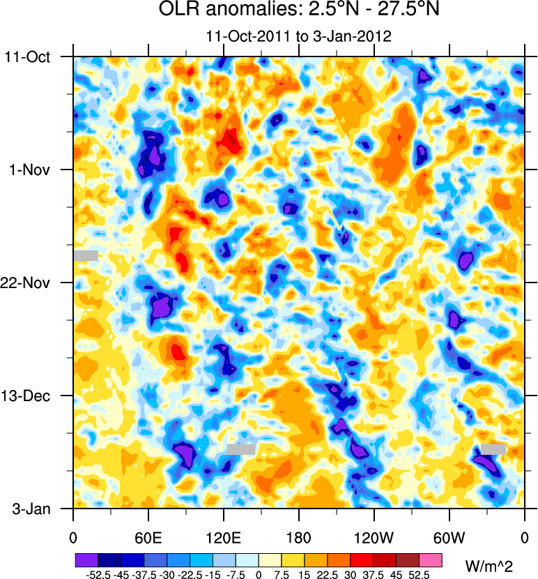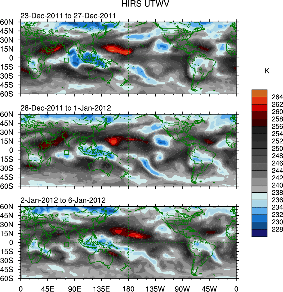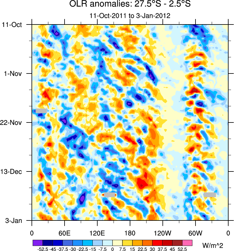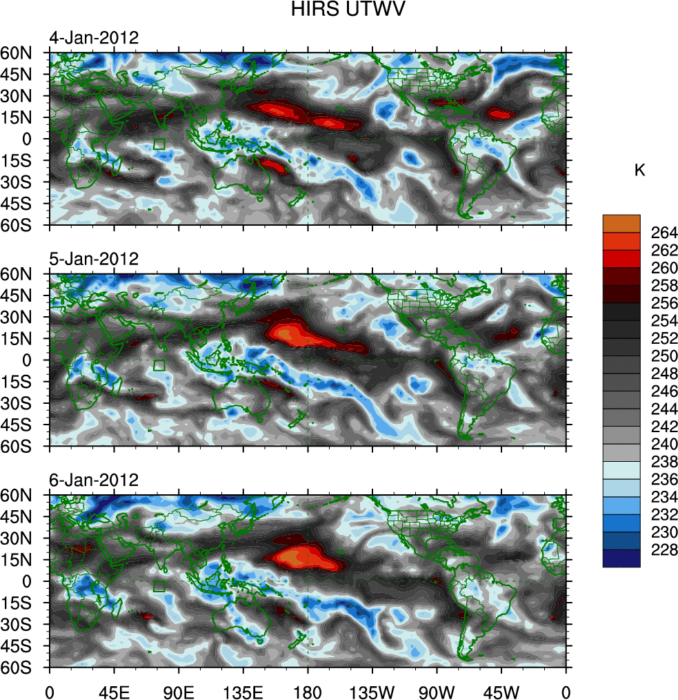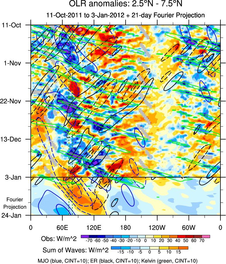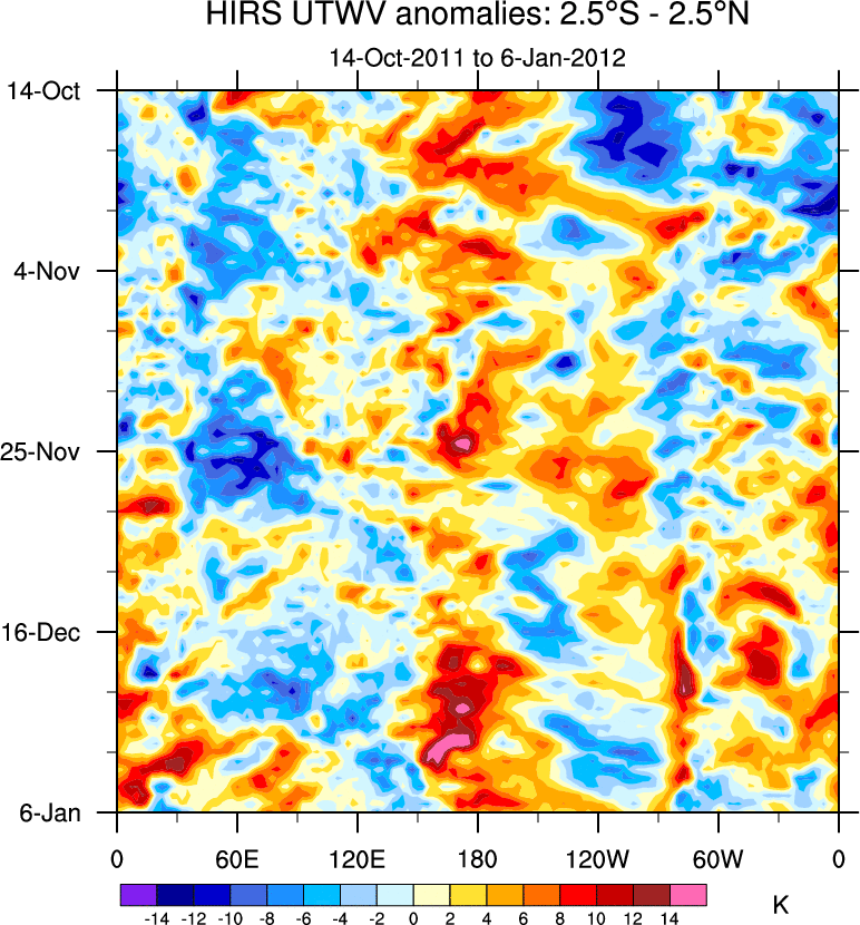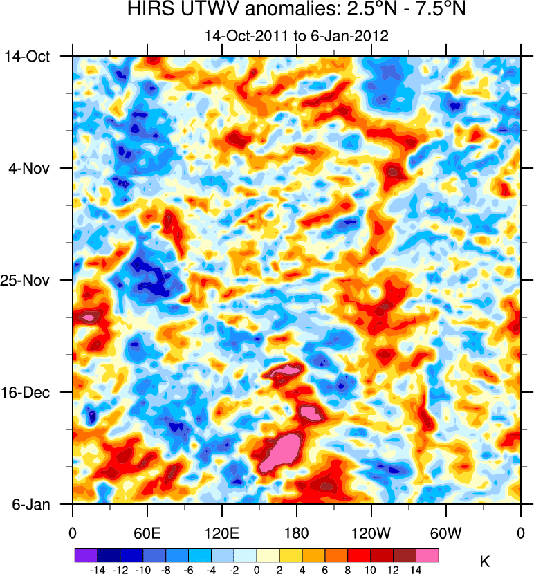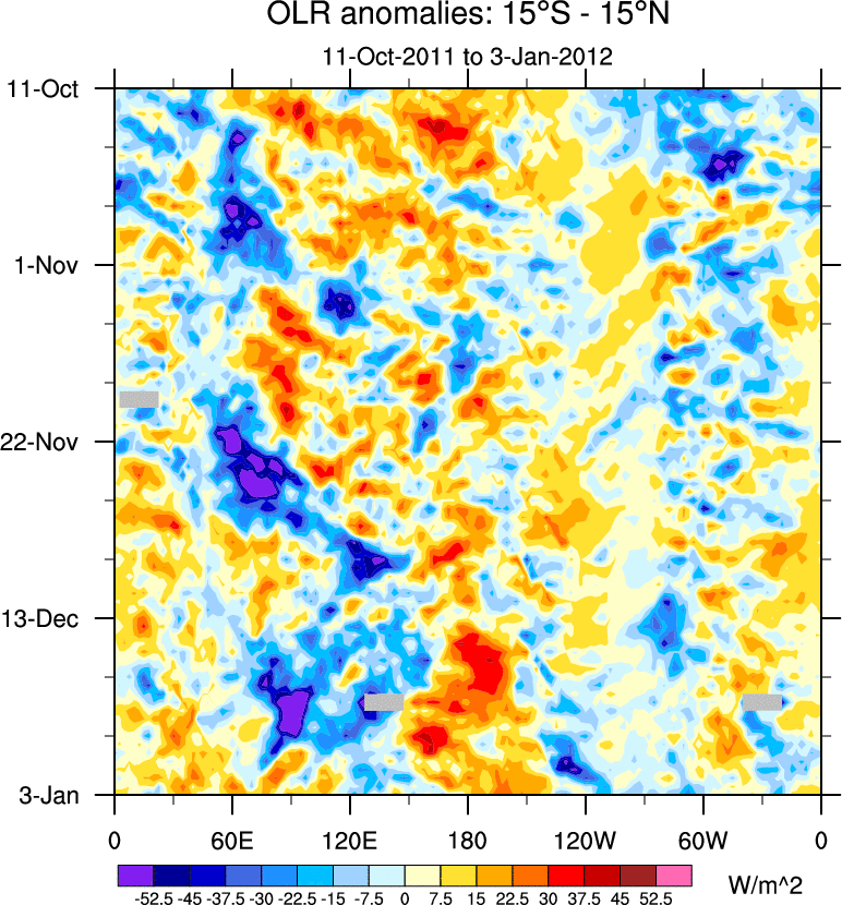 To identify tropical waves in near real-time, the OLR and UTWV data are filtered following Wheeler & Weickmann (2001 MWR). The daily anomalies are calculated using the first 3 harmonics of the seasonal cycle for 1979–2009. Missing values are then filled using linear interpolation in space and time. The most recent 365 days of anomalies are padded with 659 days of zeroes, and the result is filtered for each wave type.