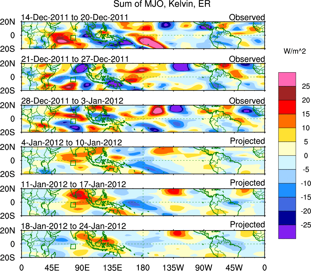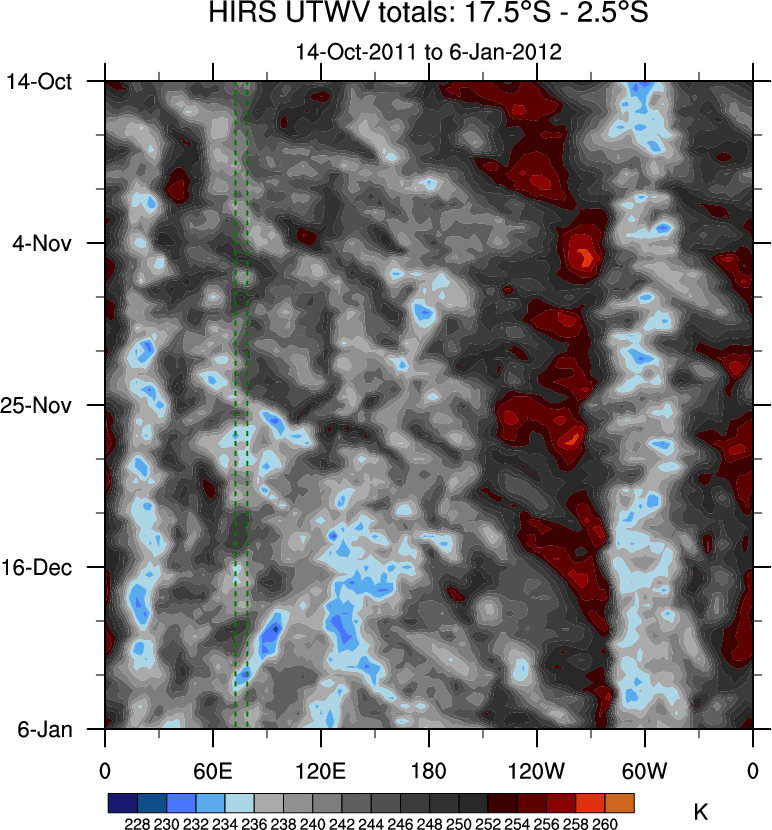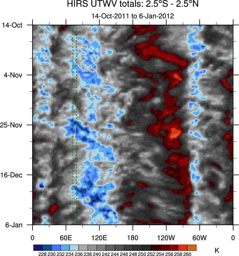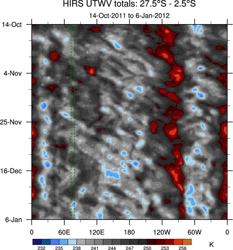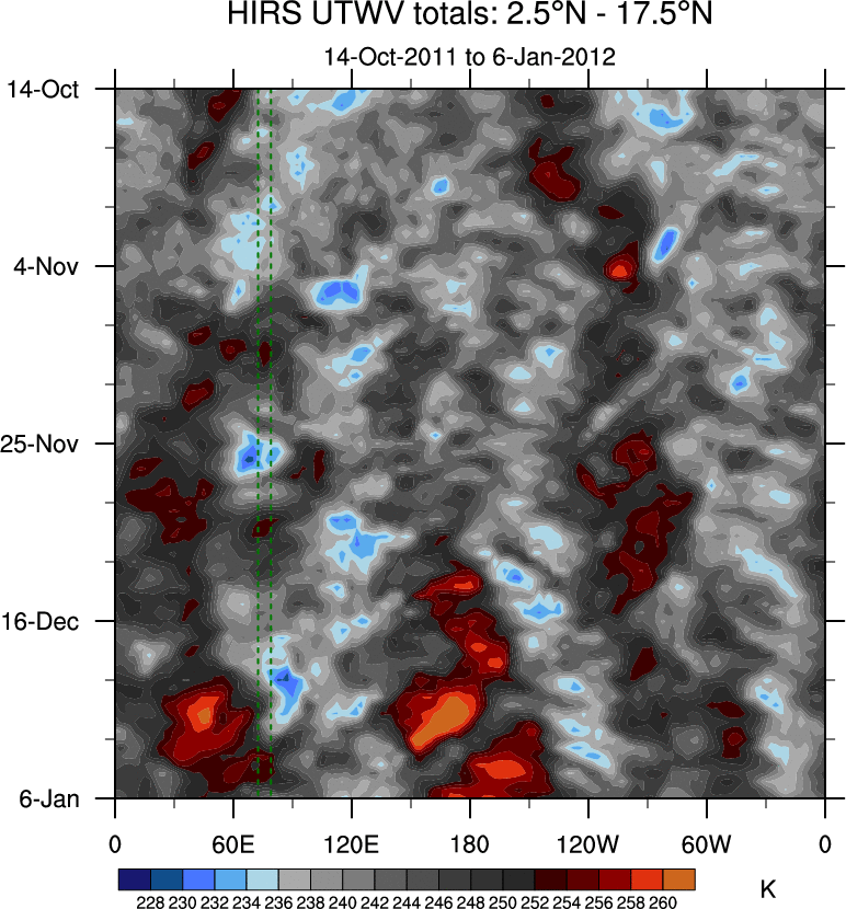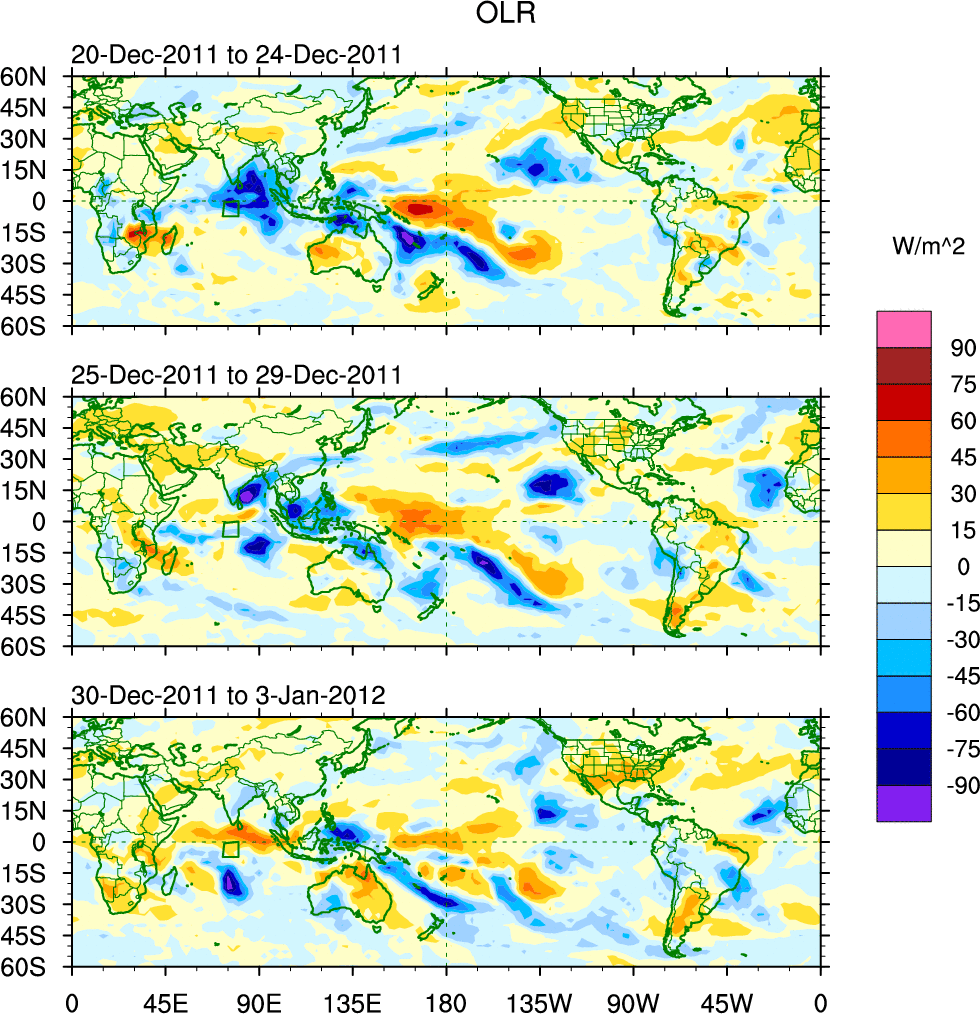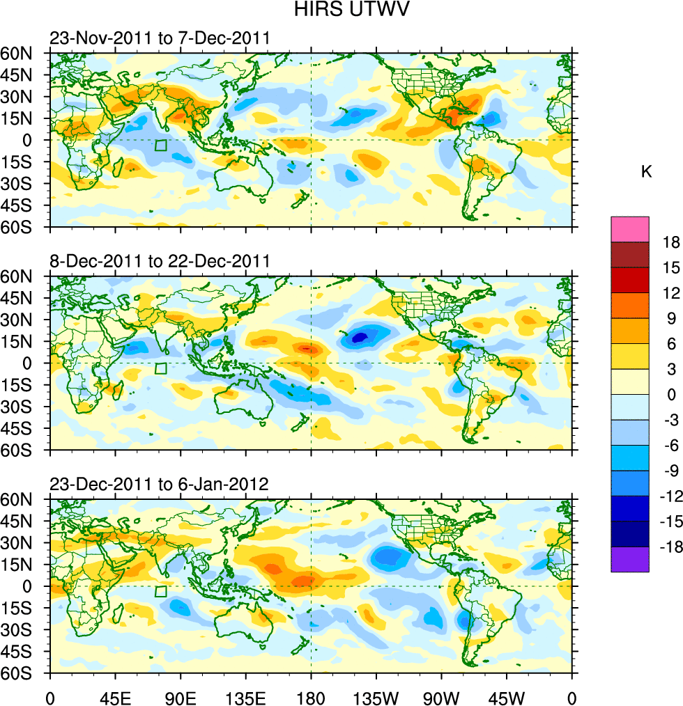 To identify tropical waves in near real-time, the OLR and UTWV data are filtered following Wheeler & Weickmann (2001 MWR). The daily anomalies are calculated using the first 3 harmonics of the seasonal cycle for 1979–2009. Missing values are then filled using linear interpolation in space and time. The most recent 365 days of anomalies are padded with 659 days of zeroes, and the result is filtered for each wave type.
