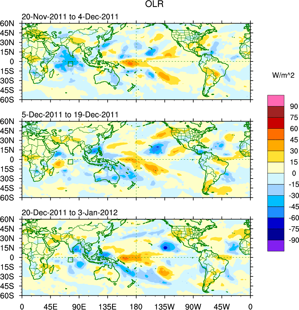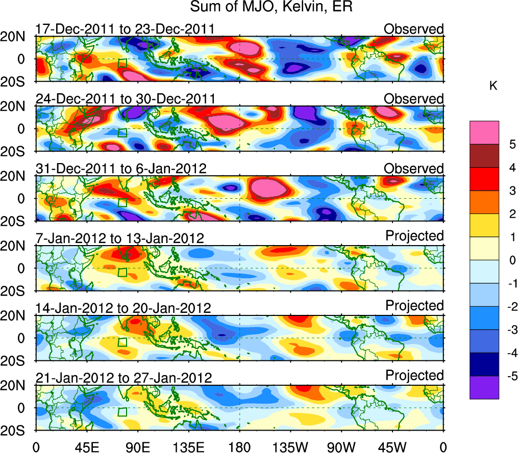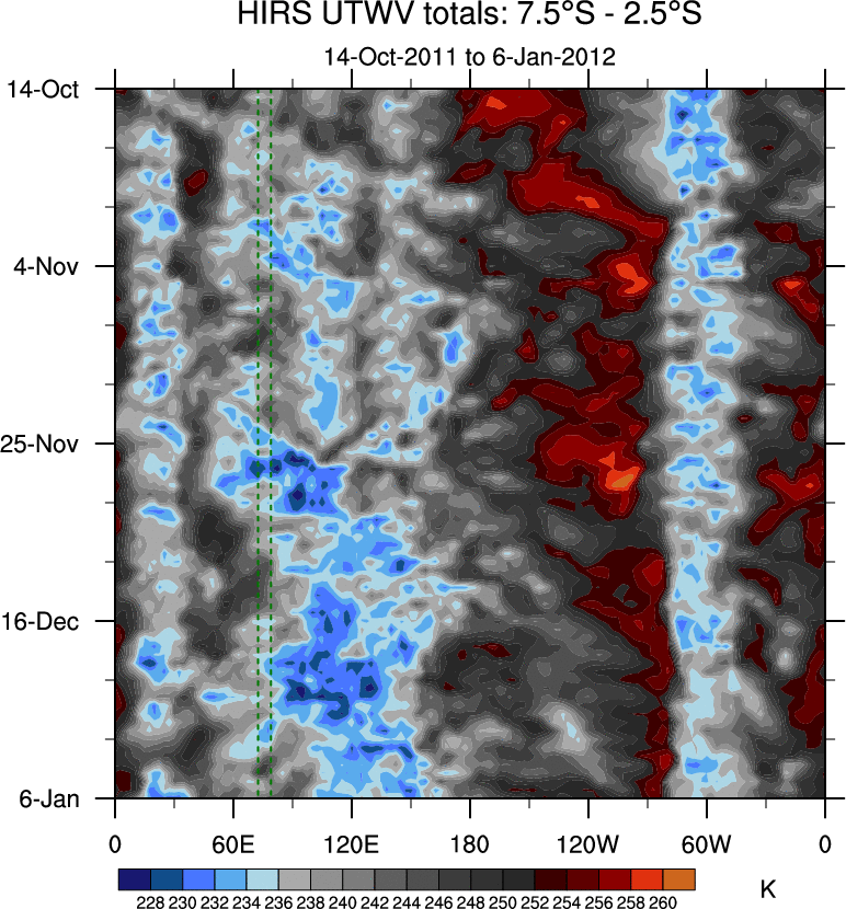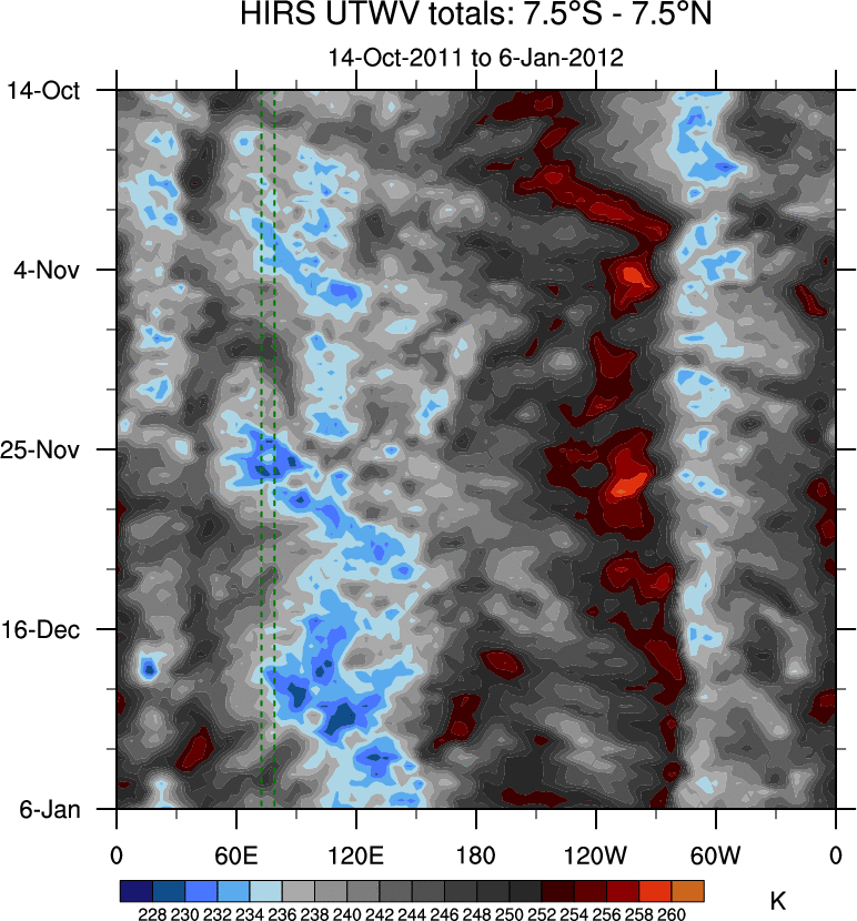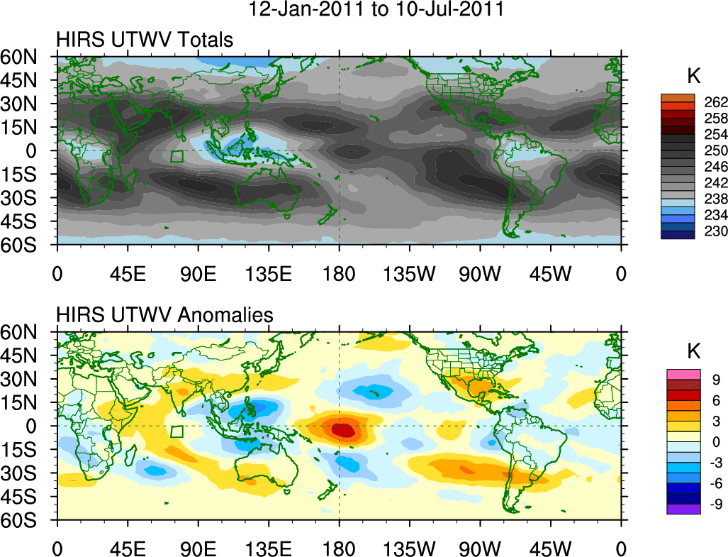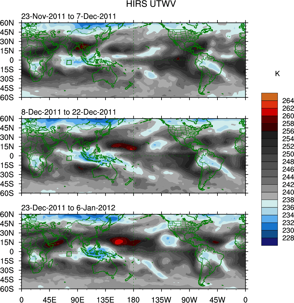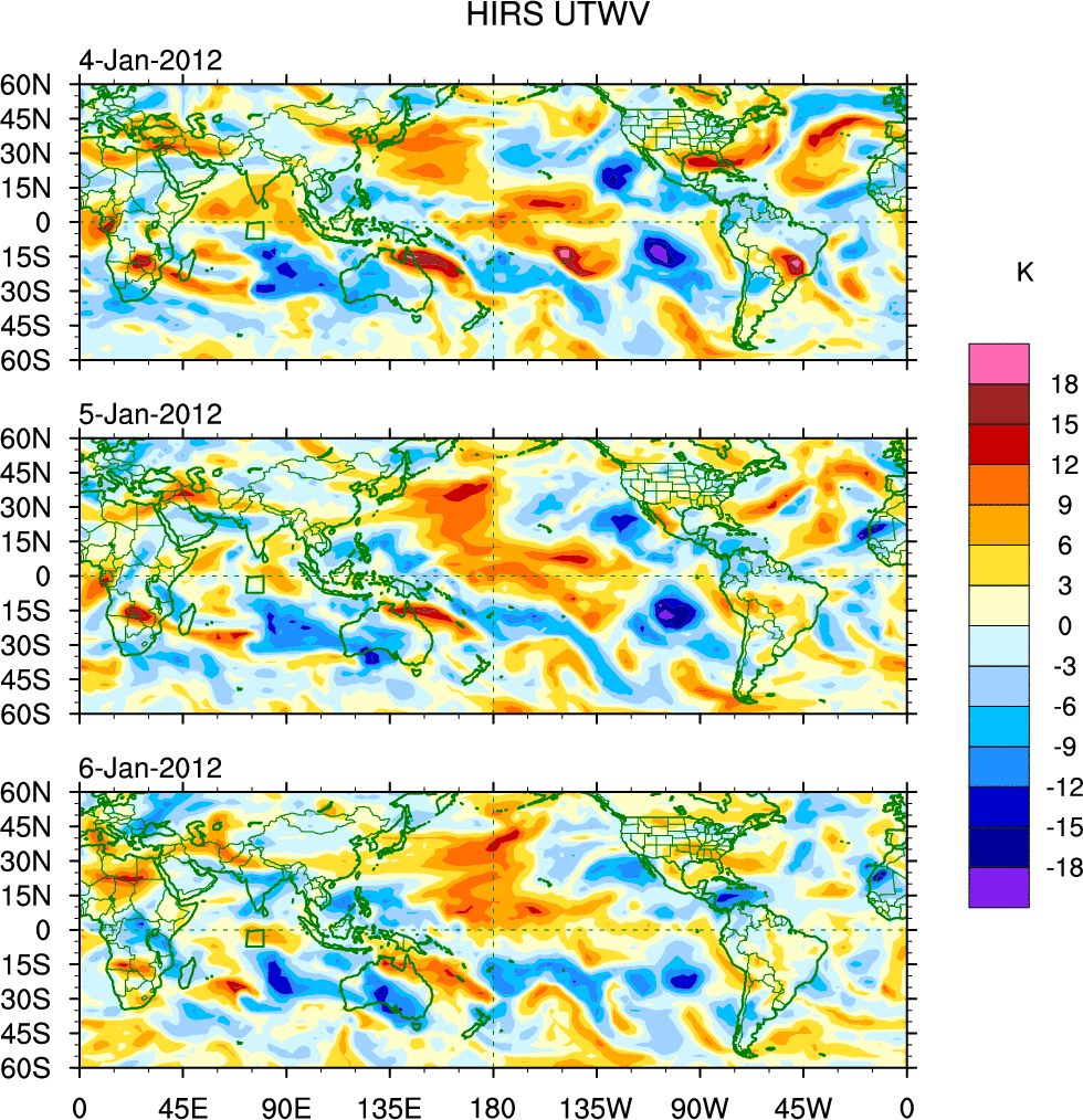 To identify tropical waves in near real-time, the OLR and UTWV data are filtered following Wheeler & Weickmann (2001 MWR). The daily anomalies are calculated using the first 3 harmonics of the seasonal cycle for 1979–2009. Missing values are then filled using linear interpolation in space and time. The most recent 365 days of anomalies are padded with 659 days of zeroes, and the result is filtered for each wave type.