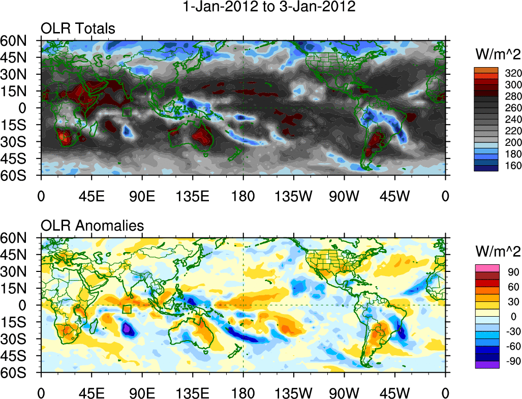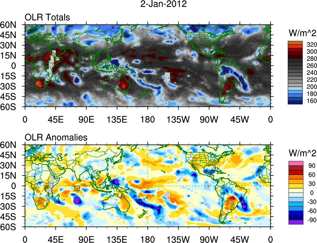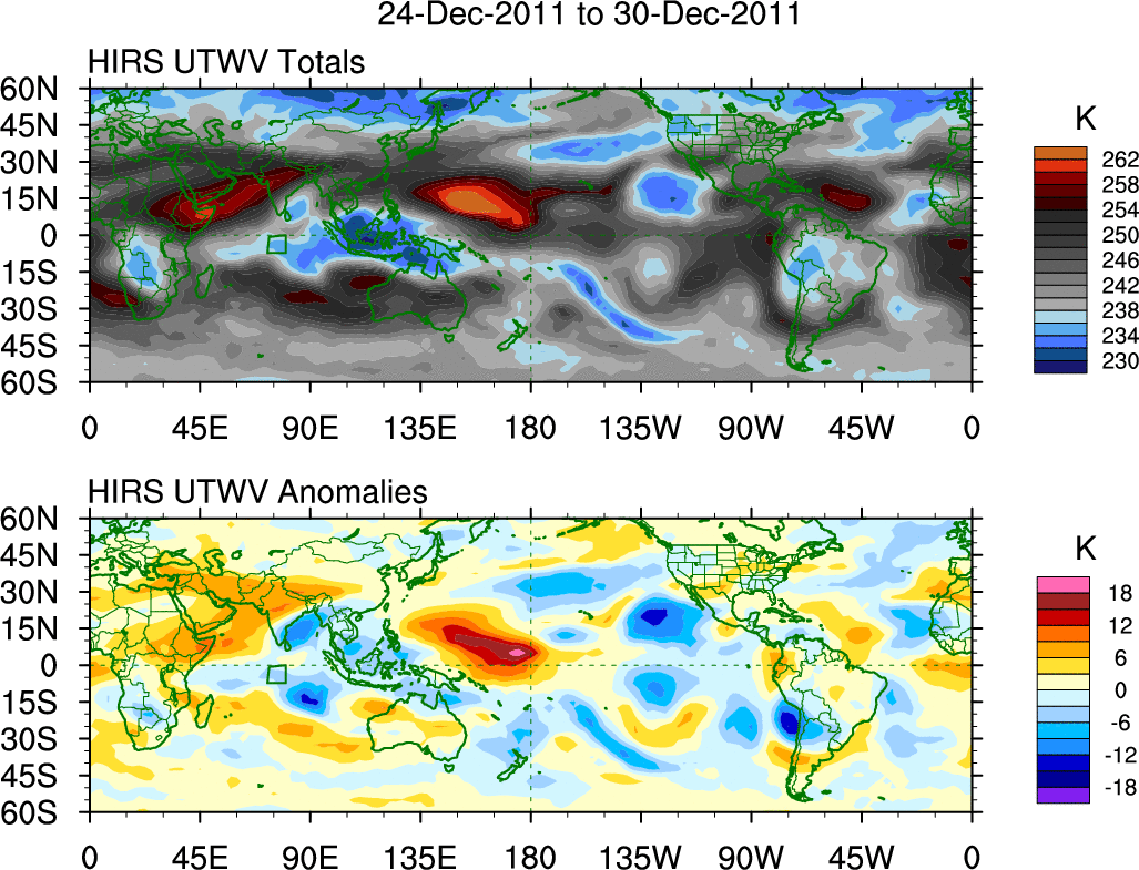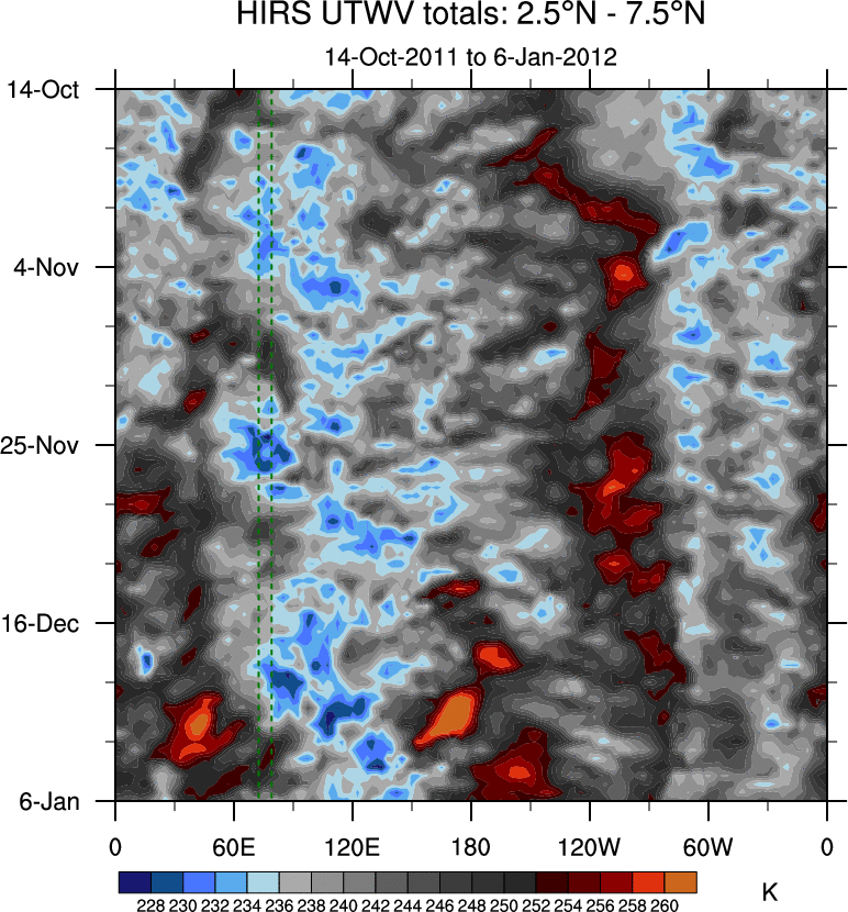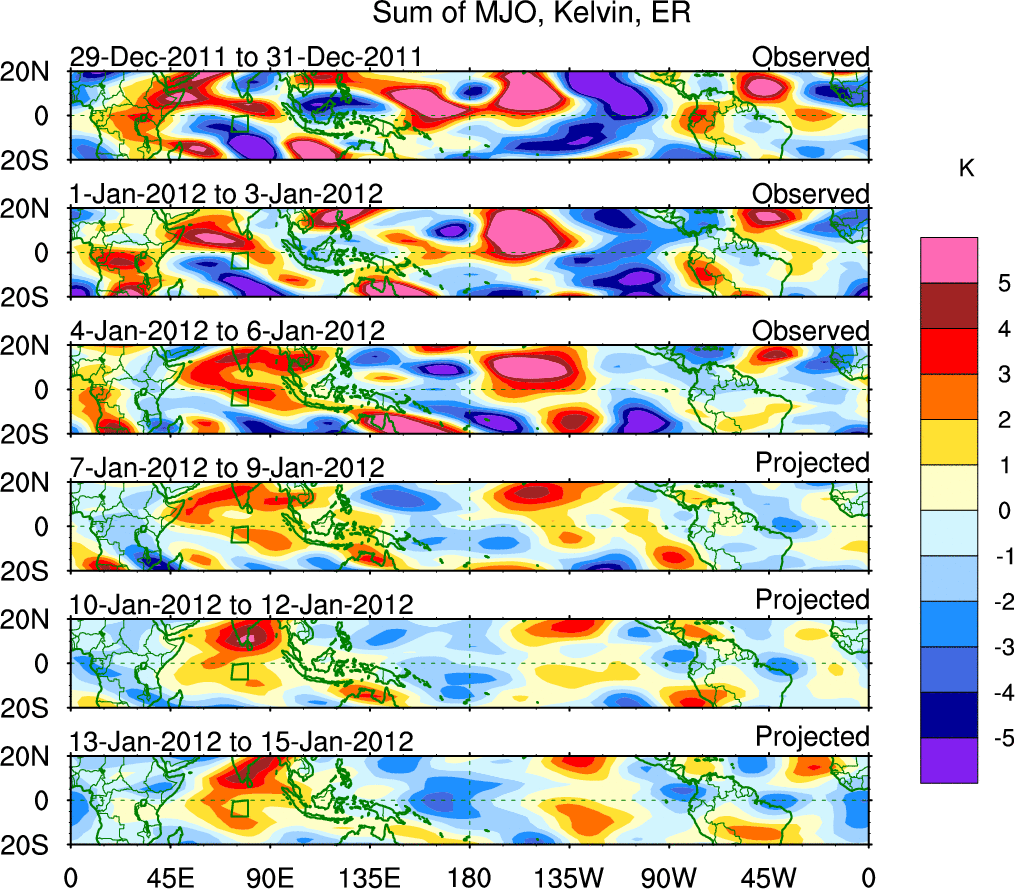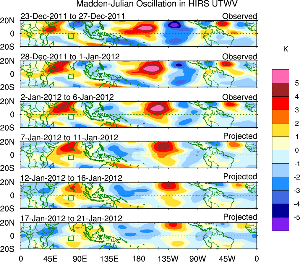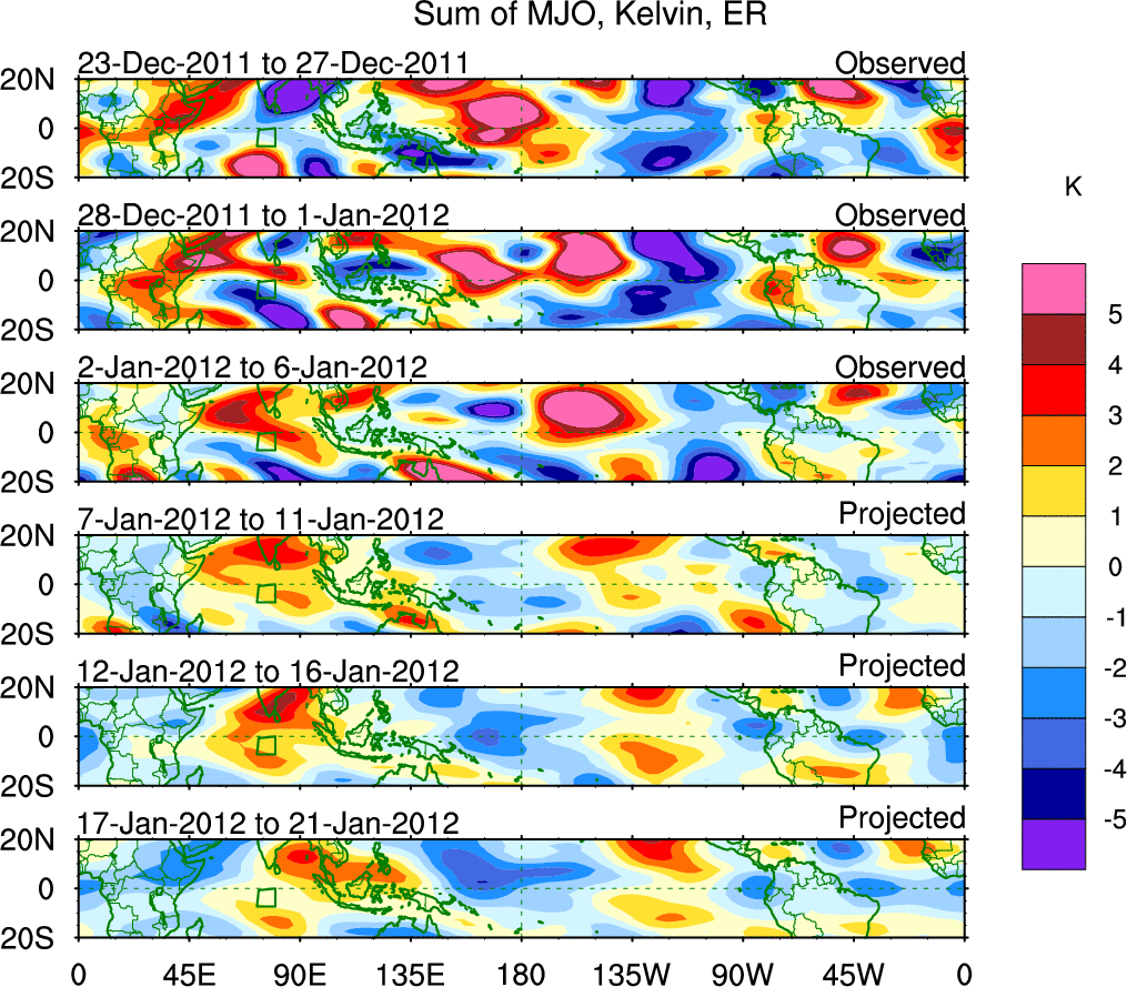 To identify tropical waves in near real-time, the OLR and UTWV data are filtered following Wheeler & Weickmann (2001 MWR). The daily anomalies are calculated using the first 3 harmonics of the seasonal cycle for 1979–2009. Missing values are then filled using linear interpolation in space and time. The most recent 365 days of anomalies are padded with 659 days of zeroes, and the result is filtered for each wave type.