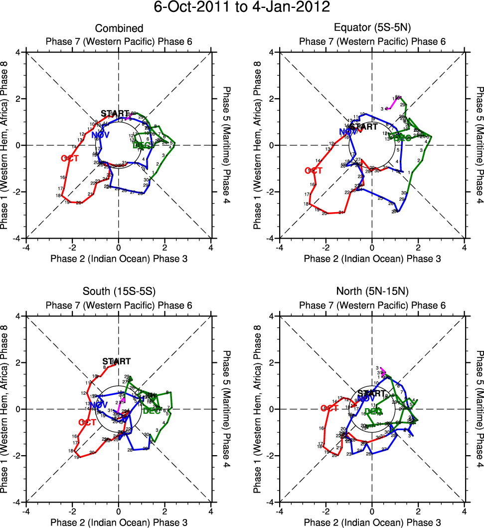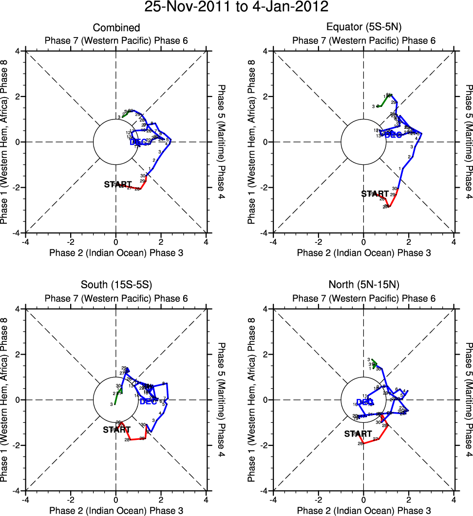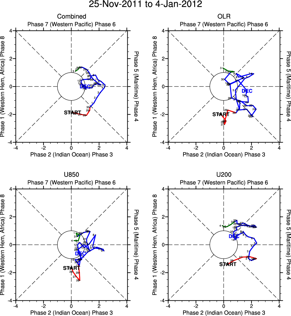 Wheeler and Hendon (2004) constructed the RMM index for monitoring the MJO. This index consists of the first two principal components (PCs) of OLR, 850-hPa zonal wind, and 200-hPa zonal wind averaged 15S-15N.