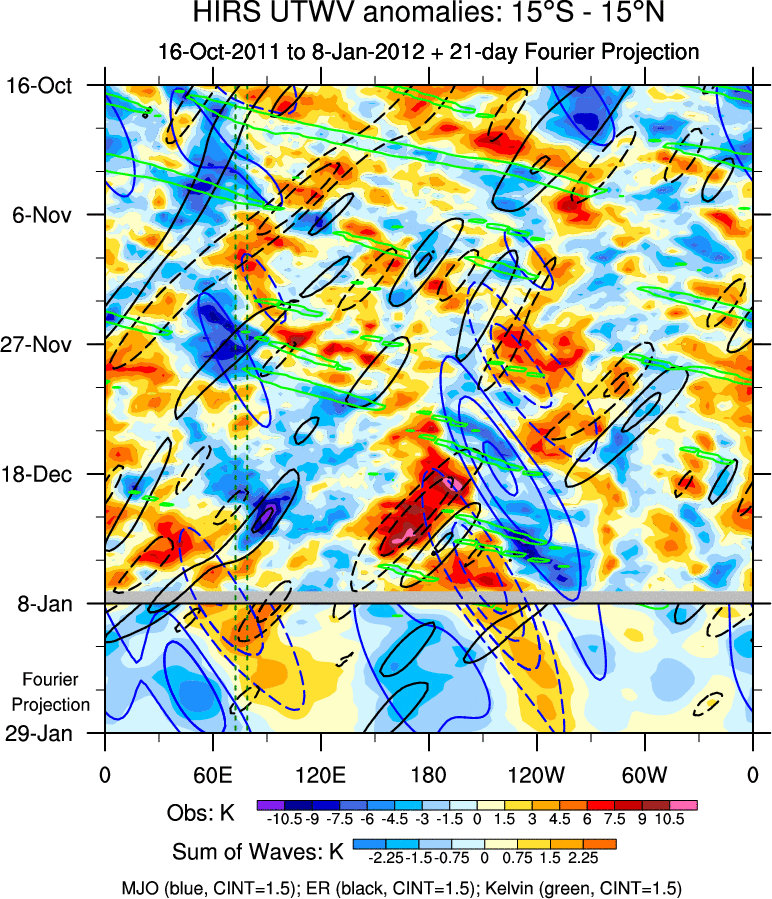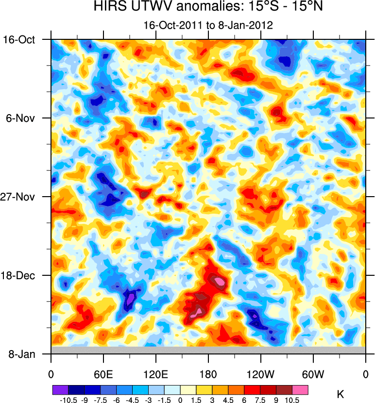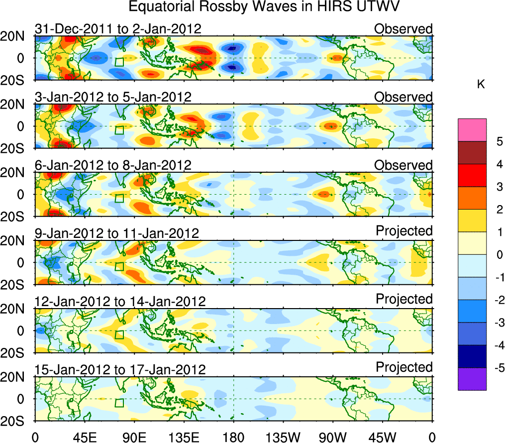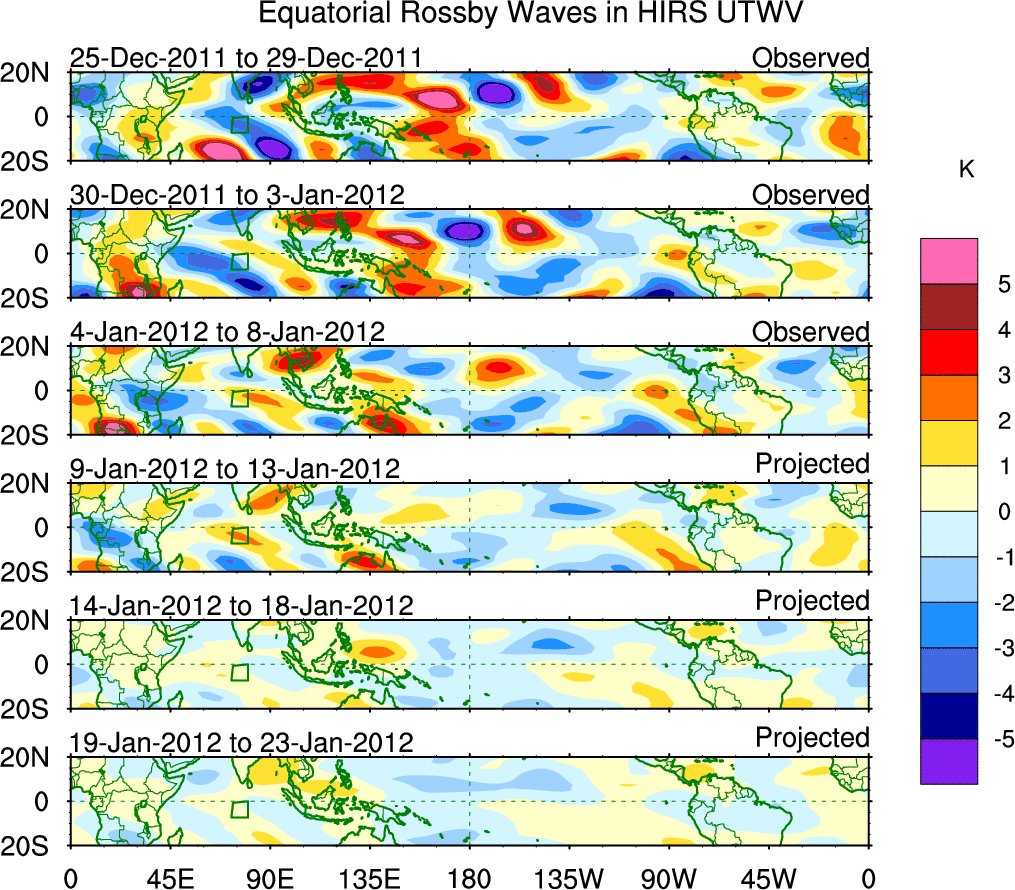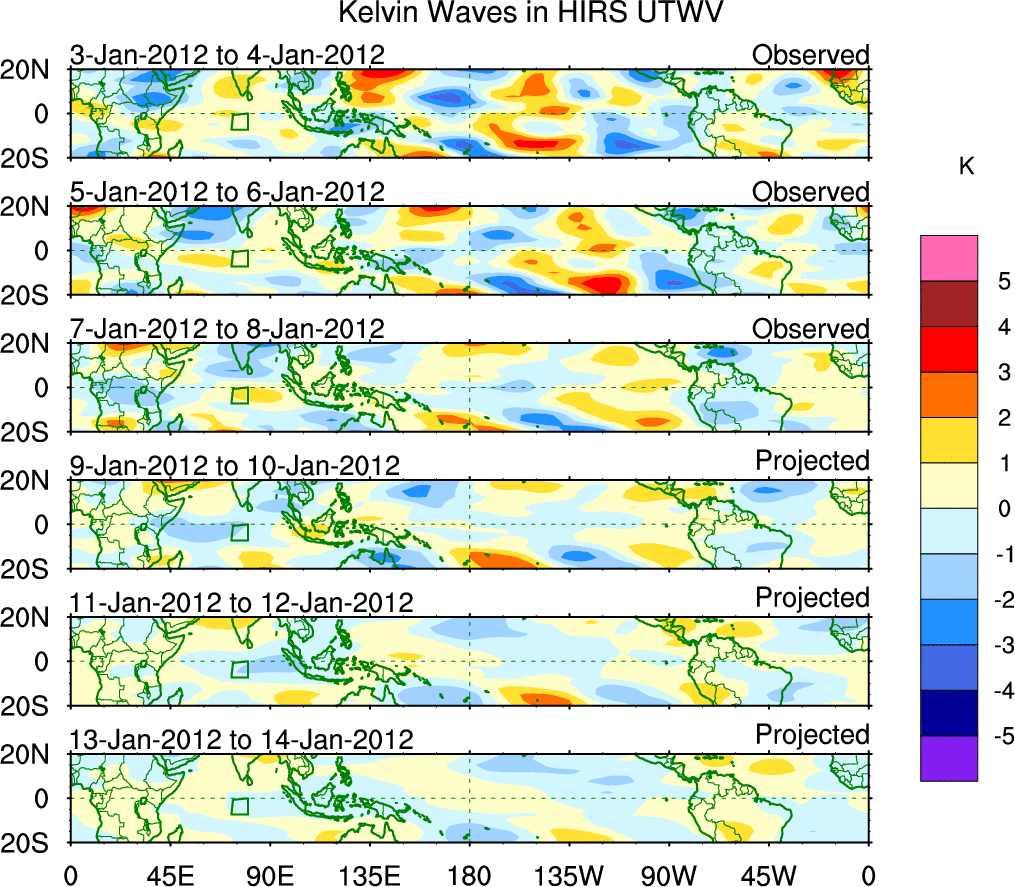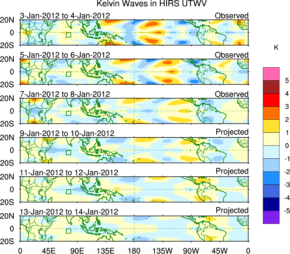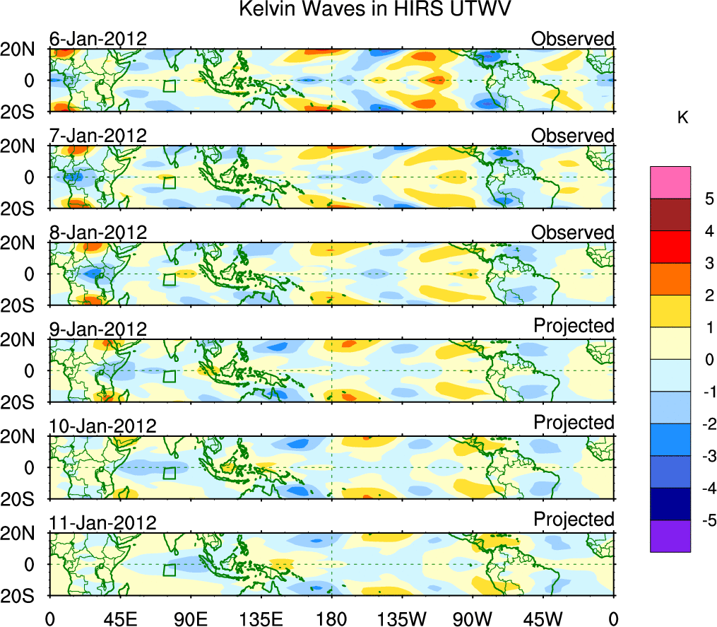 To identify tropical waves in near real-time, the OLR and UTWV data are filtered following Wheeler & Weickmann (2001 MWR). The daily anomalies are calculated using the first 3 harmonics of the seasonal cycle for 1979–2009. Missing values are then filled using linear interpolation in space and time. The most recent 365 days of anomalies are padded with 659 days of zeroes, and the result is filtered for each wave type.