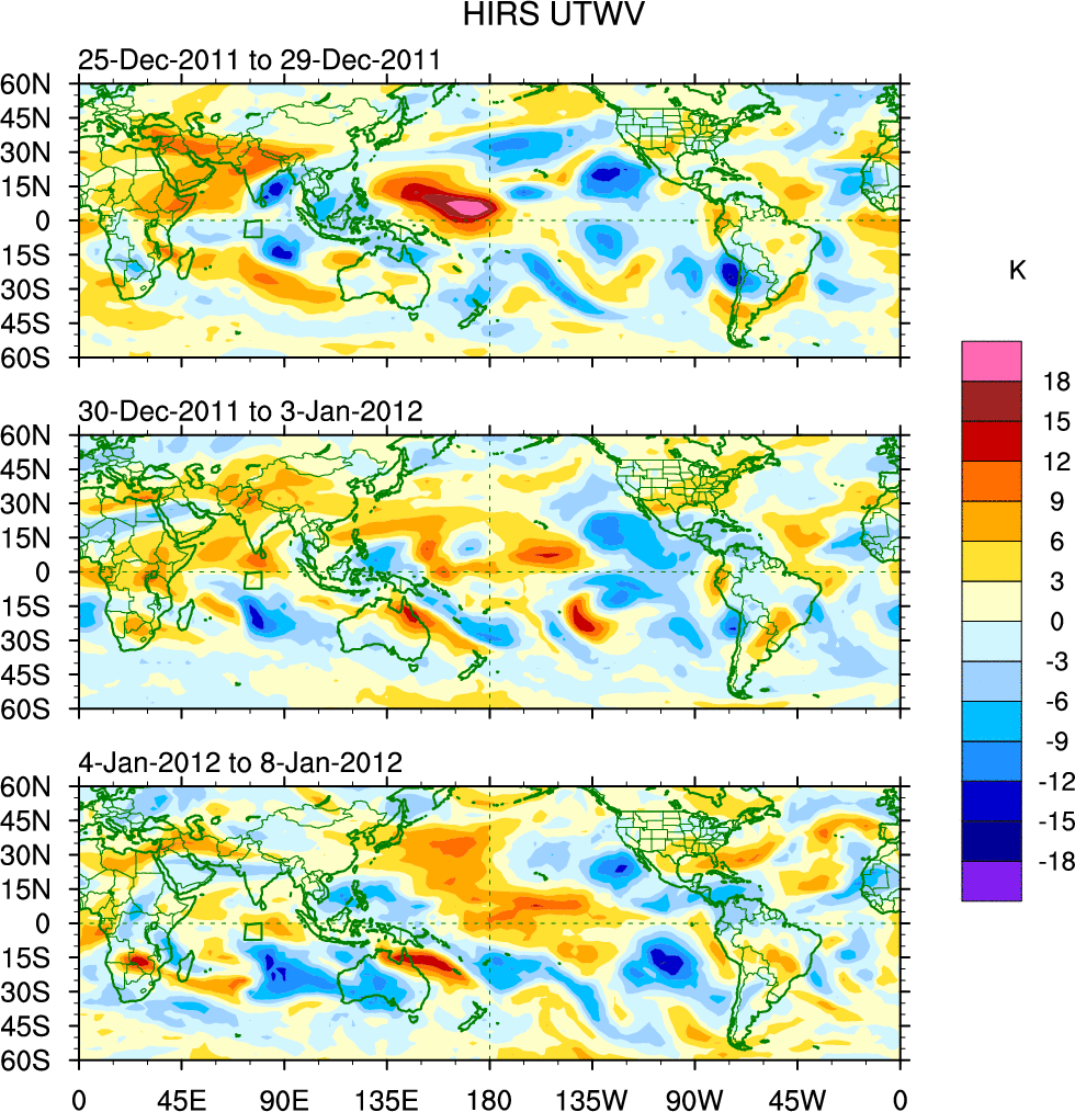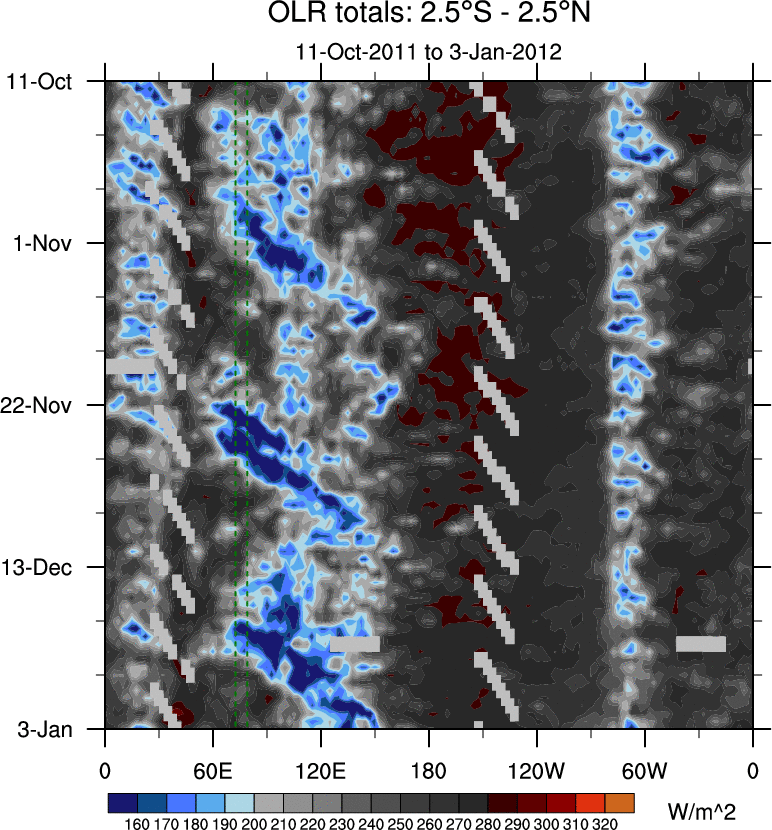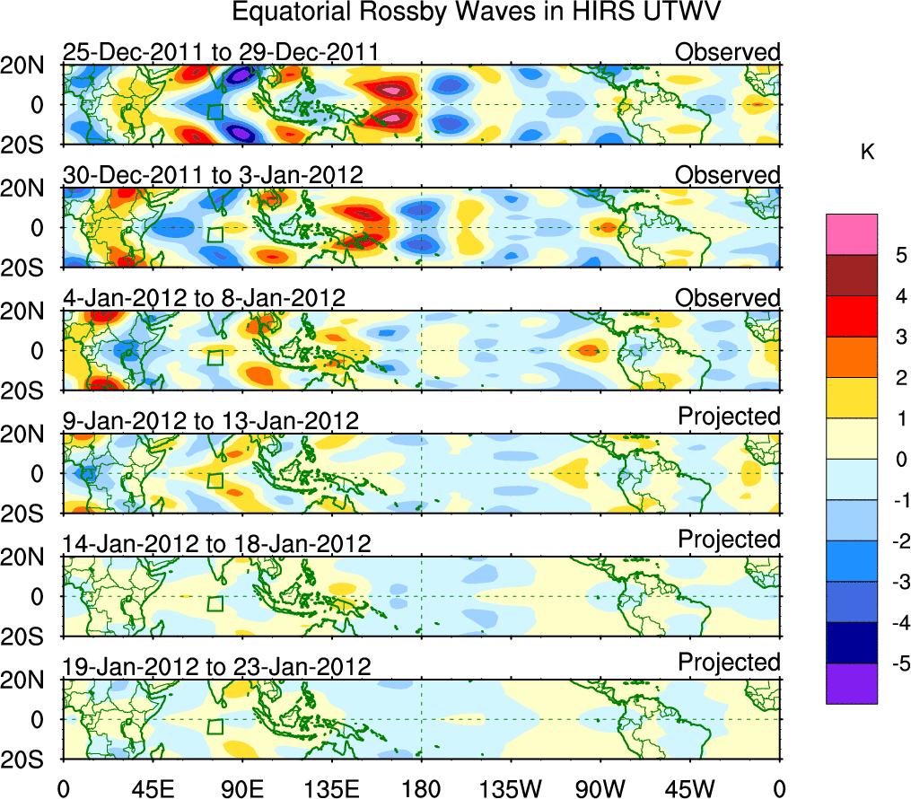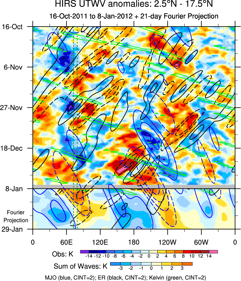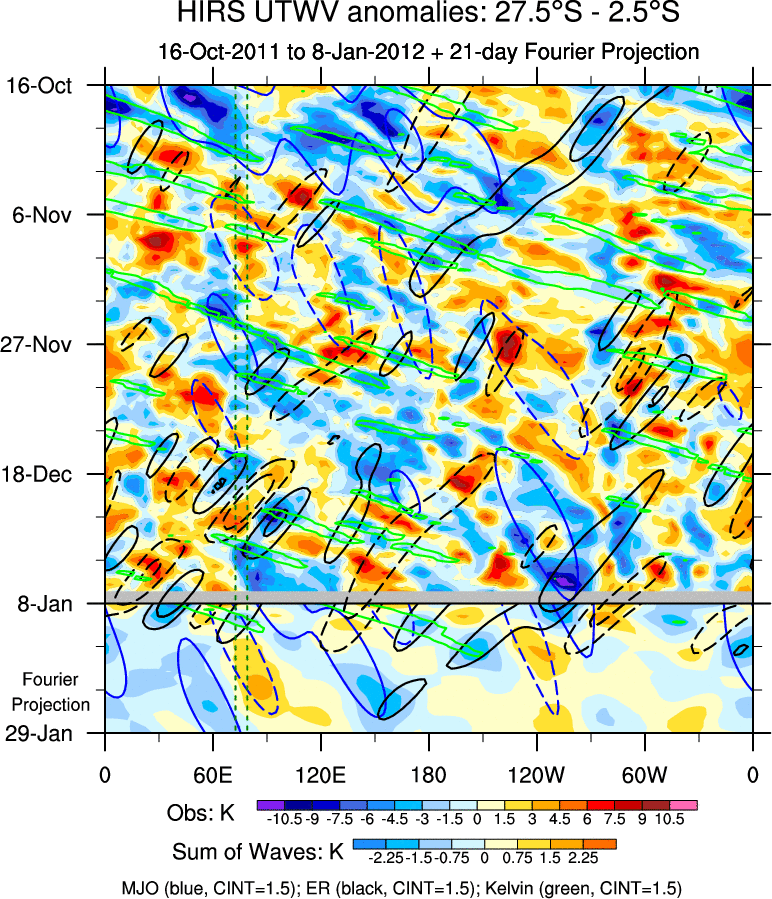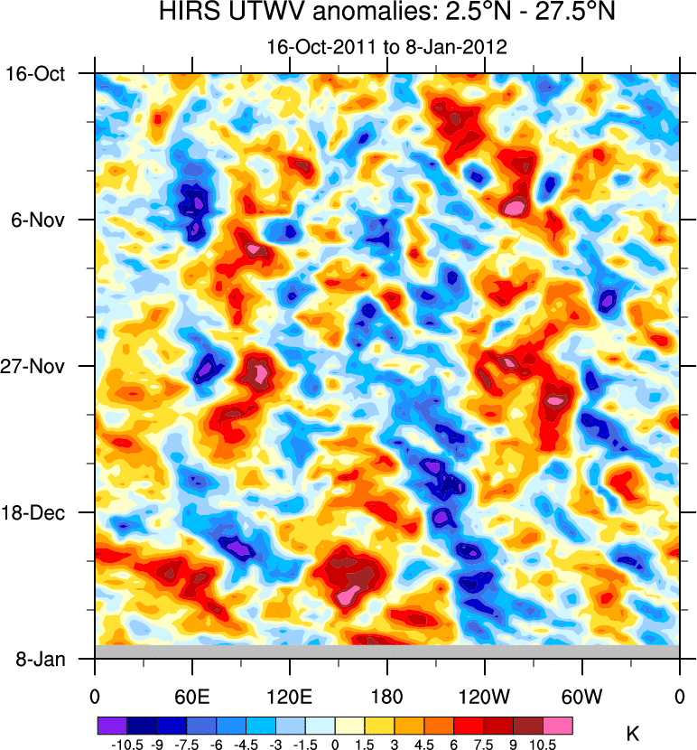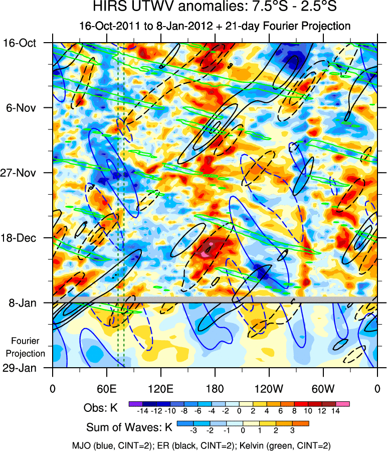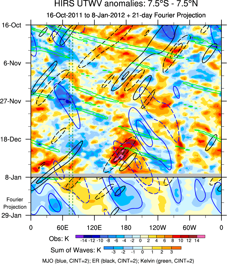 To identify tropical waves in near real-time, the OLR and UTWV data are filtered following Wheeler & Weickmann (2001 MWR). The daily anomalies are calculated using the first 3 harmonics of the seasonal cycle for 1979–2009. Missing values are then filled using linear interpolation in space and time. The most recent 365 days of anomalies are padded with 659 days of zeroes, and the result is filtered for each wave type.