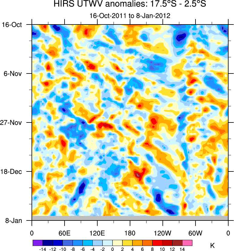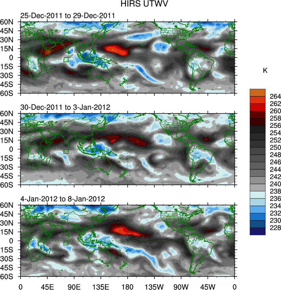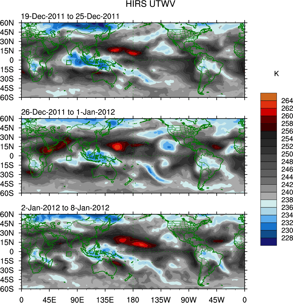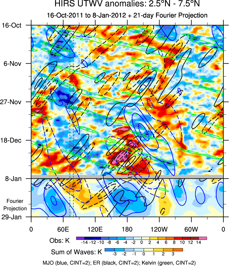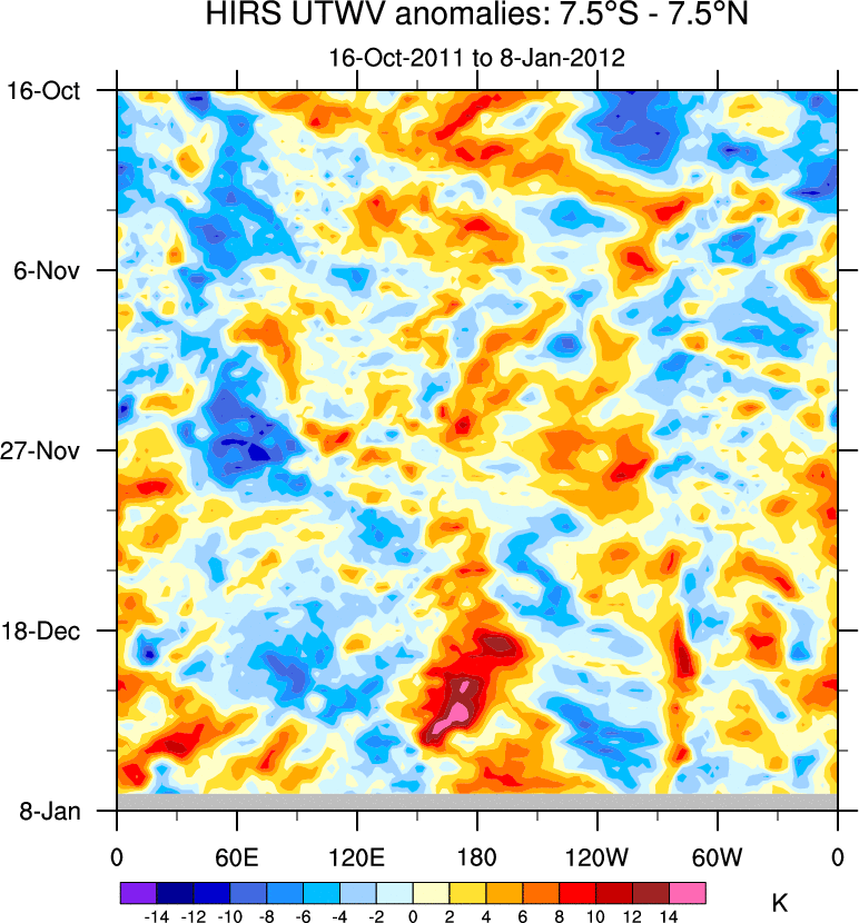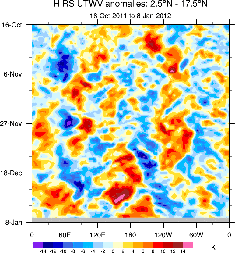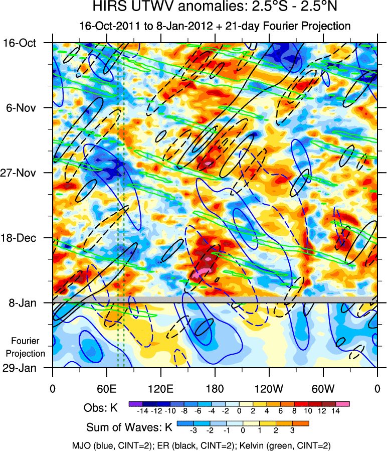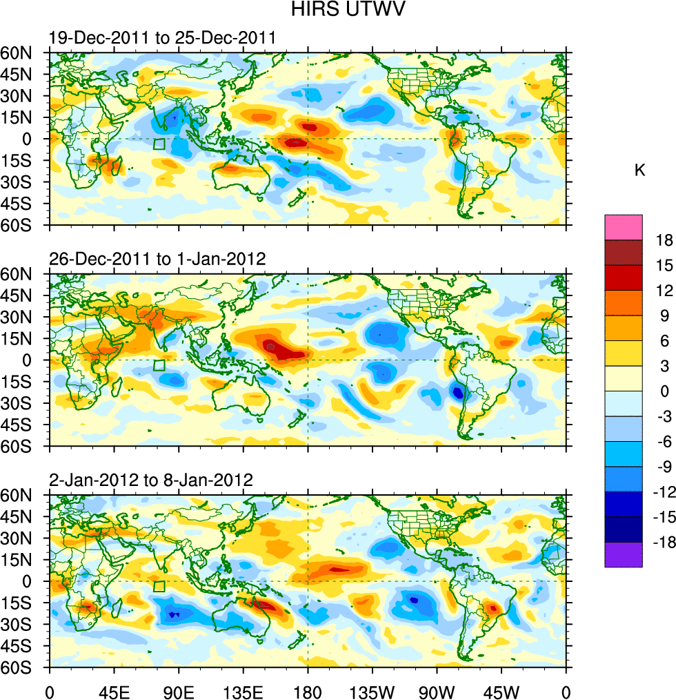 To identify tropical waves in near real-time, the OLR and UTWV data are filtered following Wheeler & Weickmann (2001 MWR). The daily anomalies are calculated using the first 3 harmonics of the seasonal cycle for 1979–2009. Missing values are then filled using linear interpolation in space and time. The most recent 365 days of anomalies are padded with 659 days of zeroes, and the result is filtered for each wave type.
