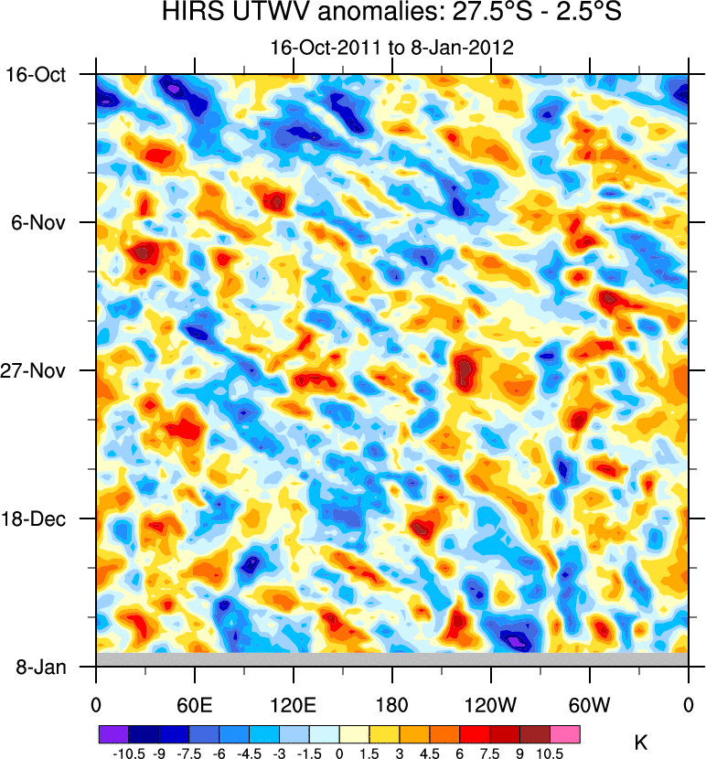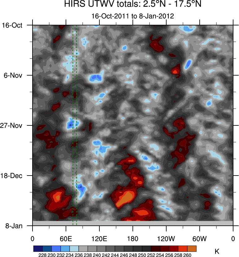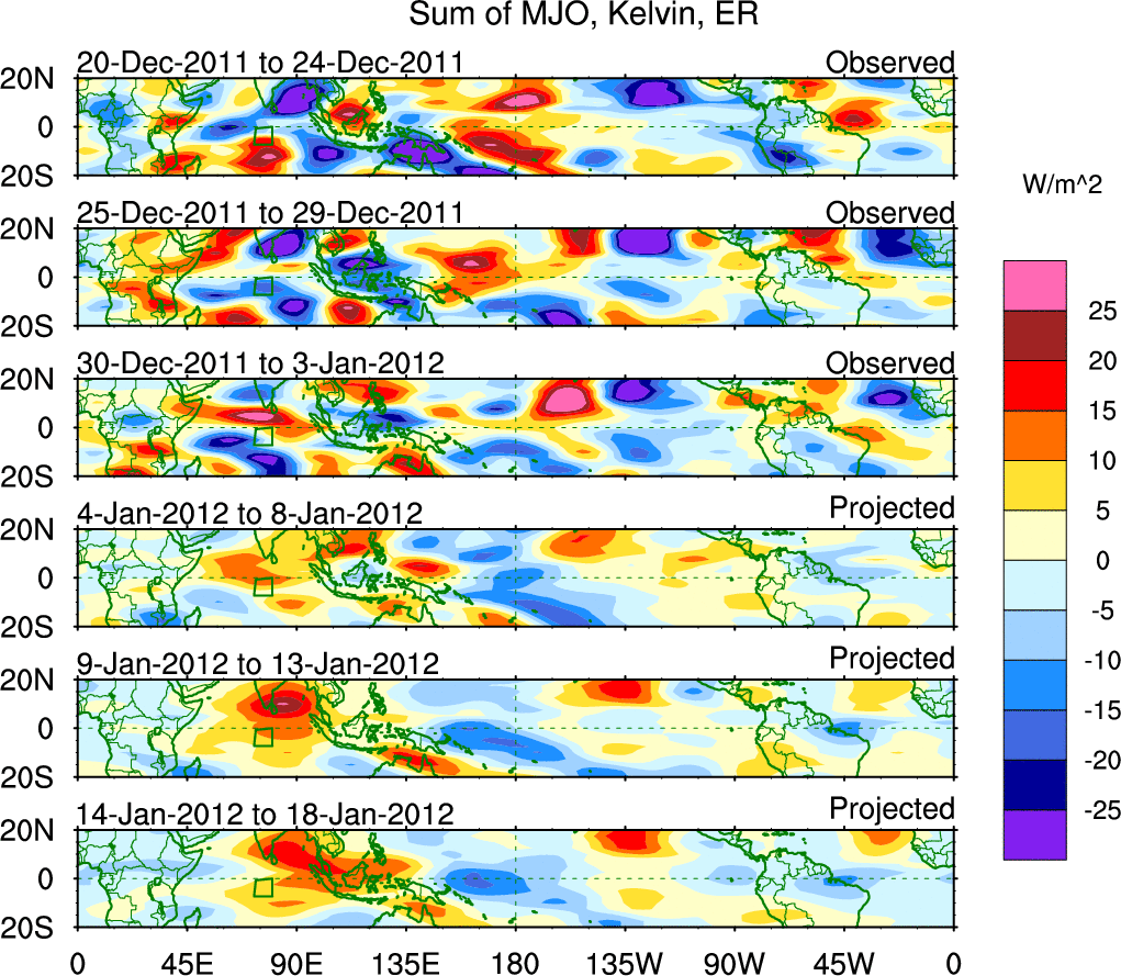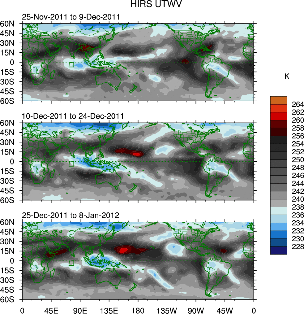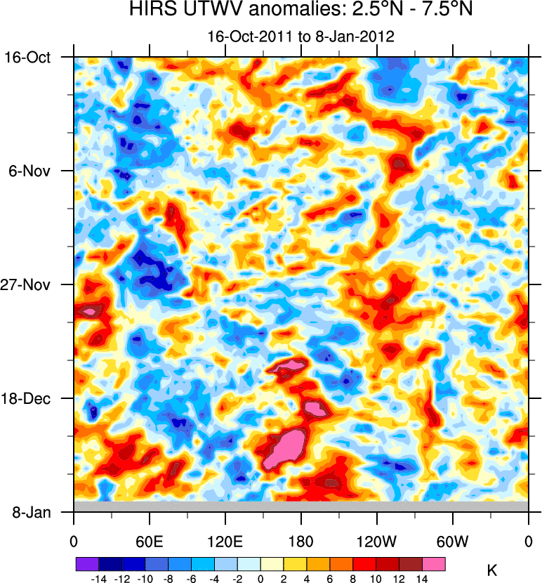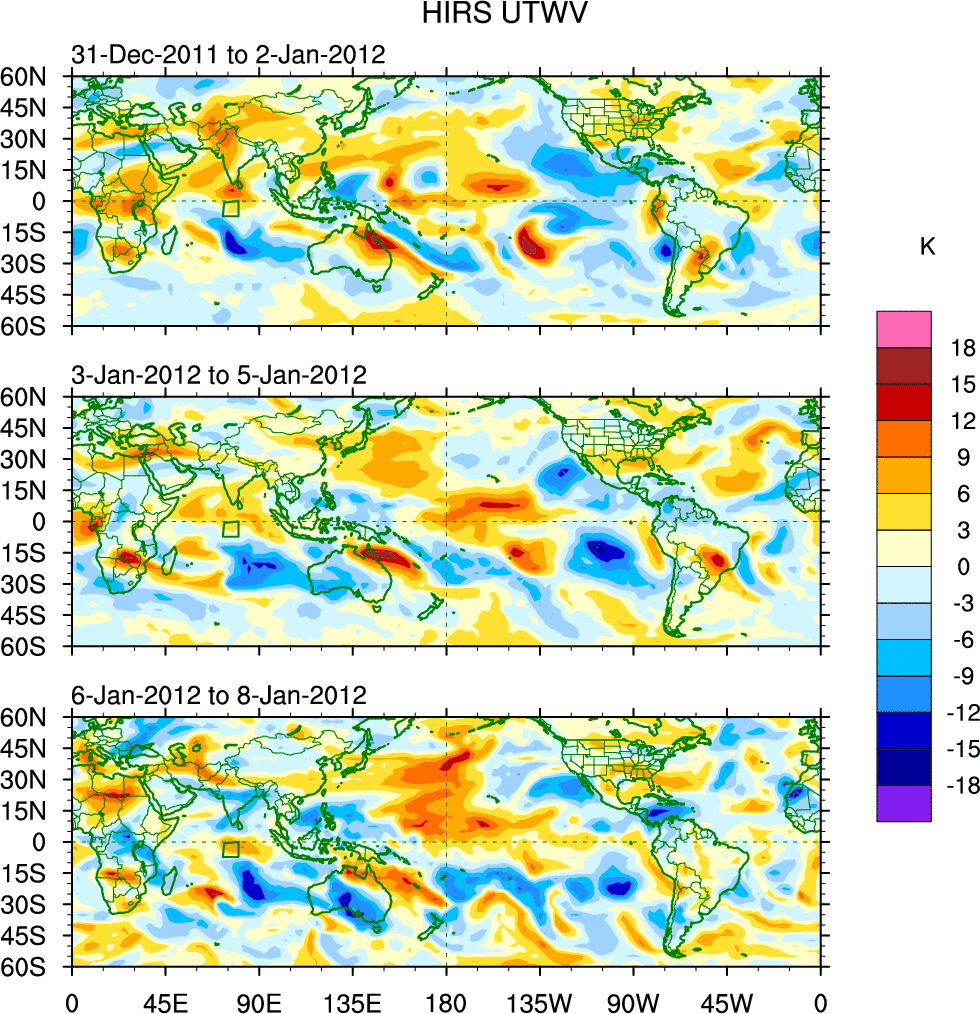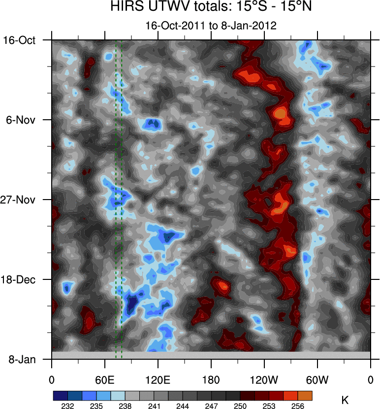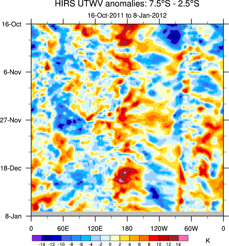 To identify tropical waves in near real-time, the OLR and UTWV data are filtered following Wheeler & Weickmann (2001 MWR). The daily anomalies are calculated using the first 3 harmonics of the seasonal cycle for 1979–2009. Missing values are then filled using linear interpolation in space and time. The most recent 365 days of anomalies are padded with 659 days of zeroes, and the result is filtered for each wave type.