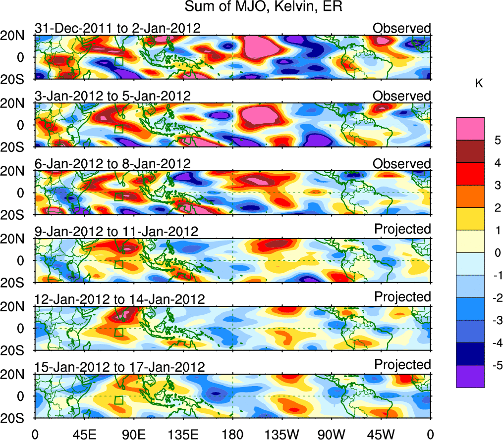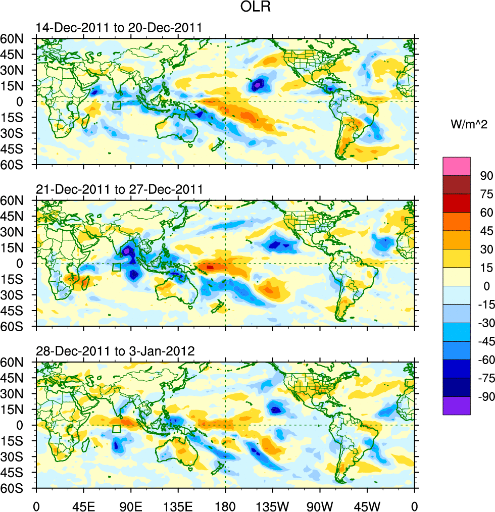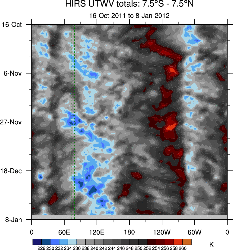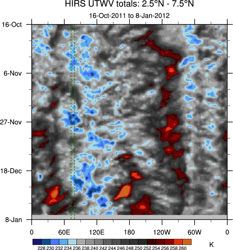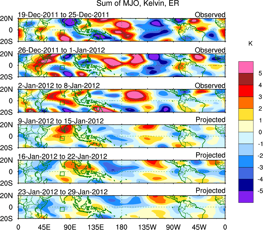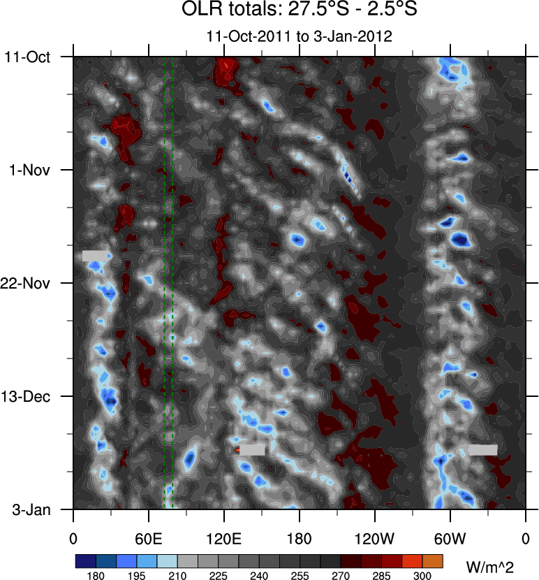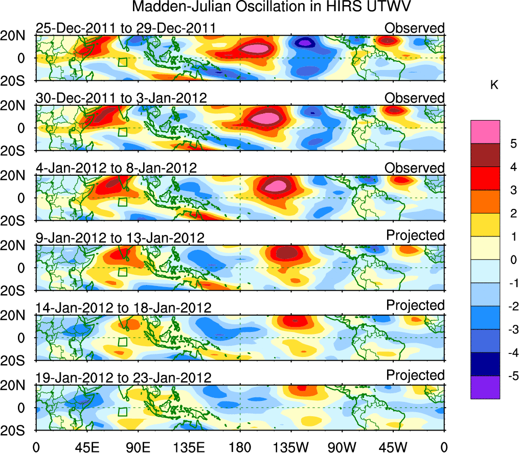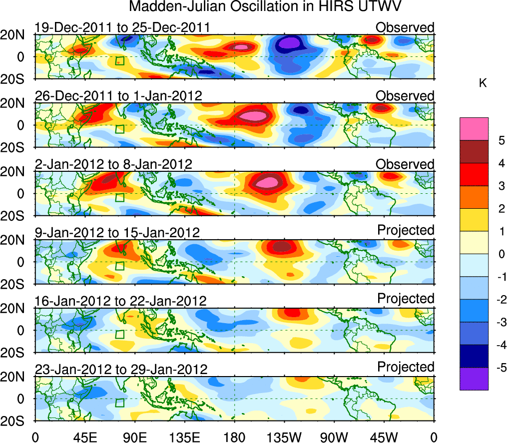 To identify tropical waves in near real-time, the OLR and UTWV data are filtered following Wheeler & Weickmann (2001 MWR). The daily anomalies are calculated using the first 3 harmonics of the seasonal cycle for 1979–2009. Missing values are then filled using linear interpolation in space and time. The most recent 365 days of anomalies are padded with 659 days of zeroes, and the result is filtered for each wave type.