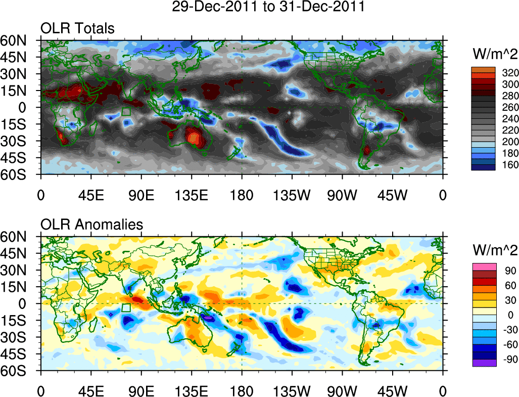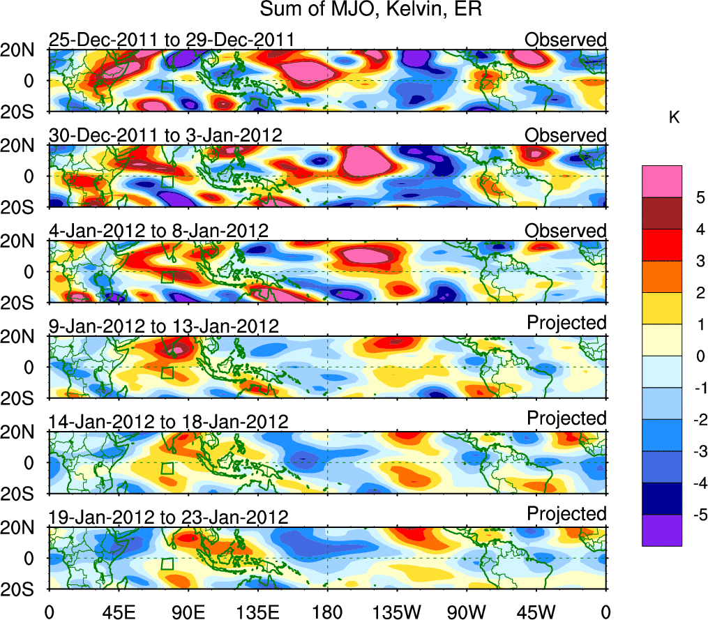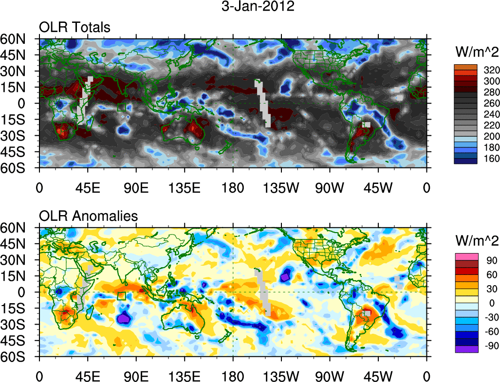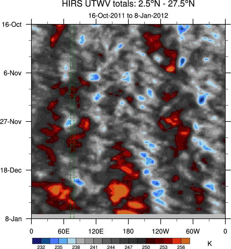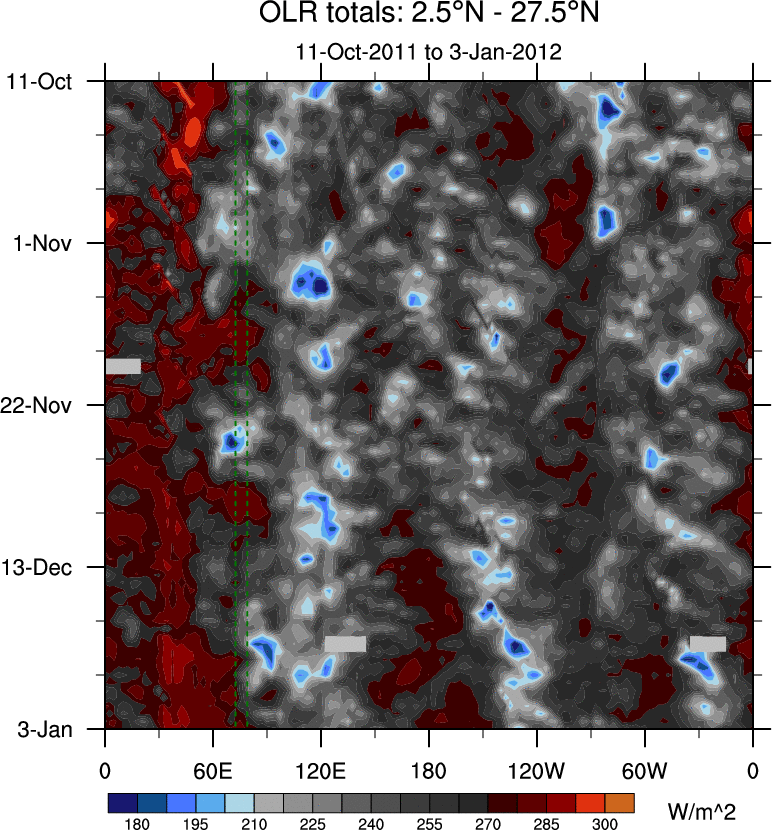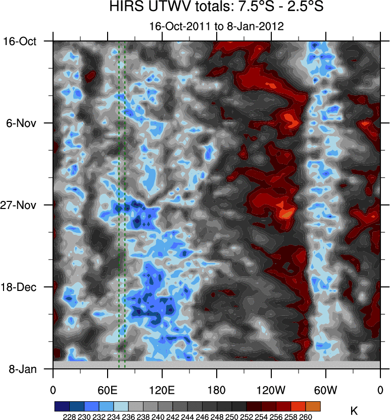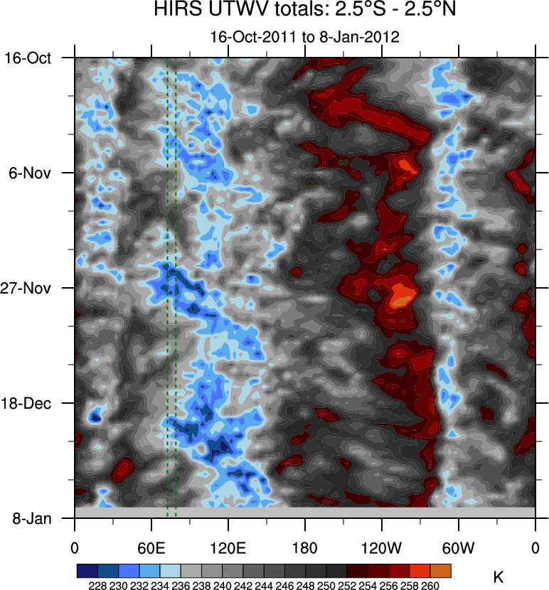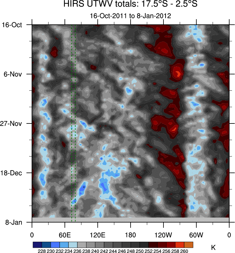 To identify tropical waves in near real-time, the OLR and UTWV data are filtered following Wheeler & Weickmann (2001 MWR). The daily anomalies are calculated using the first 3 harmonics of the seasonal cycle for 1979–2009. Missing values are then filled using linear interpolation in space and time. The most recent 365 days of anomalies are padded with 659 days of zeroes, and the result is filtered for each wave type.