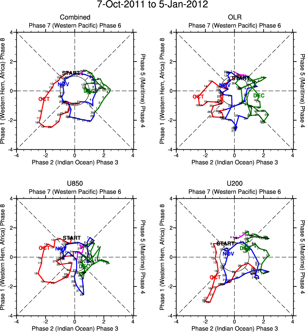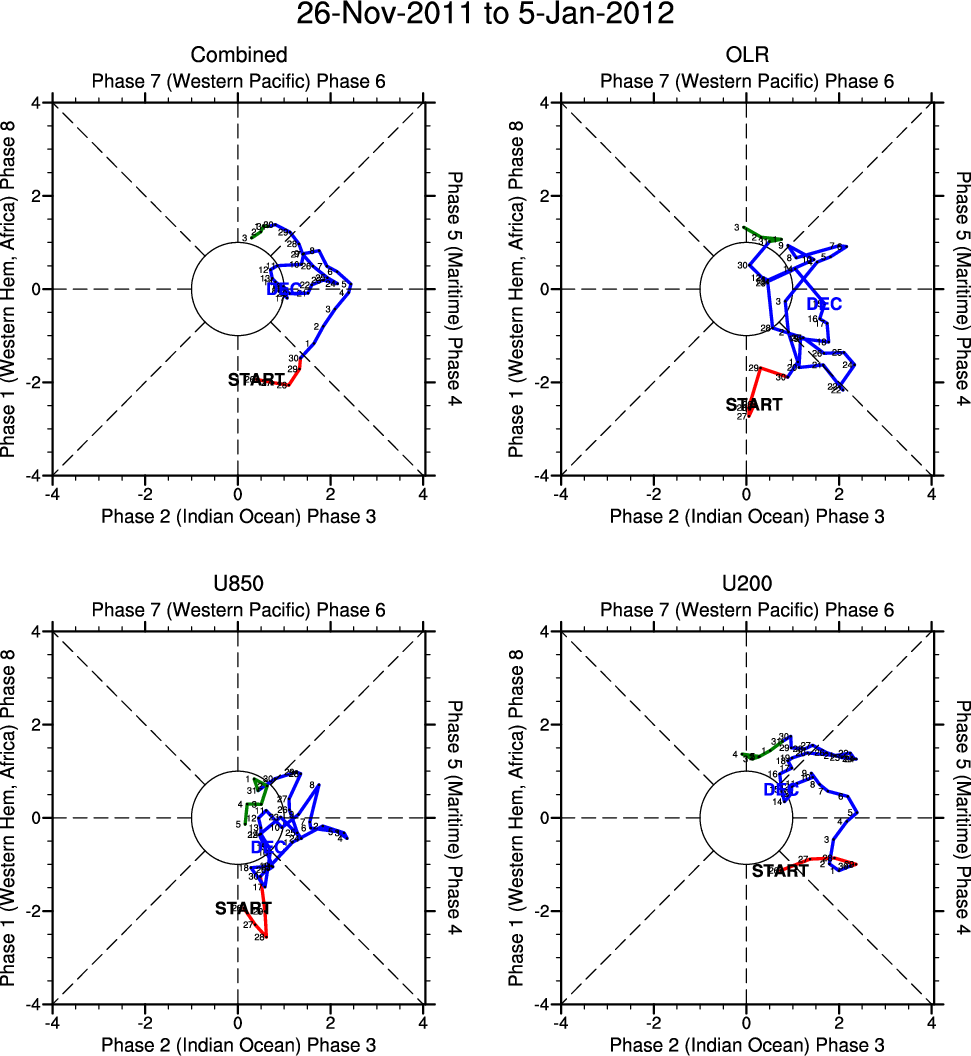Wheeler and Hendon (2004) constructed the RMM index for monitoring the MJO. This index consists of the first two principal components (PCs) of OLR, 850-hPa zonal wind, and 200-hPa zonal wind averaged 15S-15N.
