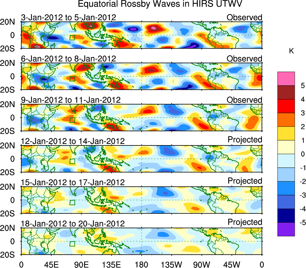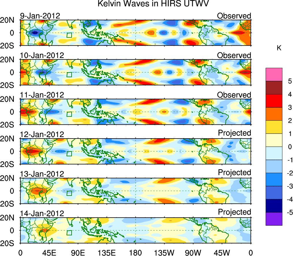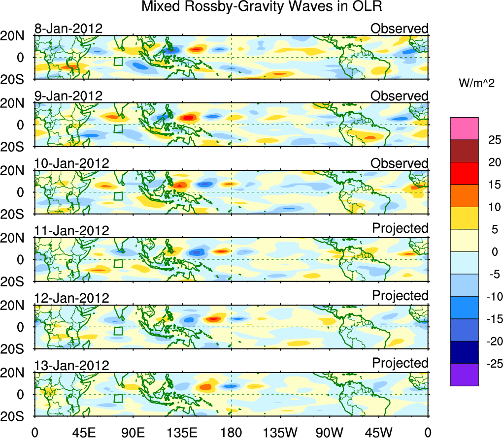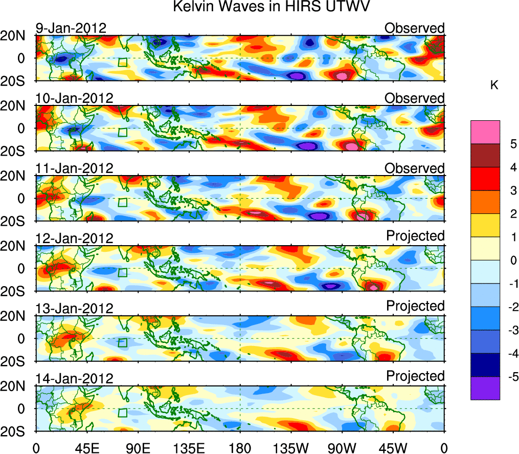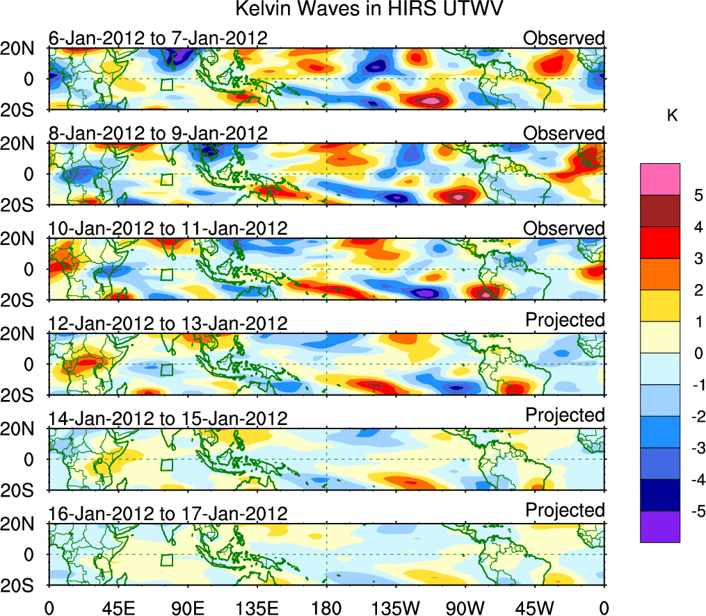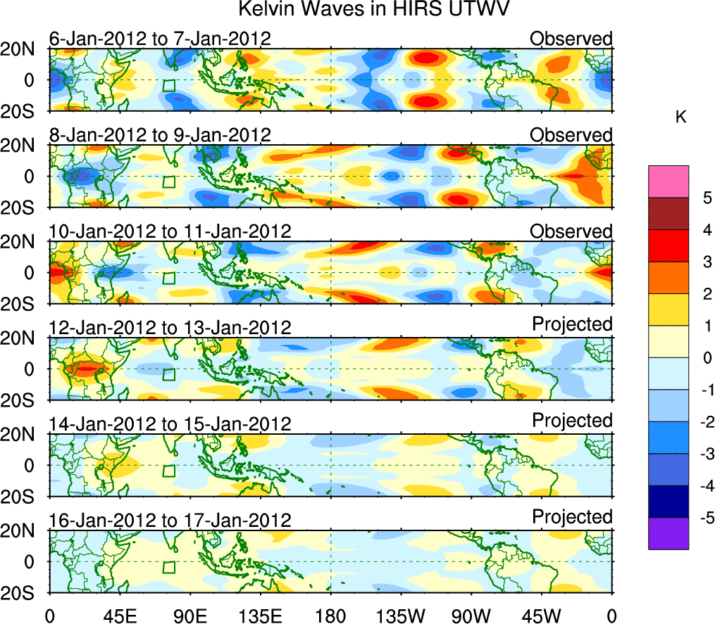 To identify tropical waves in near real-time, the OLR and UTWV data are filtered following Wheeler & Weickmann (2001 MWR). The daily anomalies are calculated using the first 3 harmonics of the seasonal cycle for 1979–2009. Missing values are then filled using linear interpolation in space and time. The most recent 365 days of anomalies are padded with 659 days of zeroes, and the result is filtered for each wave type.