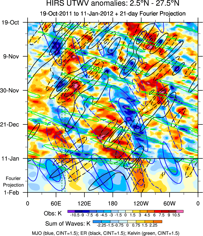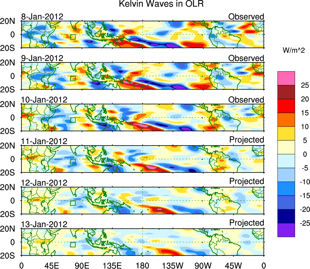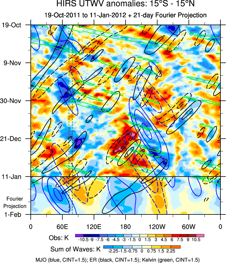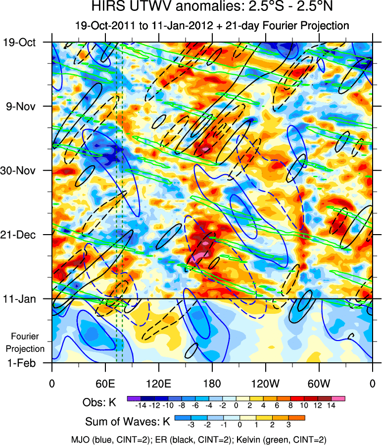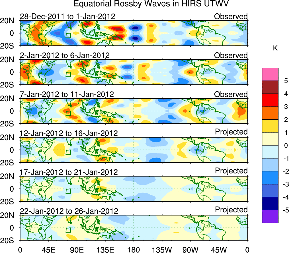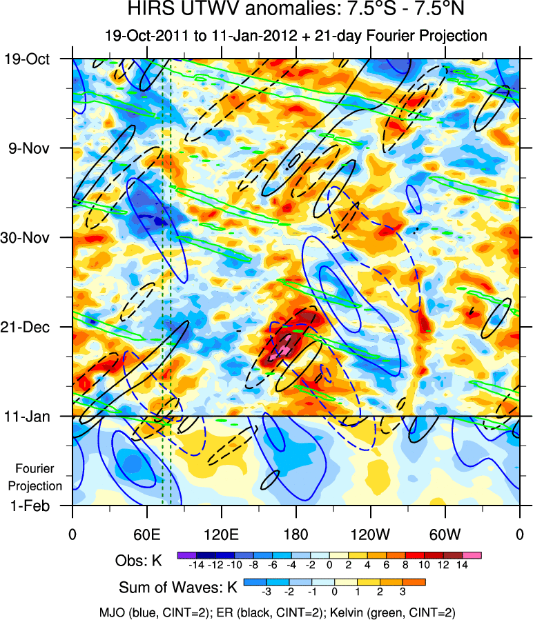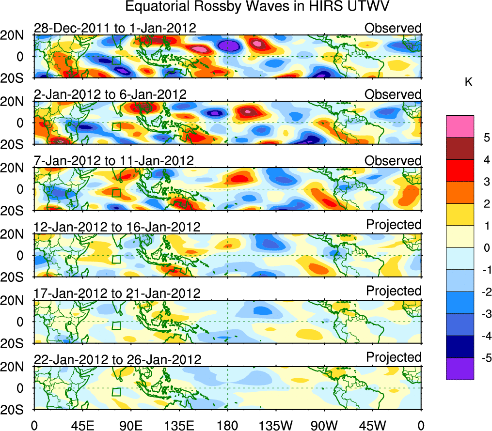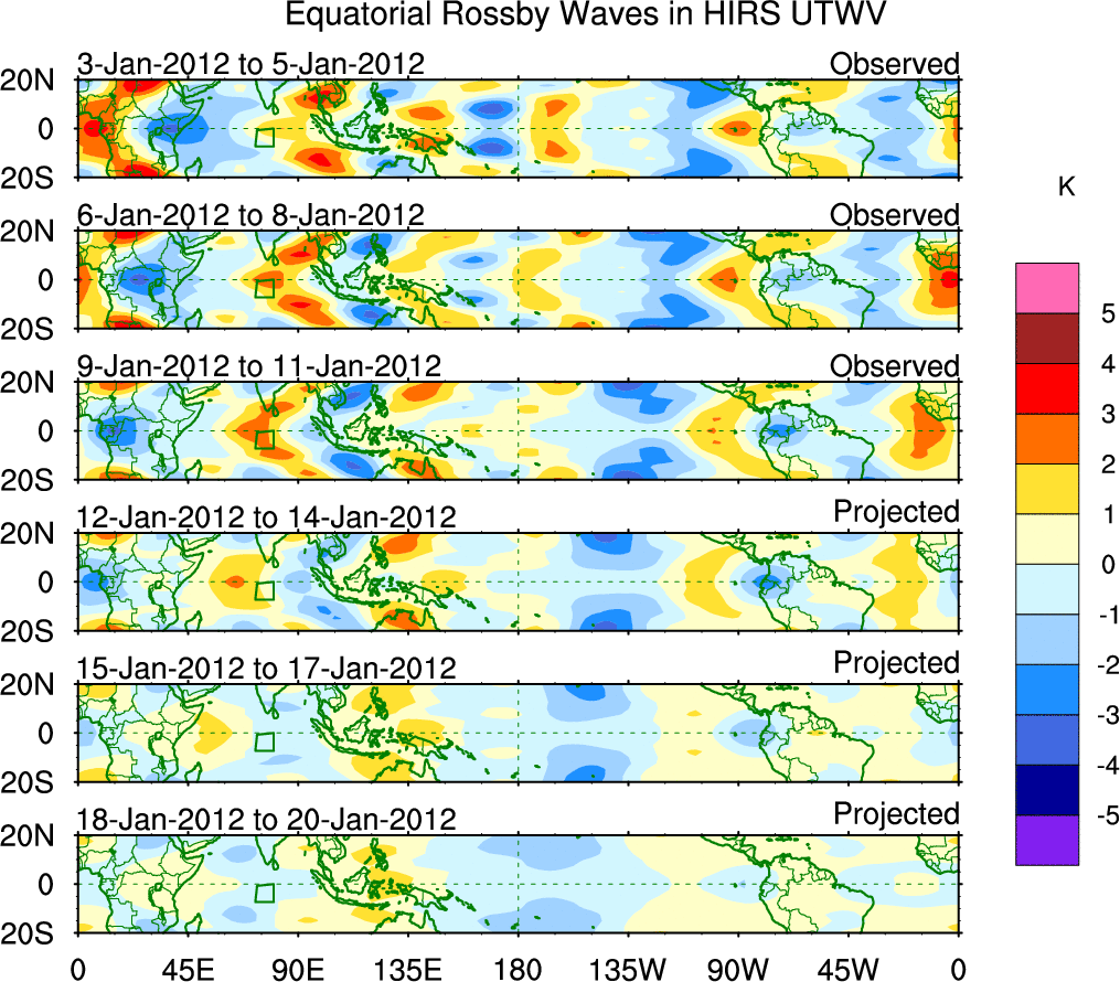 To identify tropical waves in near real-time, the OLR and UTWV data are filtered following Wheeler & Weickmann (2001 MWR). The daily anomalies are calculated using the first 3 harmonics of the seasonal cycle for 1979–2009. Missing values are then filled using linear interpolation in space and time. The most recent 365 days of anomalies are padded with 659 days of zeroes, and the result is filtered for each wave type.
