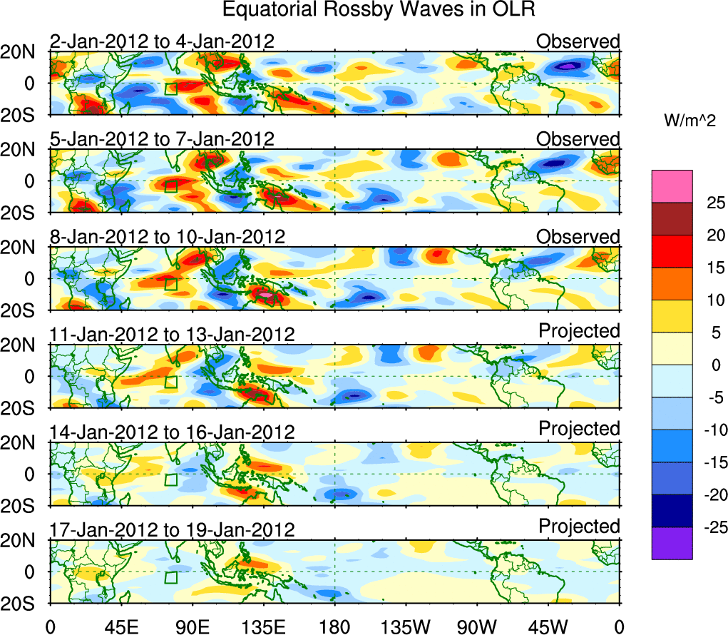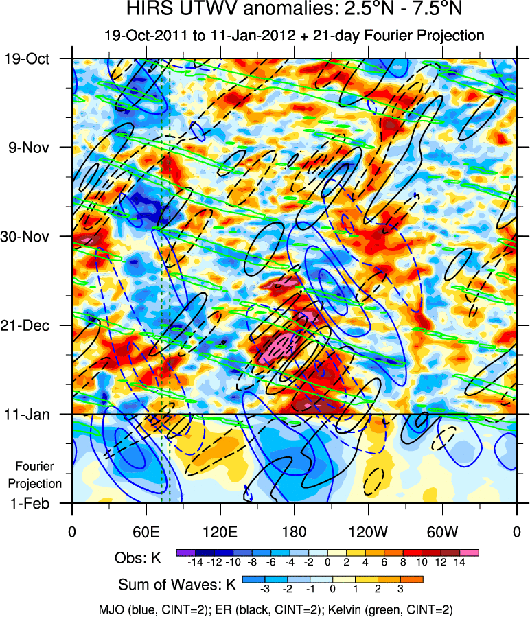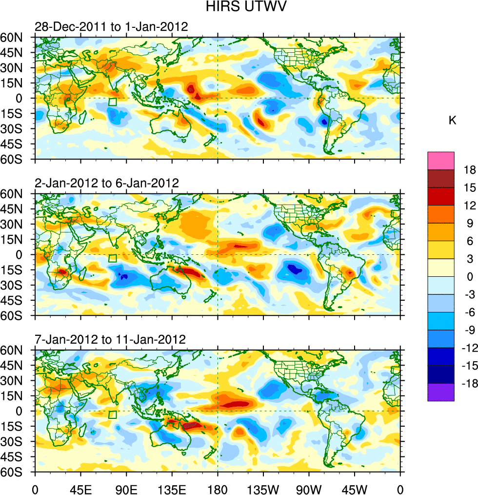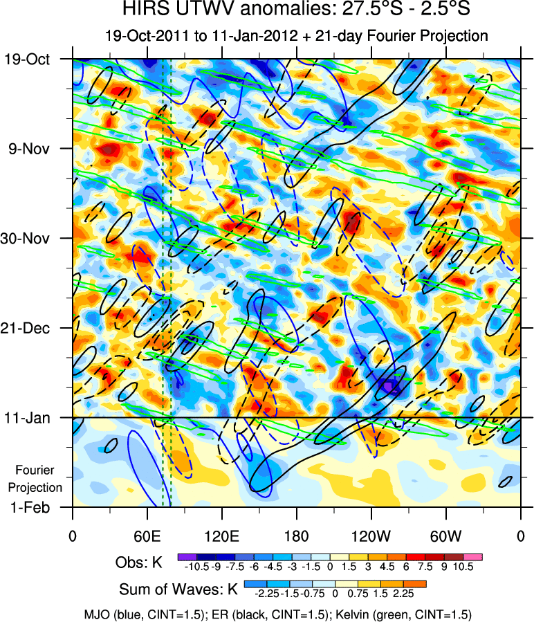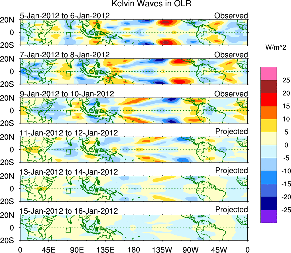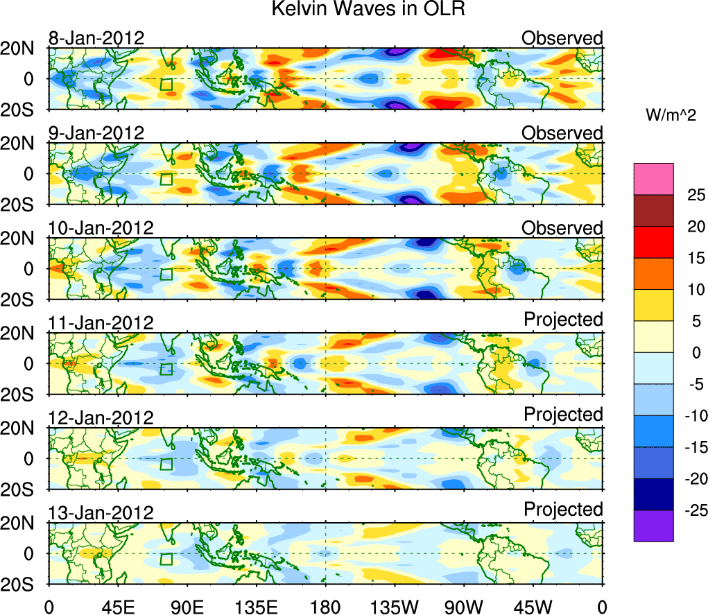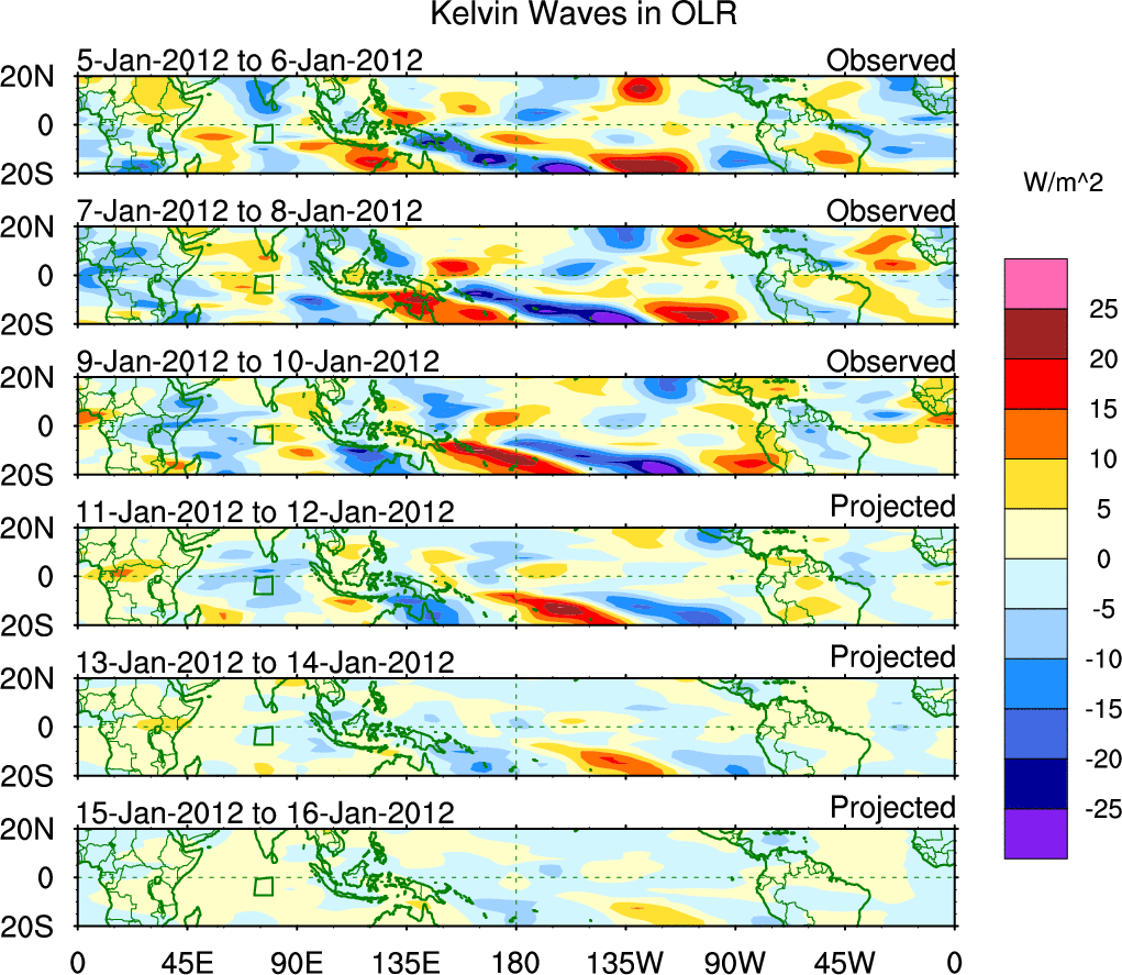 To identify tropical waves in near real-time, the OLR and UTWV data are filtered following Wheeler & Weickmann (2001 MWR). The daily anomalies are calculated using the first 3 harmonics of the seasonal cycle for 1979–2009. Missing values are then filled using linear interpolation in space and time. The most recent 365 days of anomalies are padded with 659 days of zeroes, and the result is filtered for each wave type.