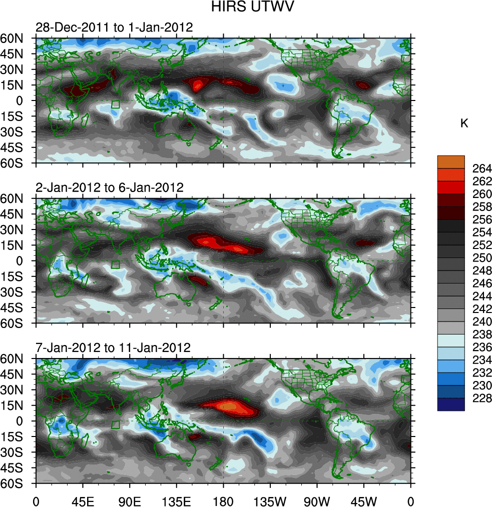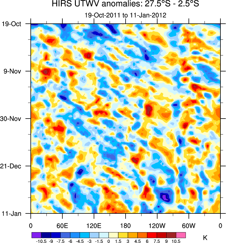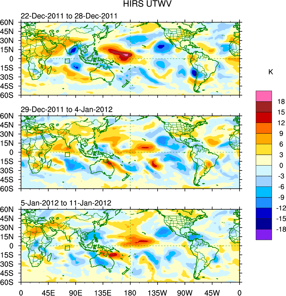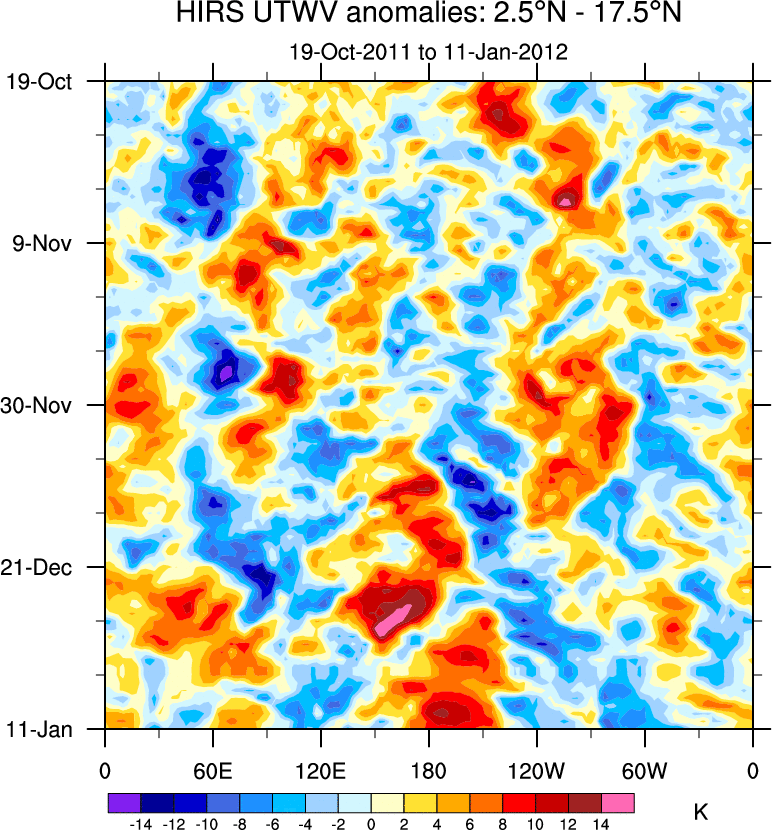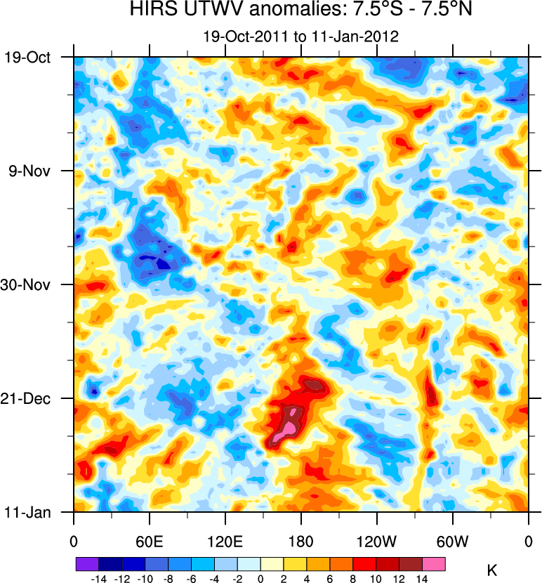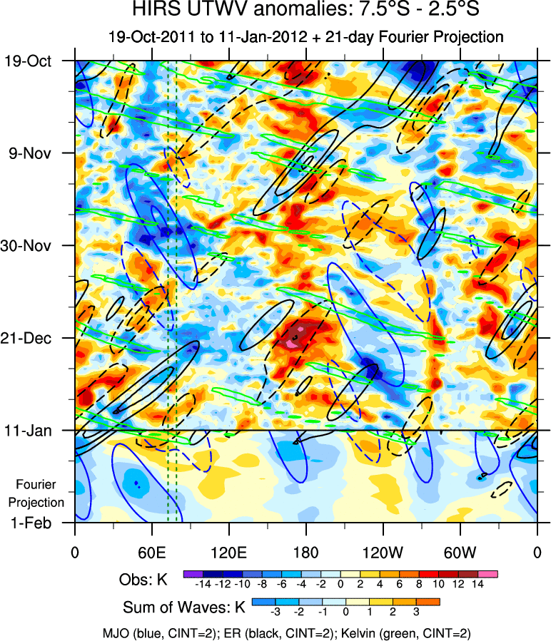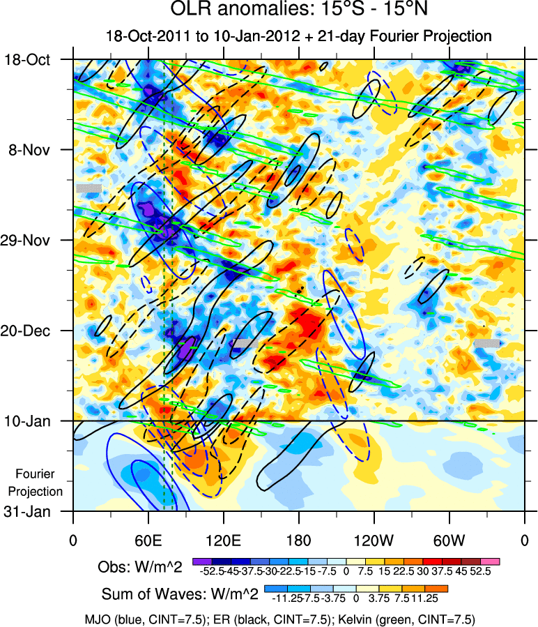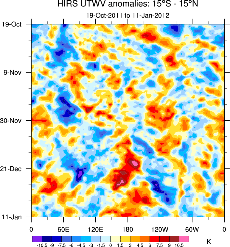 To identify tropical waves in near real-time, the OLR and UTWV data are filtered following Wheeler & Weickmann (2001 MWR). The daily anomalies are calculated using the first 3 harmonics of the seasonal cycle for 1979–2009. Missing values are then filled using linear interpolation in space and time. The most recent 365 days of anomalies are padded with 659 days of zeroes, and the result is filtered for each wave type.