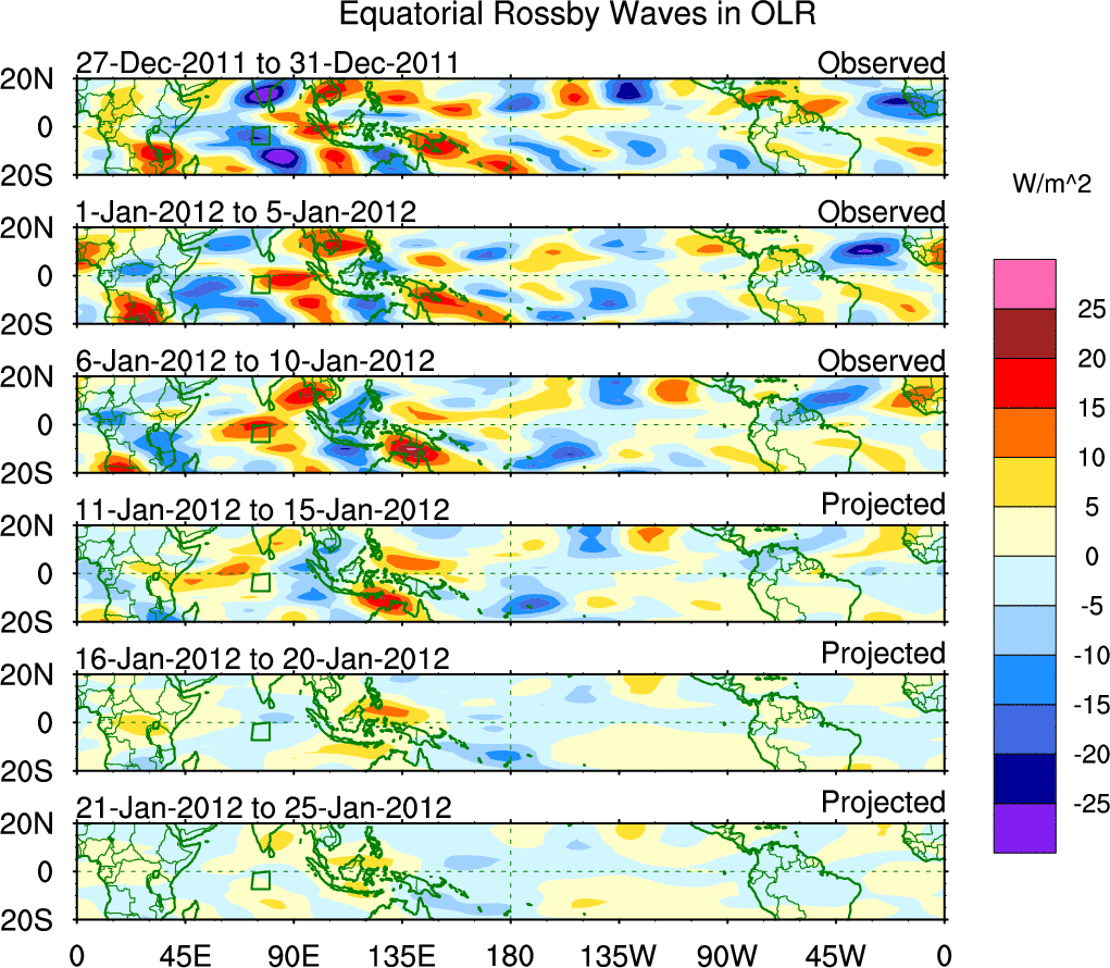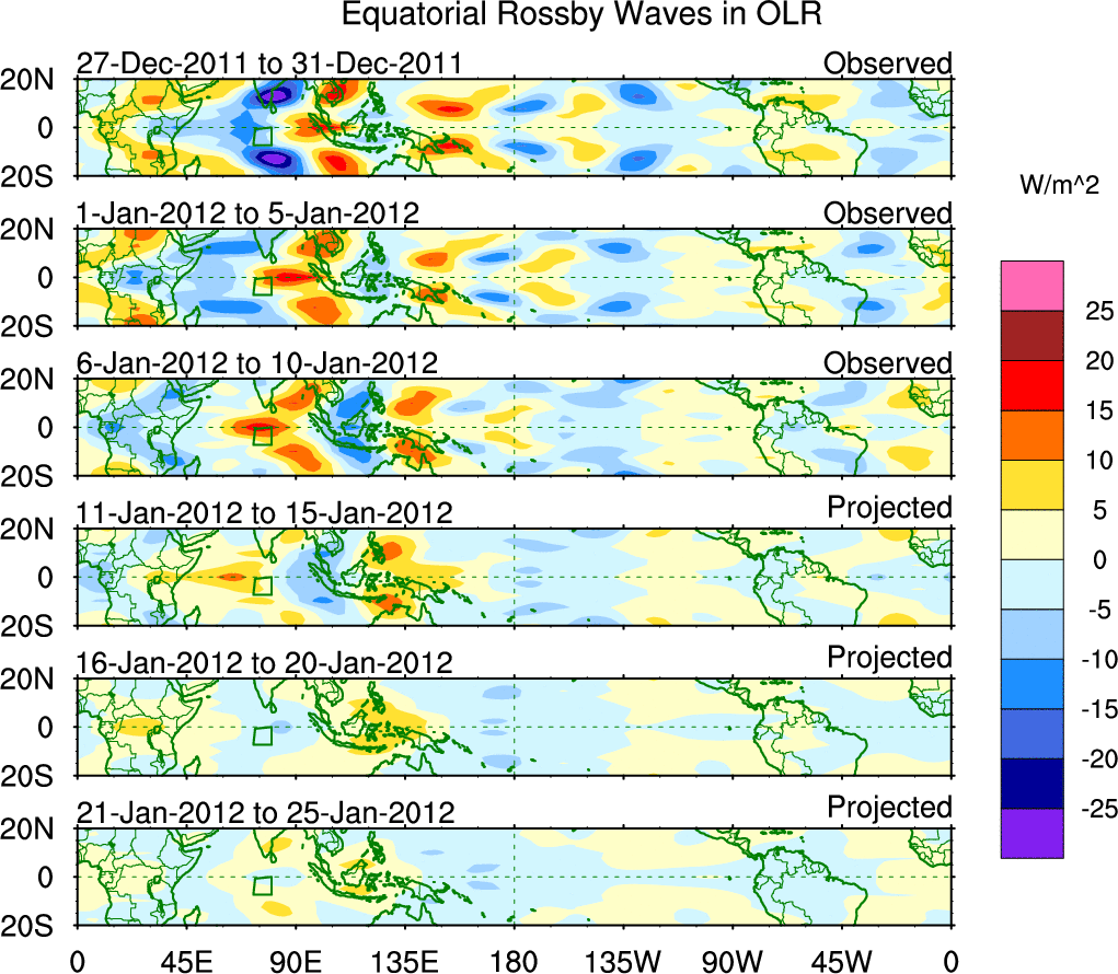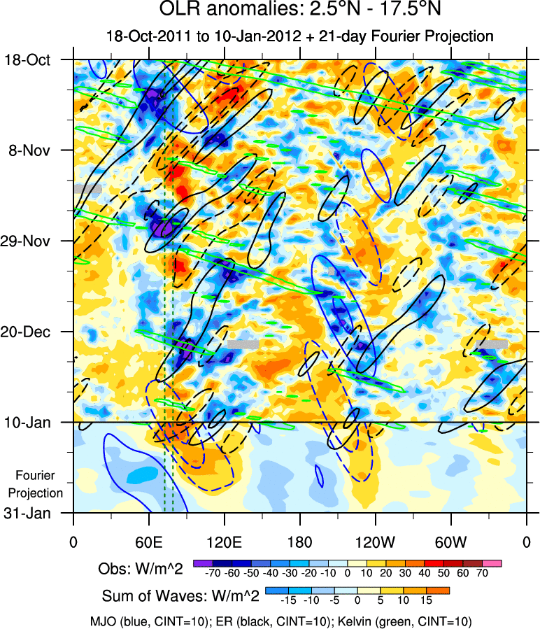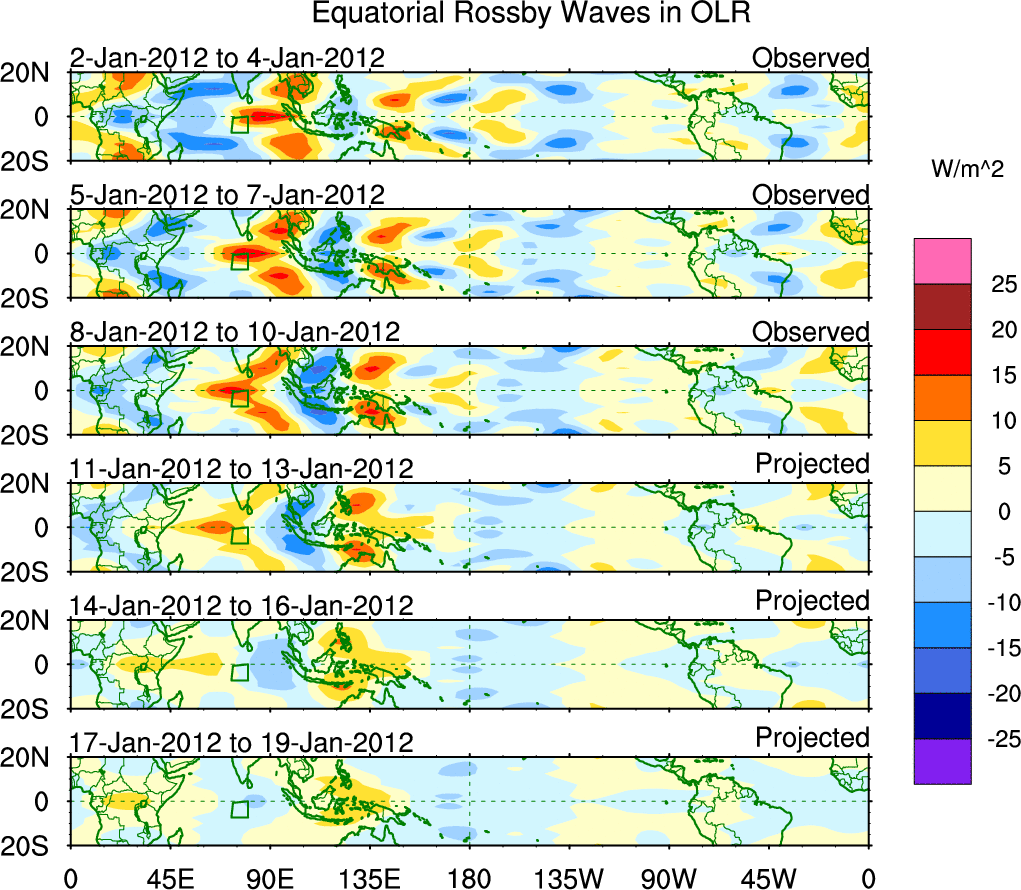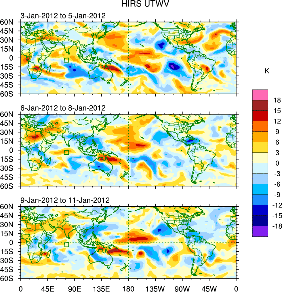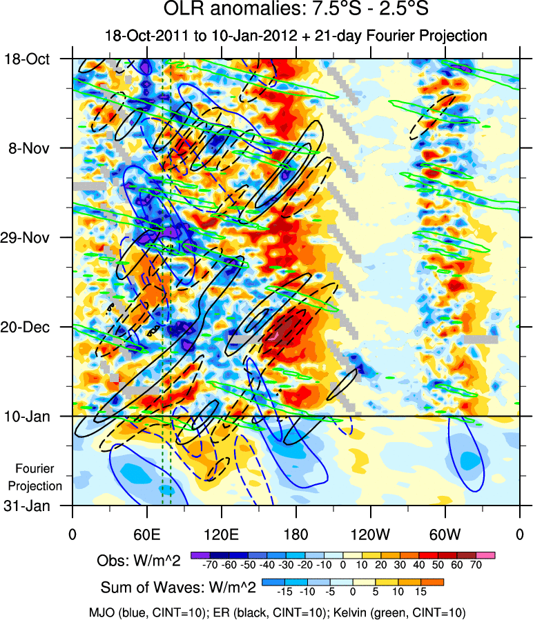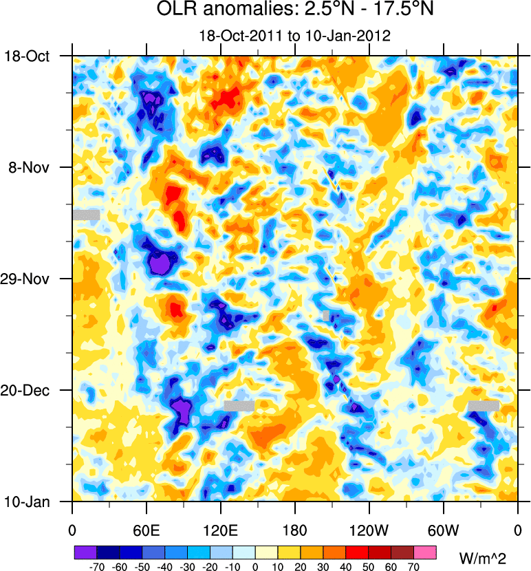 To identify tropical waves in near real-time, the OLR and UTWV data are filtered following Wheeler & Weickmann (2001 MWR). The daily anomalies are calculated using the first 3 harmonics of the seasonal cycle for 1979–2009. Missing values are then filled using linear interpolation in space and time. The most recent 365 days of anomalies are padded with 659 days of zeroes, and the result is filtered for each wave type.
