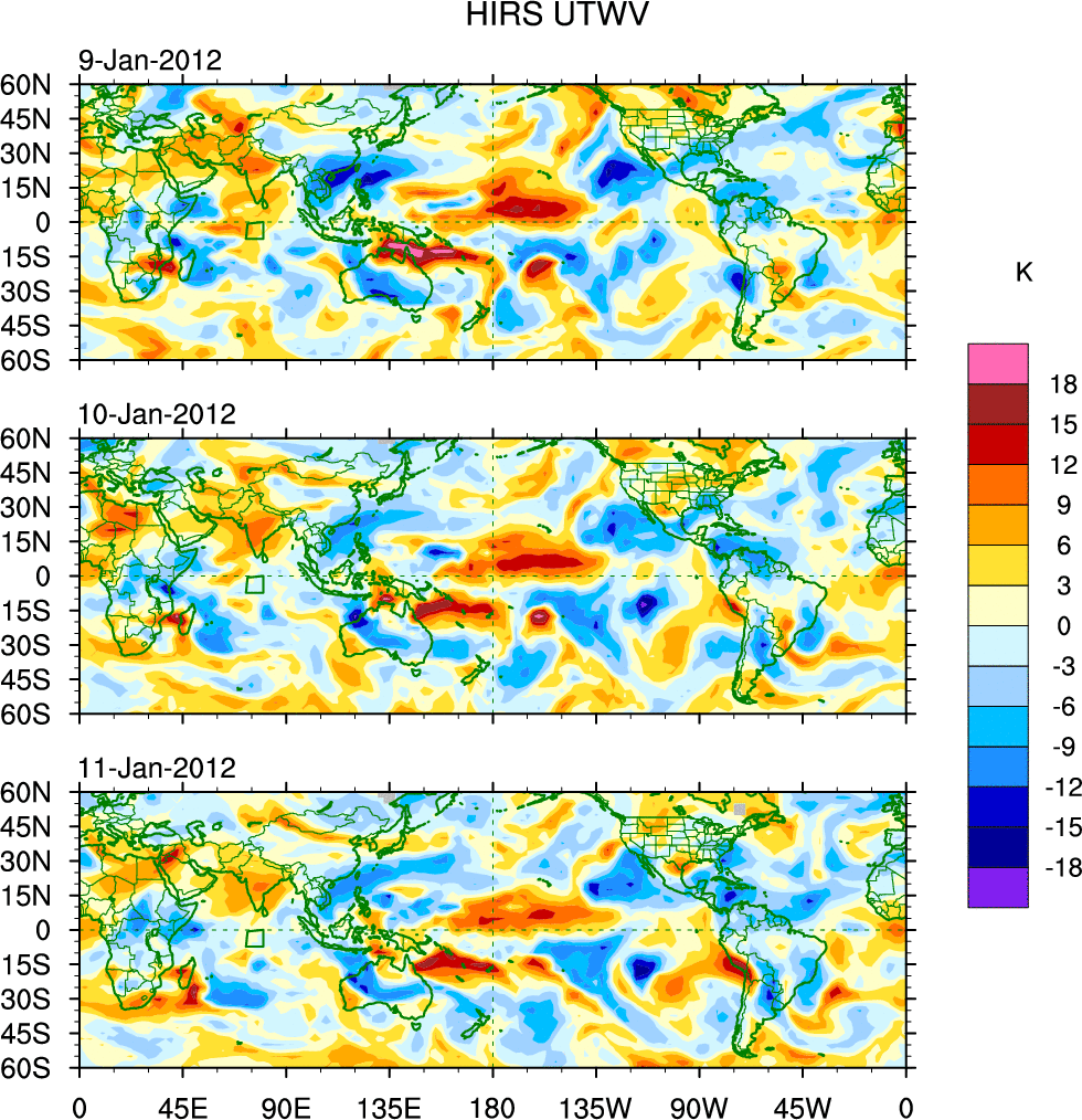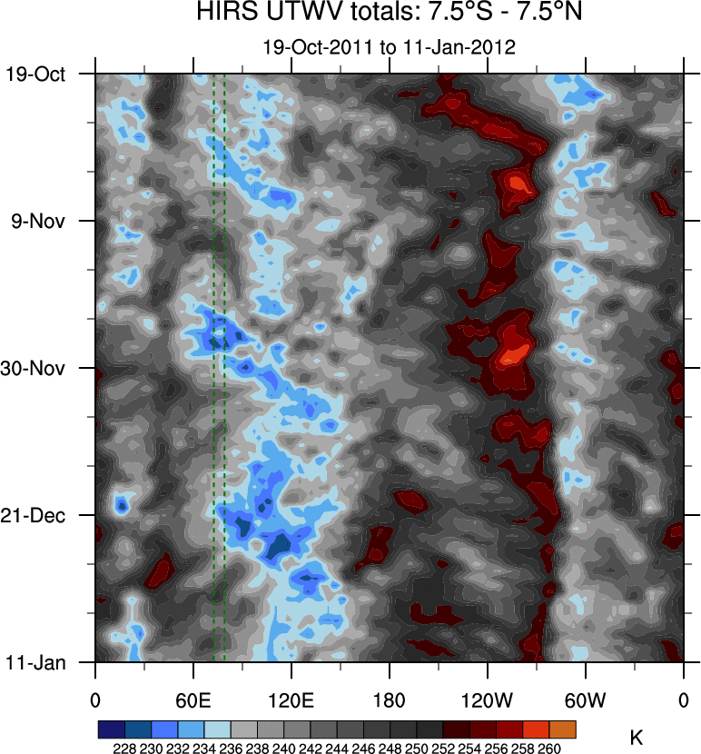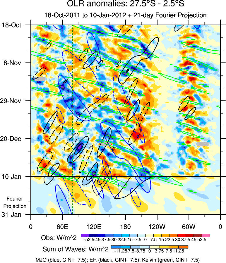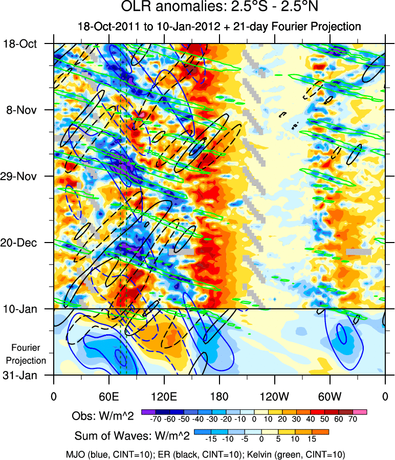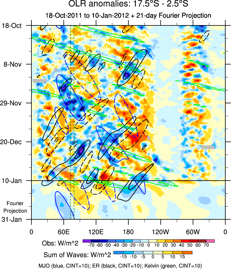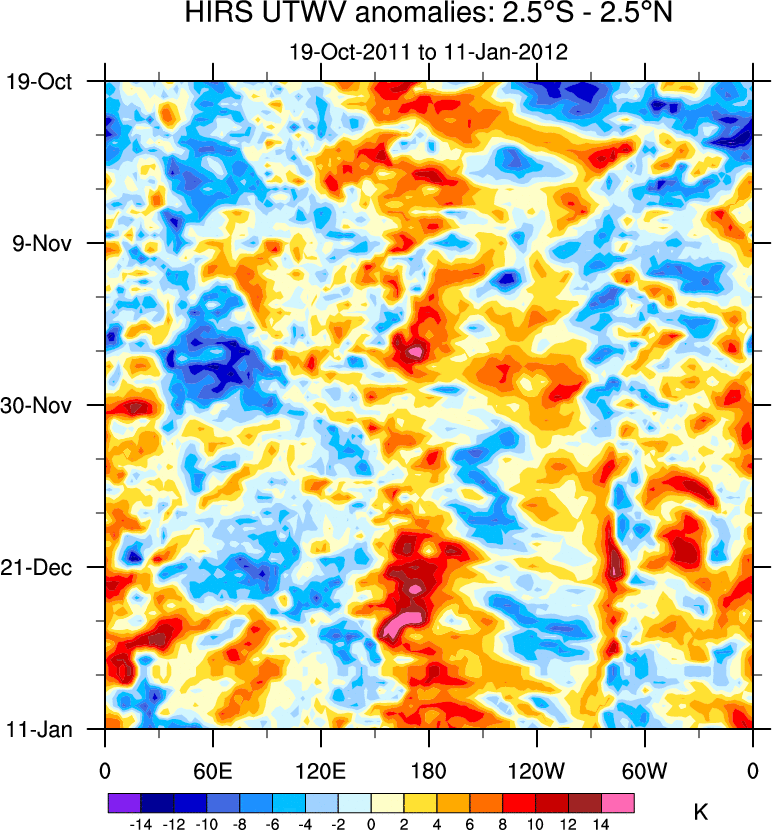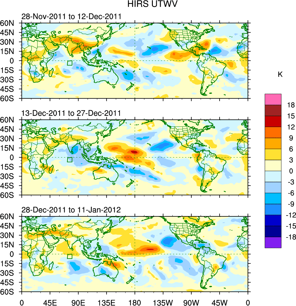 To identify tropical waves in near real-time, the OLR and UTWV data are filtered following Wheeler & Weickmann (2001 MWR). The daily anomalies are calculated using the first 3 harmonics of the seasonal cycle for 1979–2009. Missing values are then filled using linear interpolation in space and time. The most recent 365 days of anomalies are padded with 659 days of zeroes, and the result is filtered for each wave type.