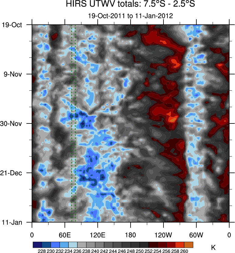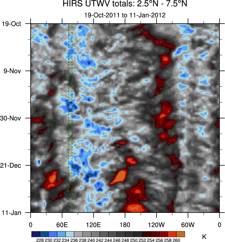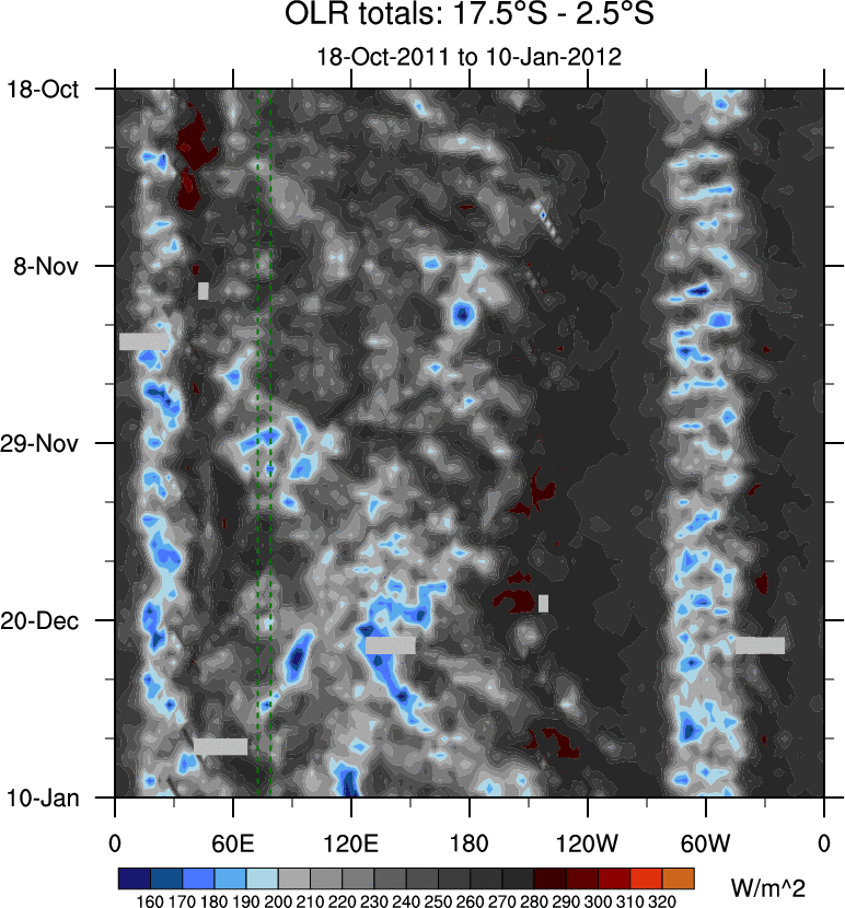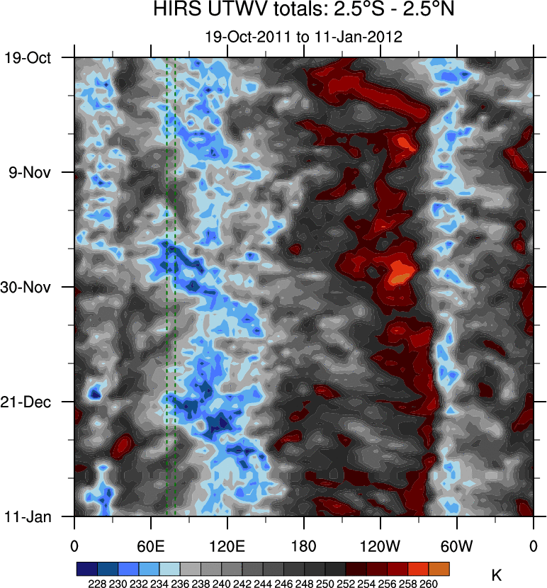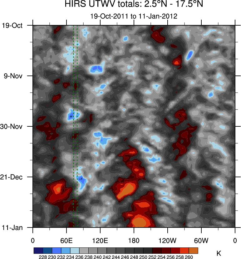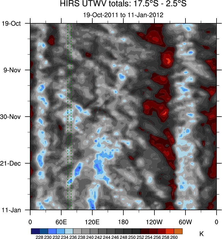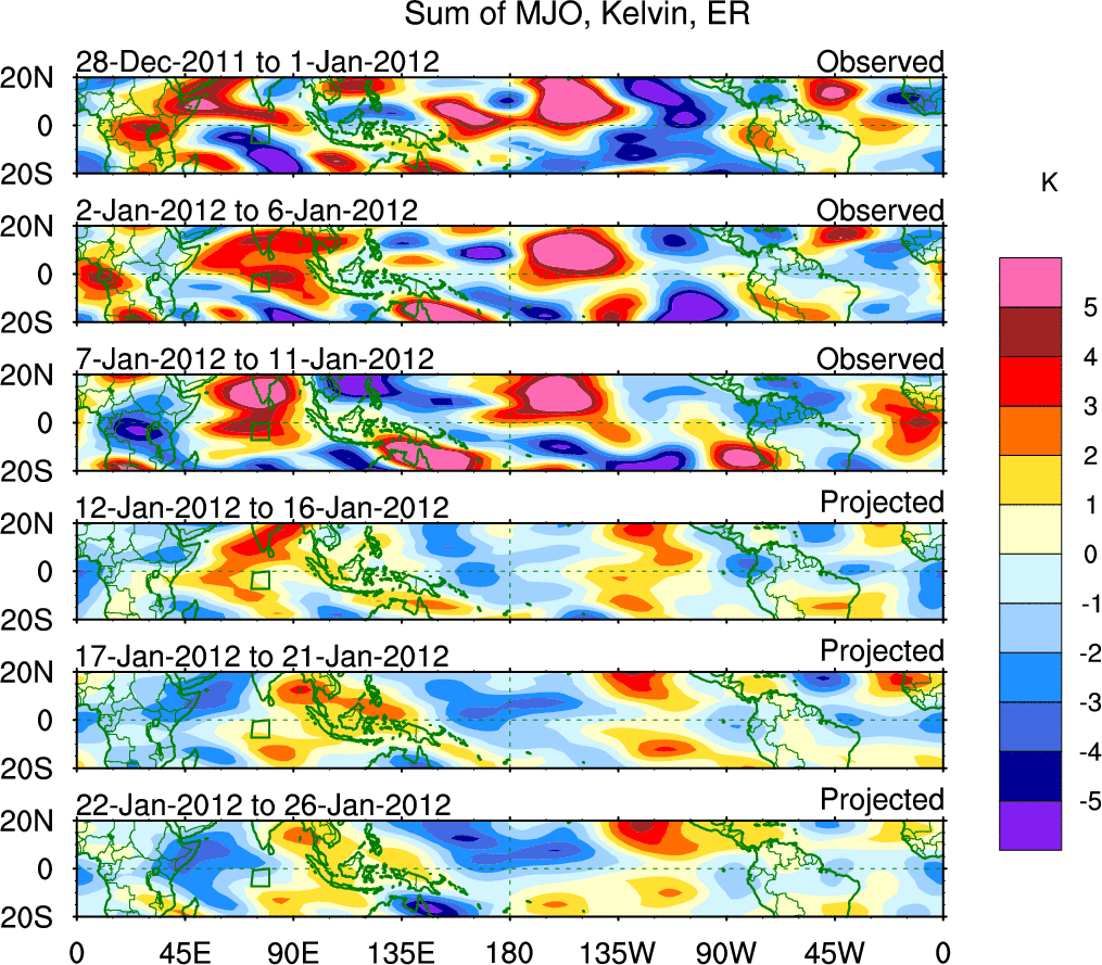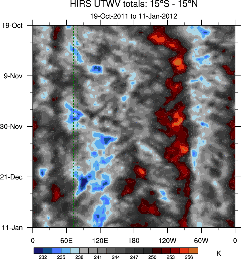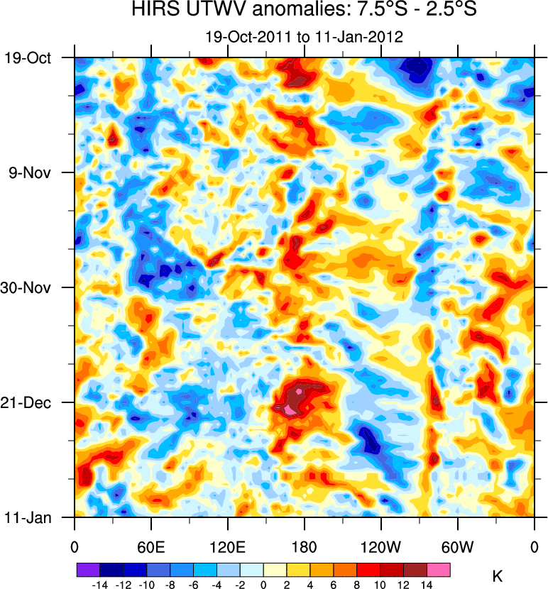 To identify tropical waves in near real-time, the OLR and UTWV data are filtered following Wheeler & Weickmann (2001 MWR). The daily anomalies are calculated using the first 3 harmonics of the seasonal cycle for 1979–2009. Missing values are then filled using linear interpolation in space and time. The most recent 365 days of anomalies are padded with 659 days of zeroes, and the result is filtered for each wave type.
