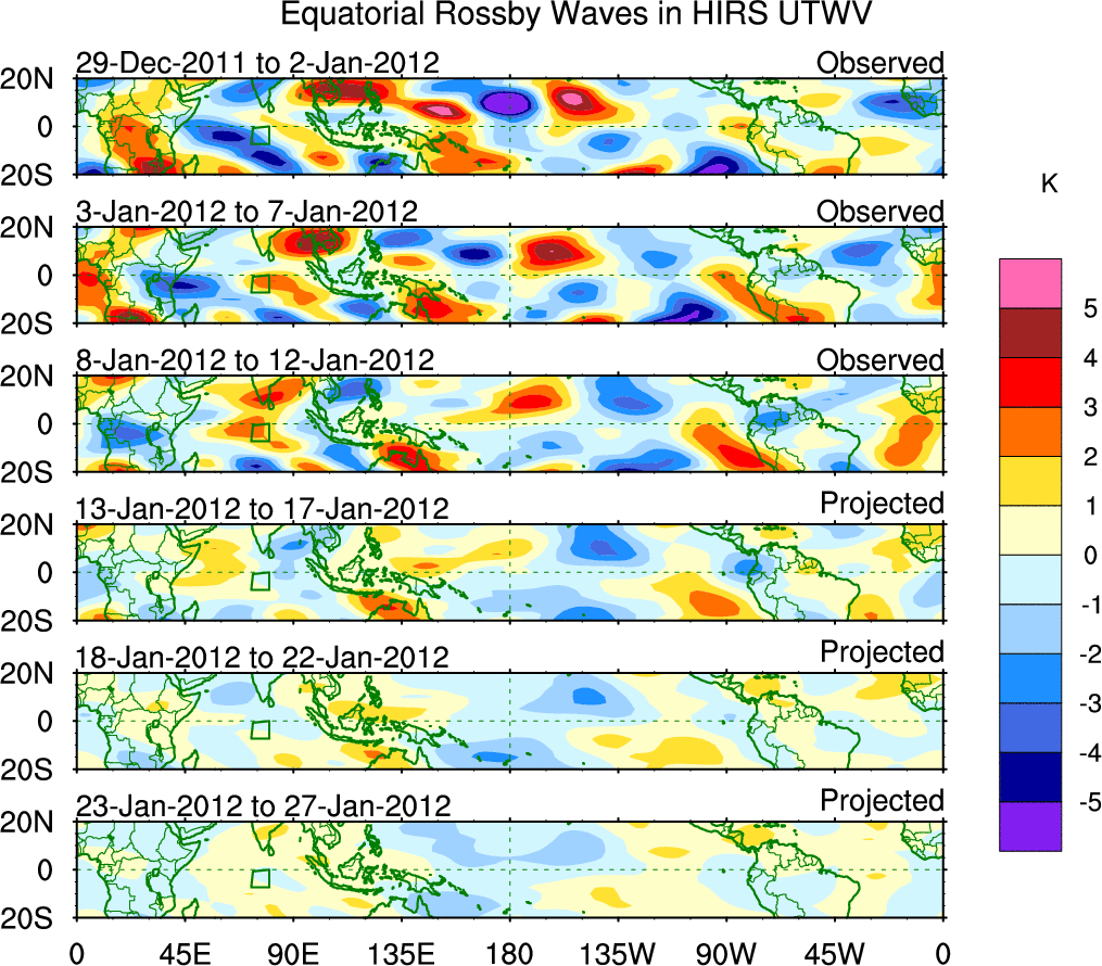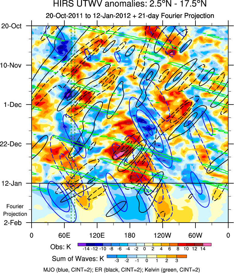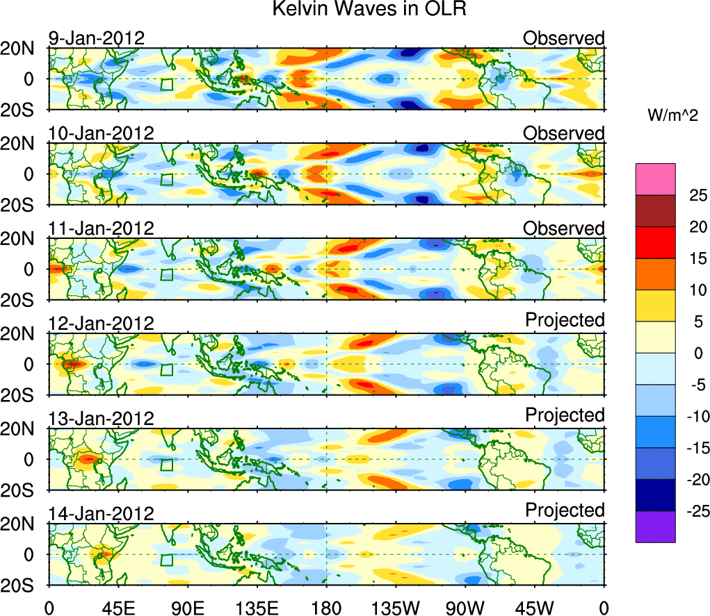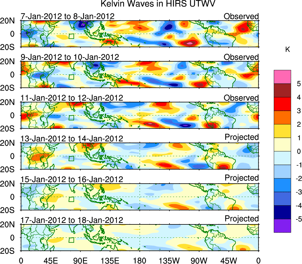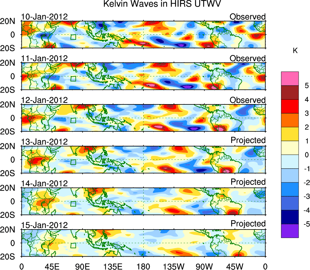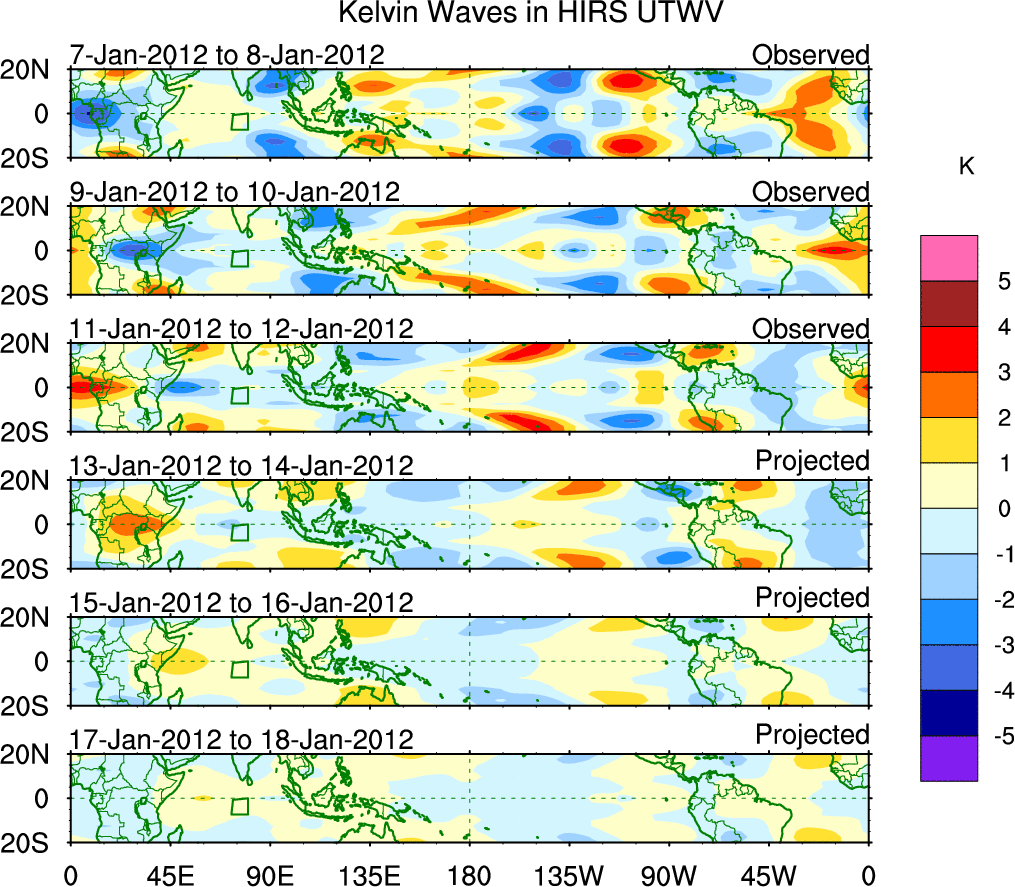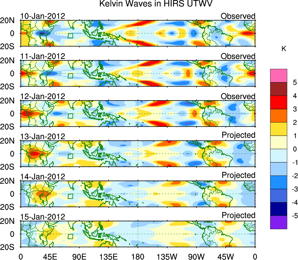 To identify tropical waves in near real-time, the OLR and UTWV data are filtered following Wheeler & Weickmann (2001 MWR). The daily anomalies are calculated using the first 3 harmonics of the seasonal cycle for 1979–2009. Missing values are then filled using linear interpolation in space and time. The most recent 365 days of anomalies are padded with 659 days of zeroes, and the result is filtered for each wave type.