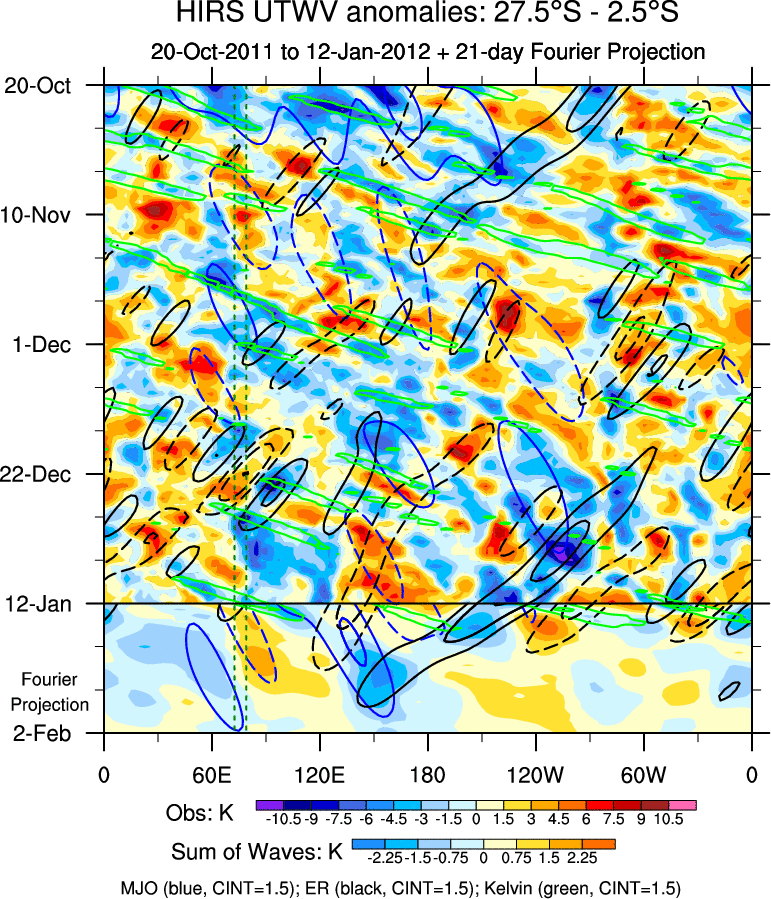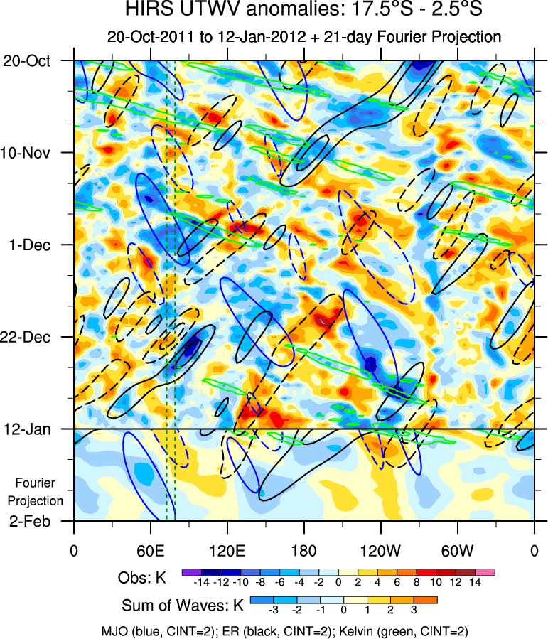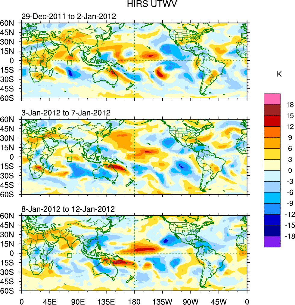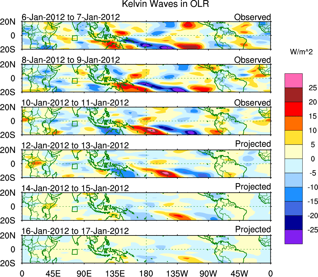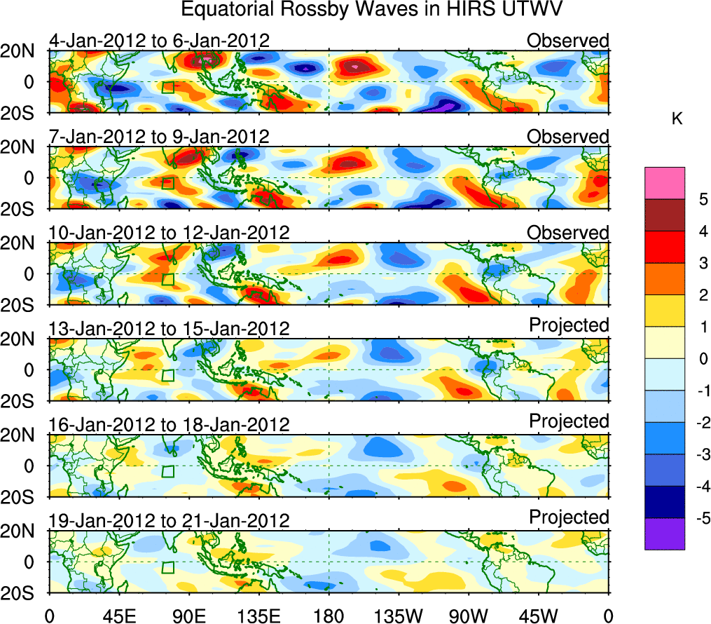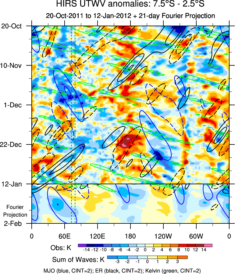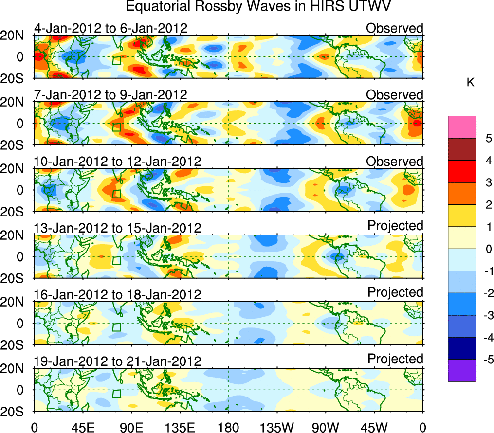 To identify tropical waves in near real-time, the OLR and UTWV data are filtered following Wheeler & Weickmann (2001 MWR). The daily anomalies are calculated using the first 3 harmonics of the seasonal cycle for 1979–2009. Missing values are then filled using linear interpolation in space and time. The most recent 365 days of anomalies are padded with 659 days of zeroes, and the result is filtered for each wave type.