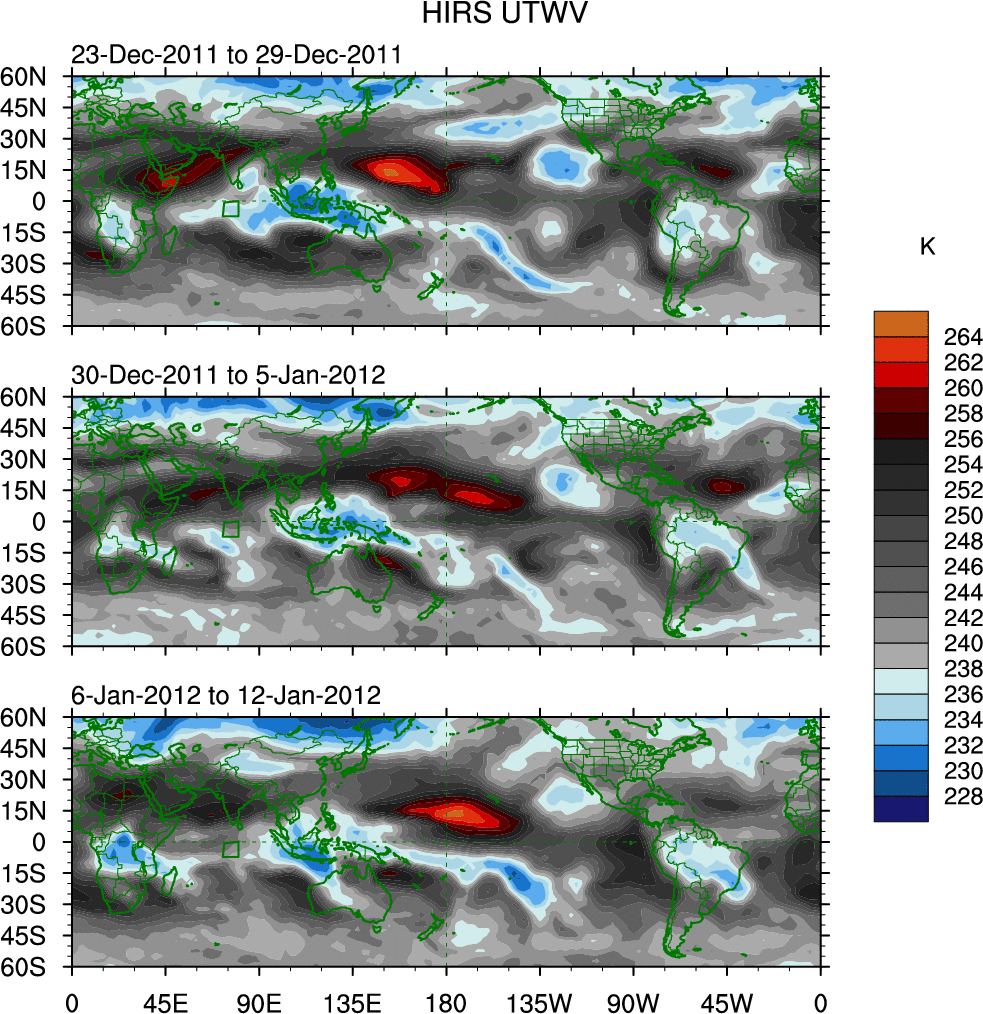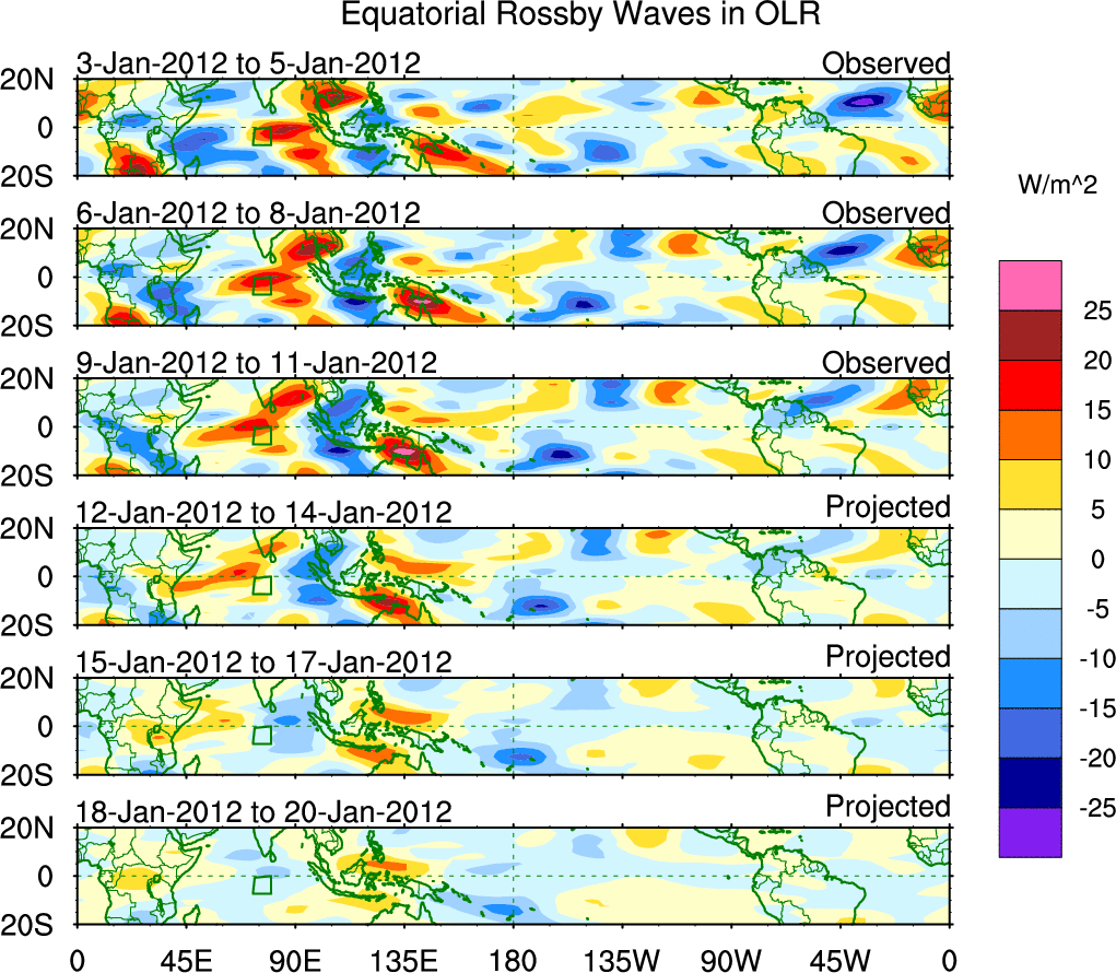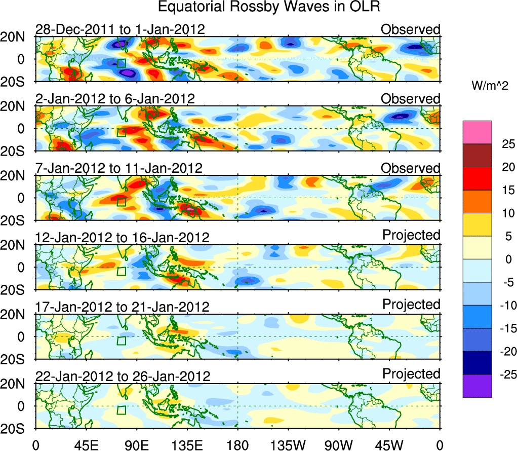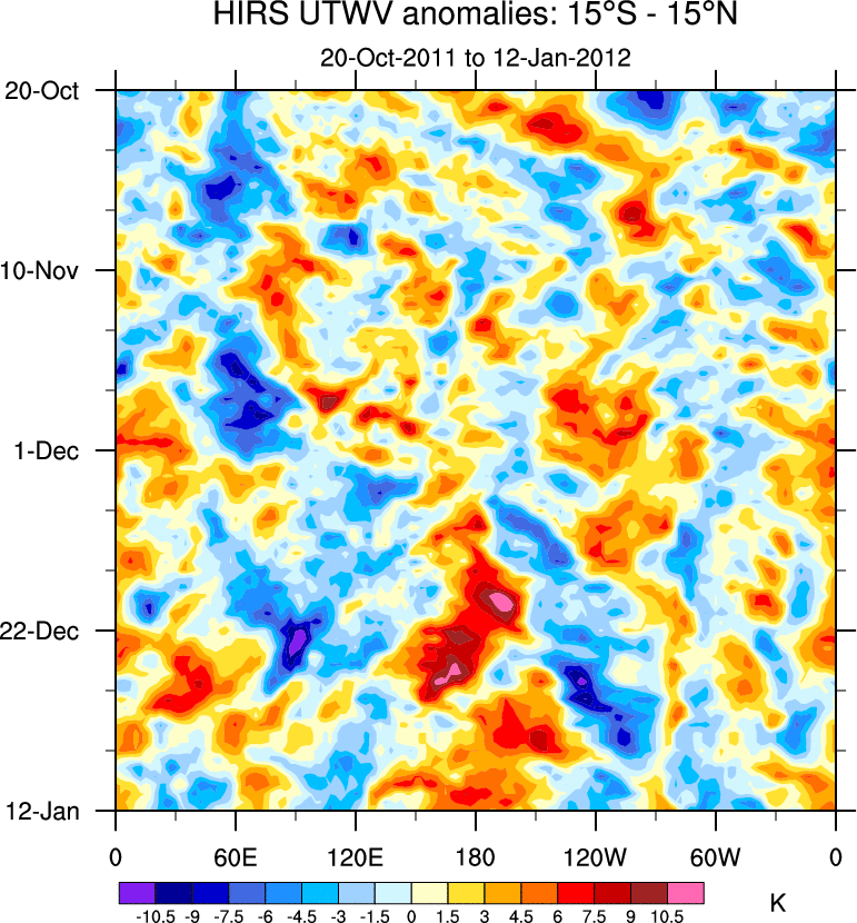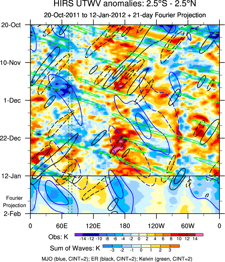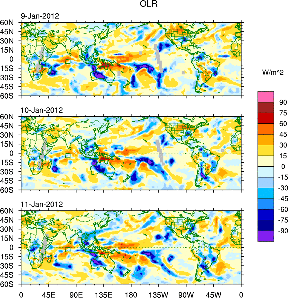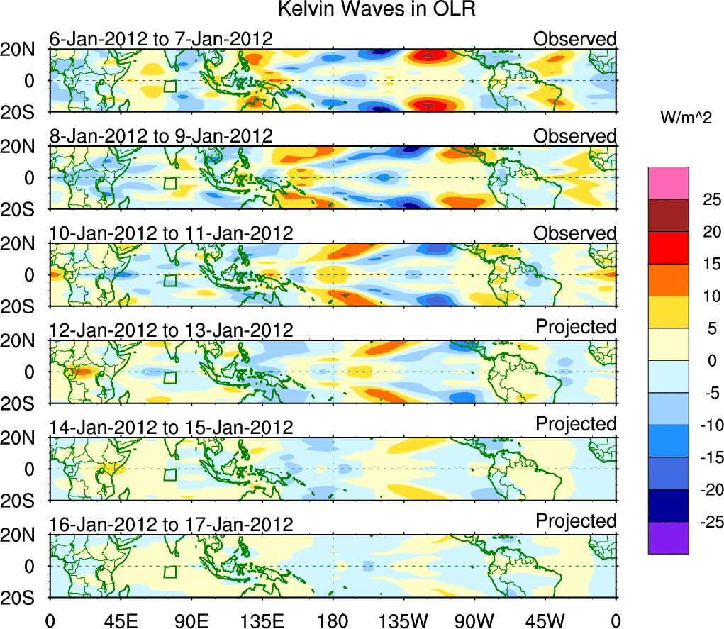 To identify tropical waves in near real-time, the OLR and UTWV data are filtered following Wheeler & Weickmann (2001 MWR). The daily anomalies are calculated using the first 3 harmonics of the seasonal cycle for 1979–2009. Missing values are then filled using linear interpolation in space and time. The most recent 365 days of anomalies are padded with 659 days of zeroes, and the result is filtered for each wave type.