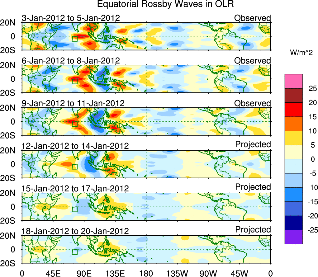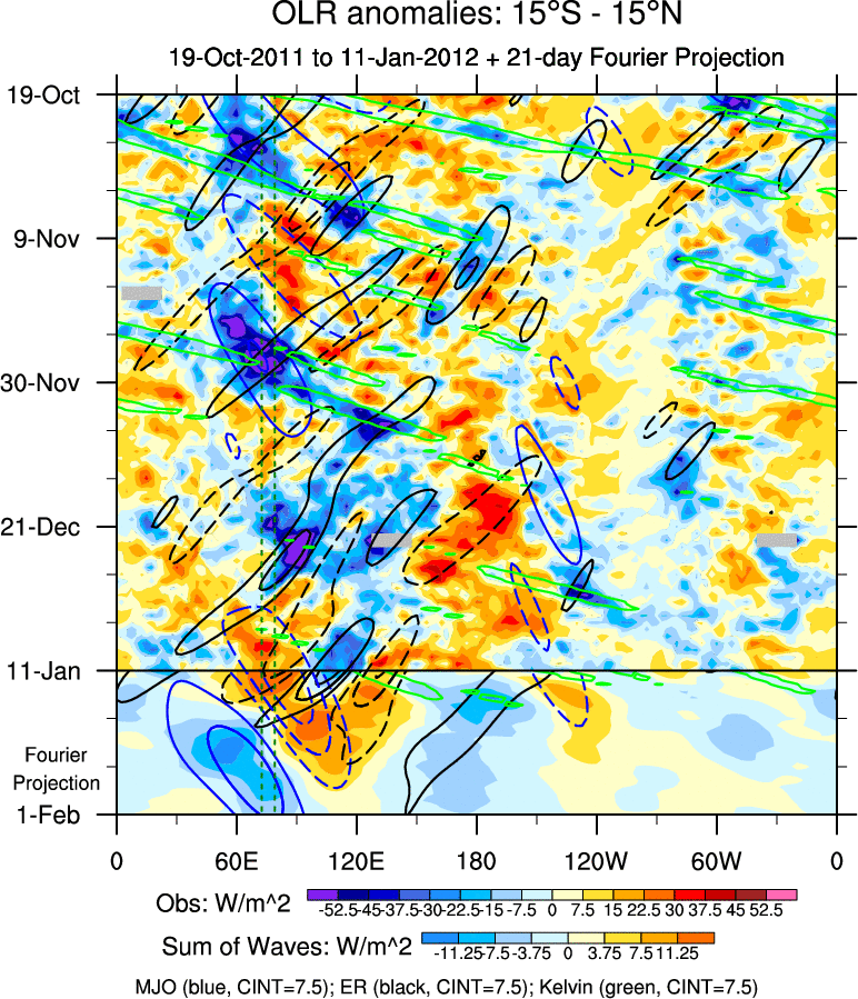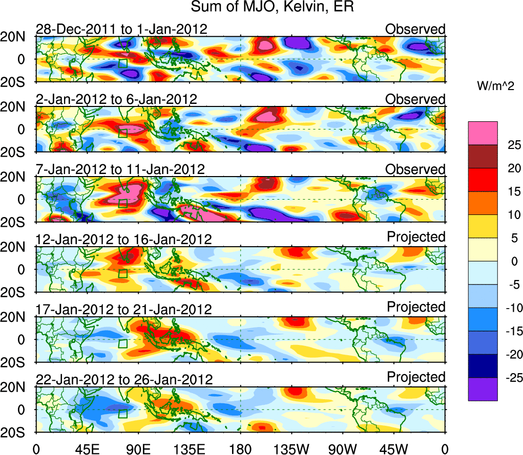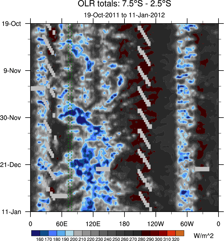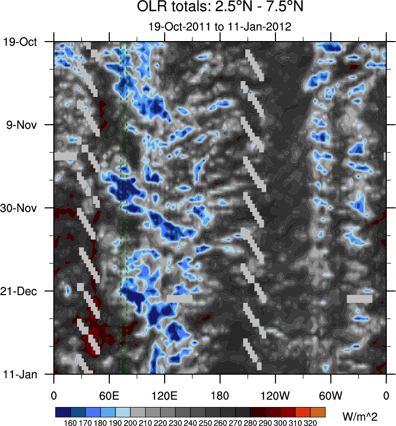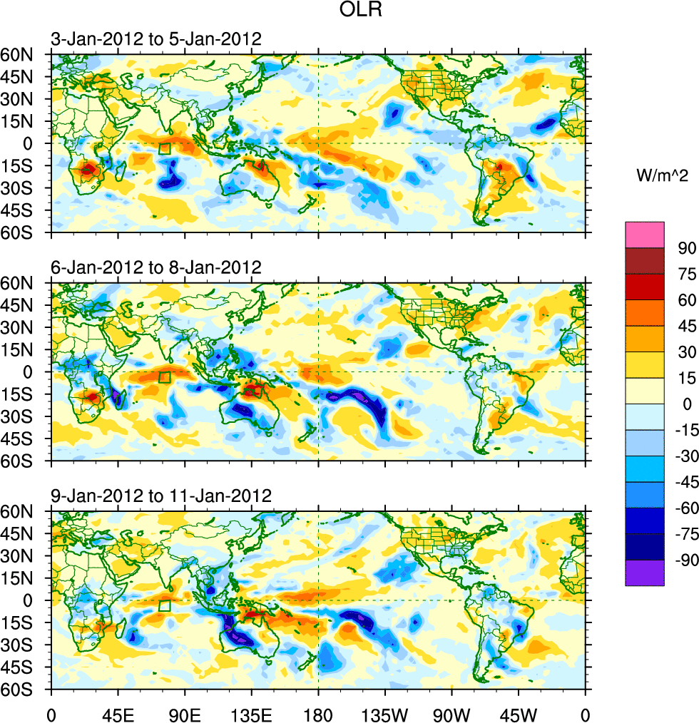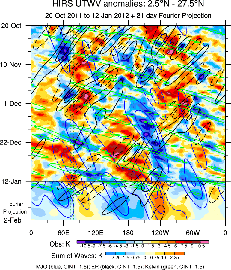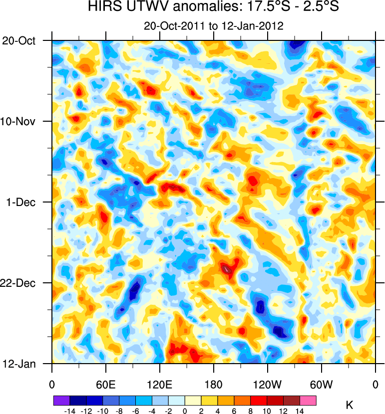 To identify tropical waves in near real-time, the OLR and UTWV data are filtered following Wheeler & Weickmann (2001 MWR). The daily anomalies are calculated using the first 3 harmonics of the seasonal cycle for 1979–2009. Missing values are then filled using linear interpolation in space and time. The most recent 365 days of anomalies are padded with 659 days of zeroes, and the result is filtered for each wave type.