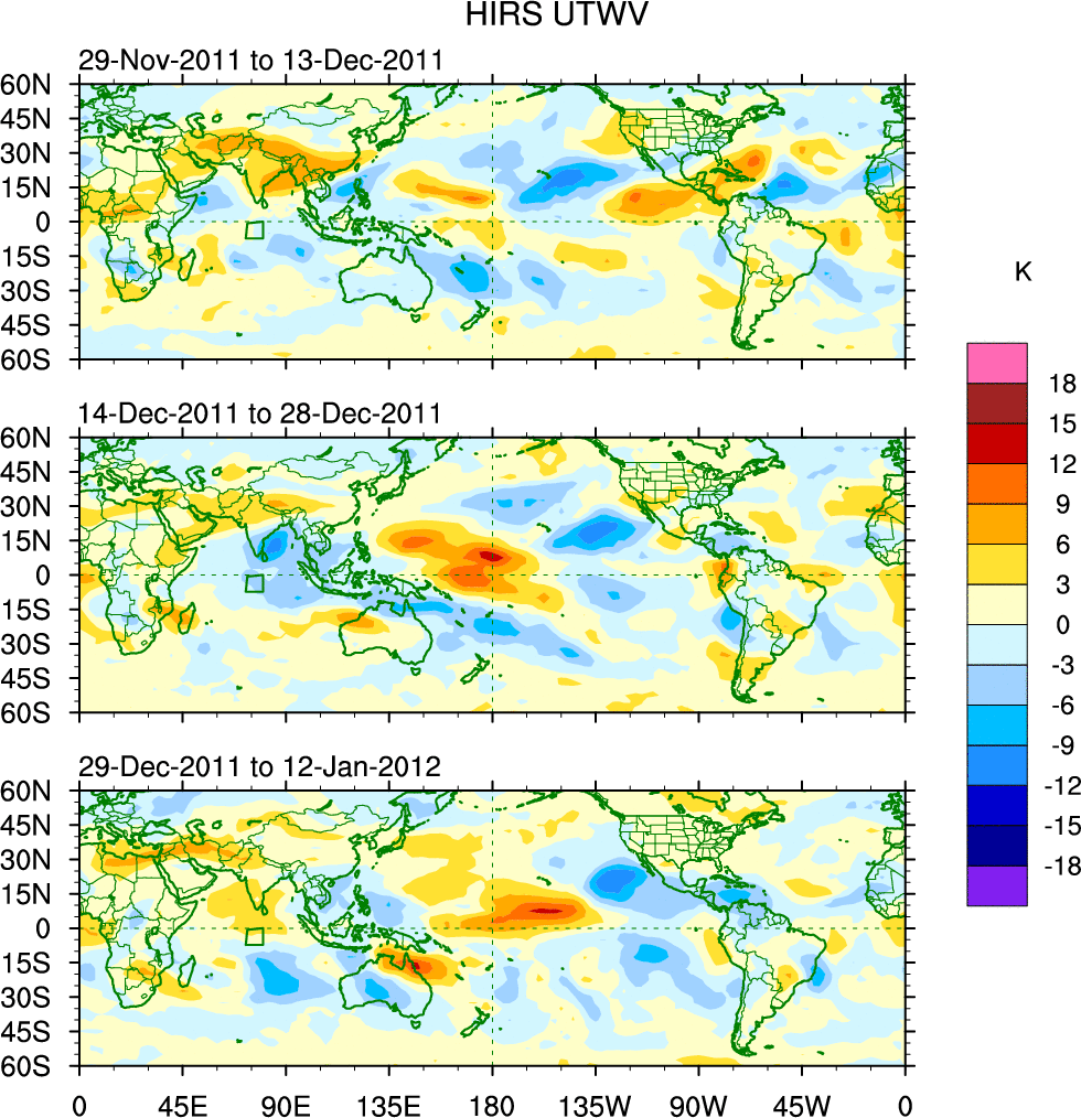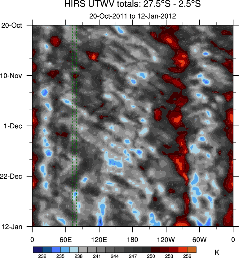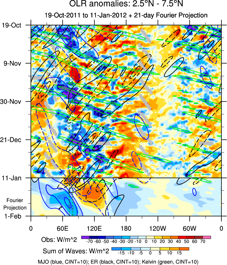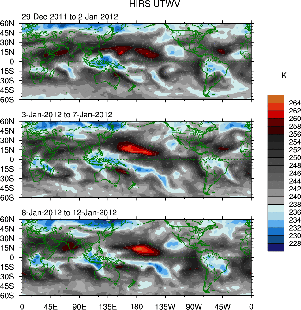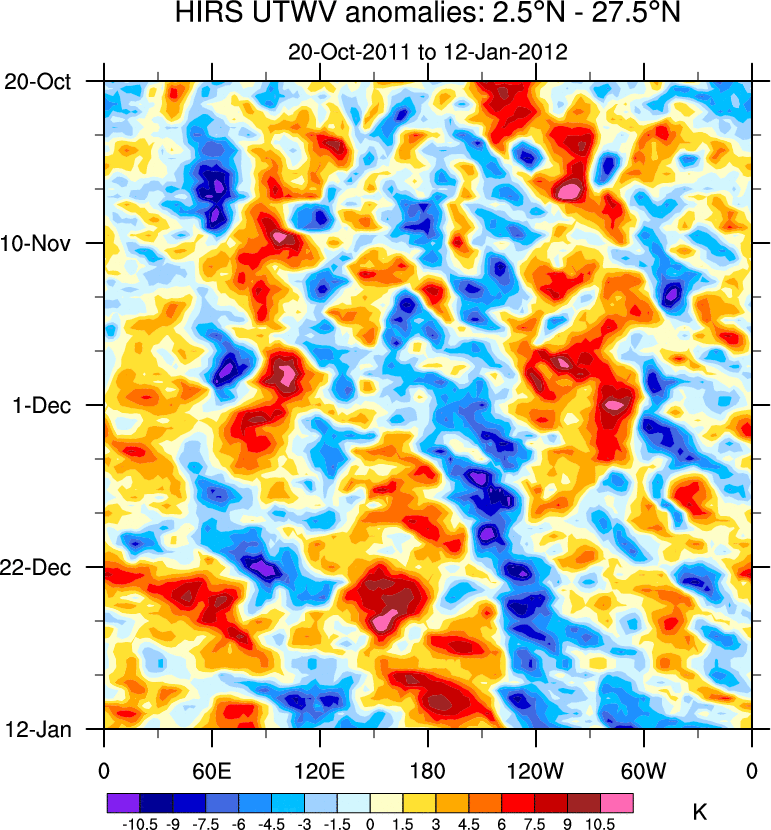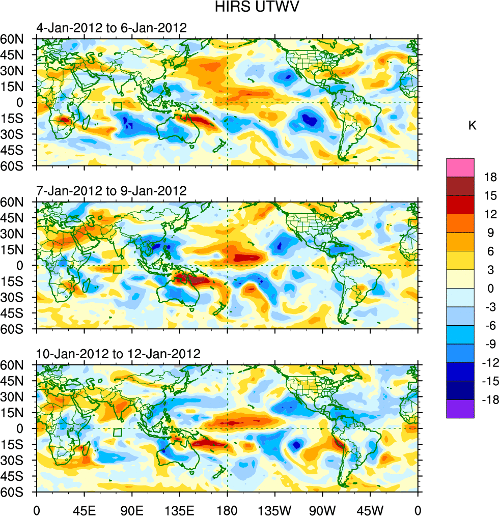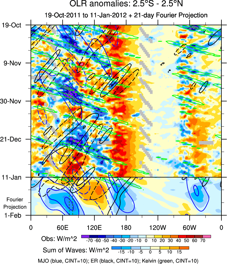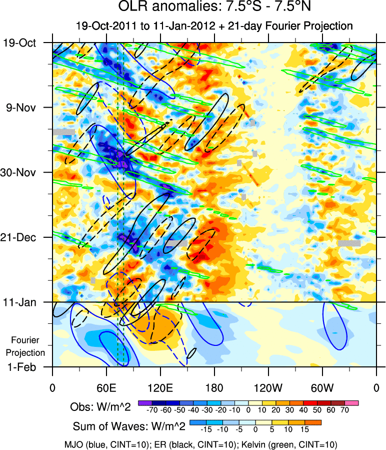 To identify tropical waves in near real-time, the OLR and UTWV data are filtered following Wheeler & Weickmann (2001 MWR). The daily anomalies are calculated using the first 3 harmonics of the seasonal cycle for 1979–2009. Missing values are then filled using linear interpolation in space and time. The most recent 365 days of anomalies are padded with 659 days of zeroes, and the result is filtered for each wave type.
