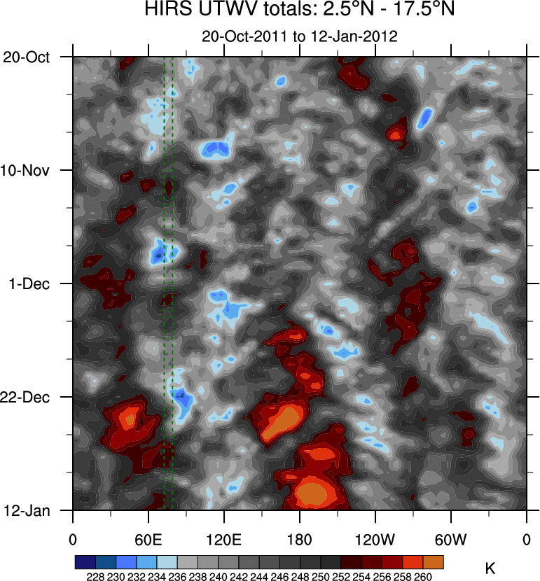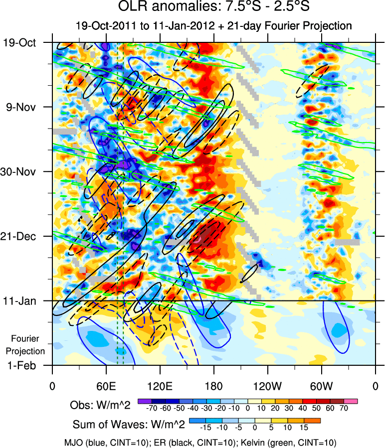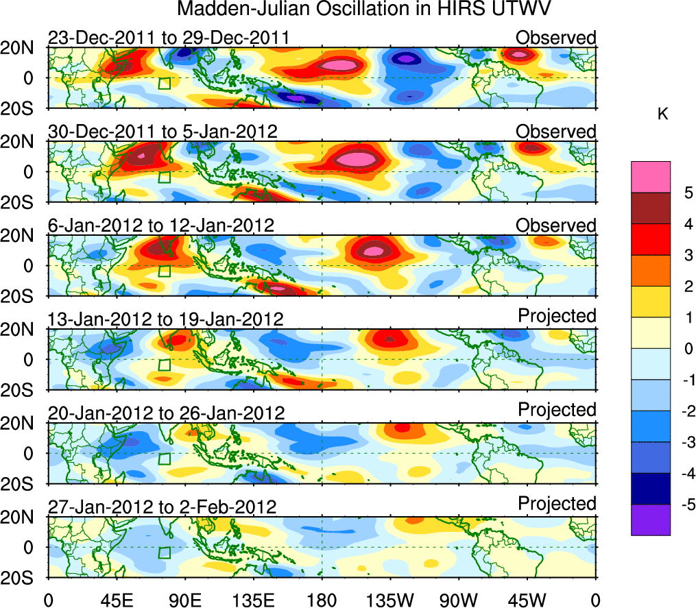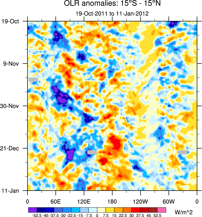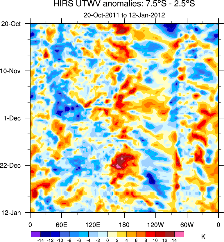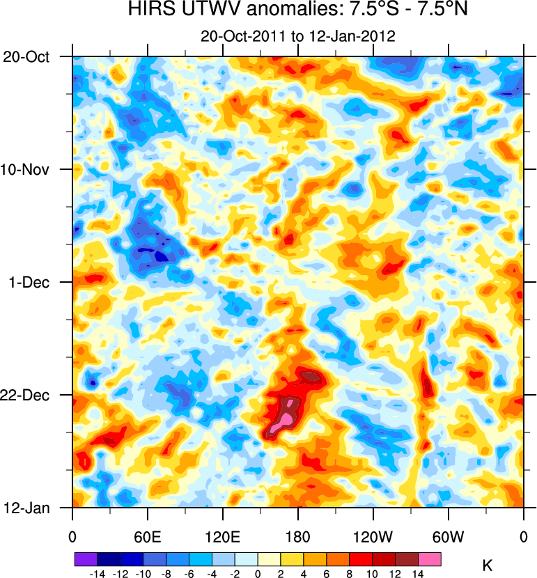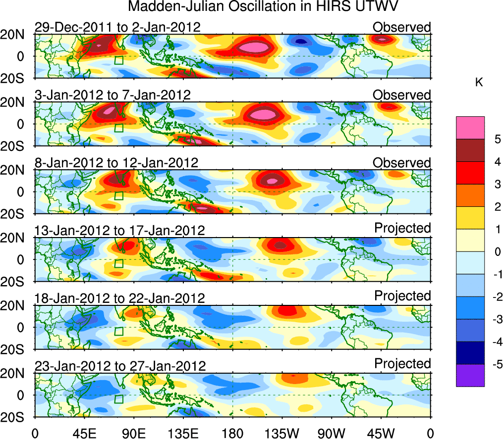 To identify tropical waves in near real-time, the OLR and UTWV data are filtered following Wheeler & Weickmann (2001 MWR). The daily anomalies are calculated using the first 3 harmonics of the seasonal cycle for 1979–2009. Missing values are then filled using linear interpolation in space and time. The most recent 365 days of anomalies are padded with 659 days of zeroes, and the result is filtered for each wave type.