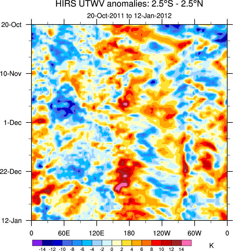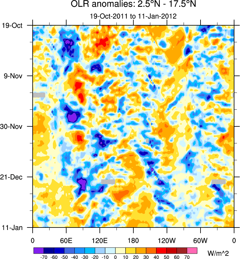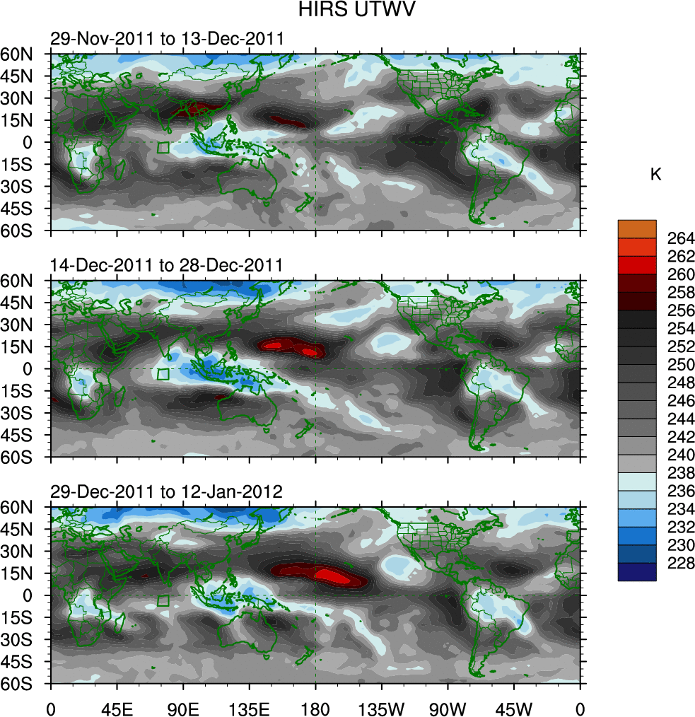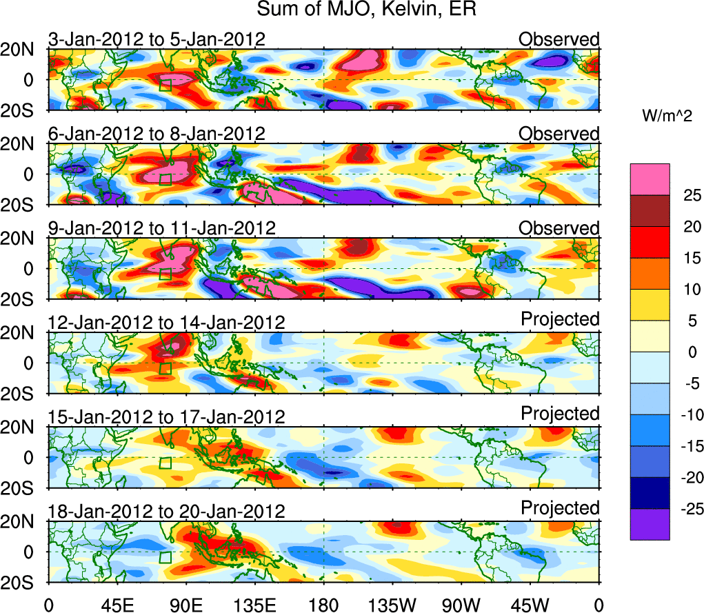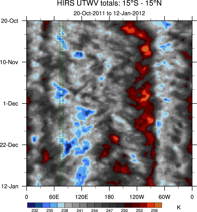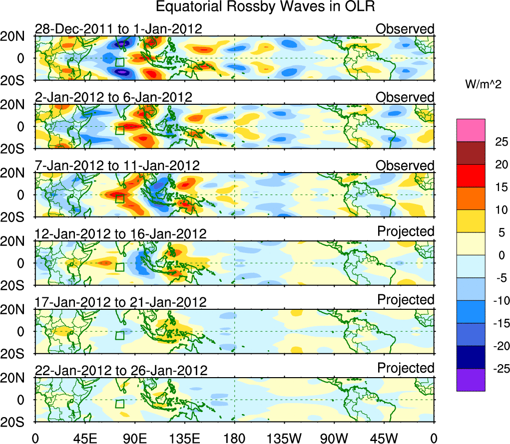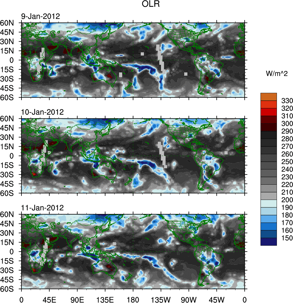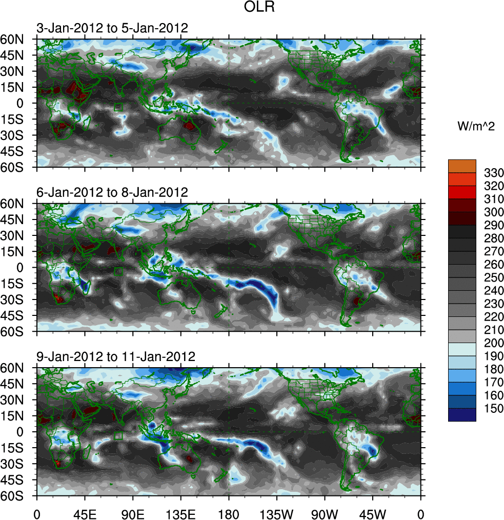 To identify tropical waves in near real-time, the OLR and UTWV data are filtered following Wheeler & Weickmann (2001 MWR). The daily anomalies are calculated using the first 3 harmonics of the seasonal cycle for 1979–2009. Missing values are then filled using linear interpolation in space and time. The most recent 365 days of anomalies are padded with 659 days of zeroes, and the result is filtered for each wave type.