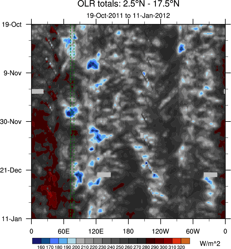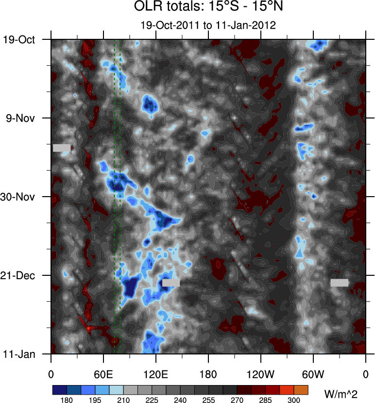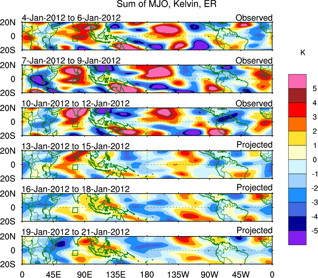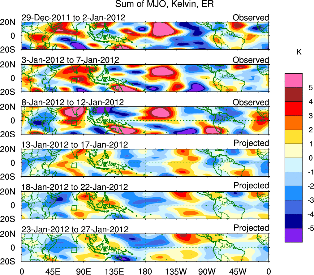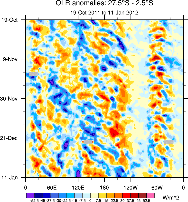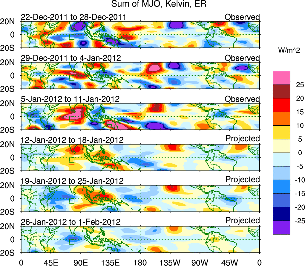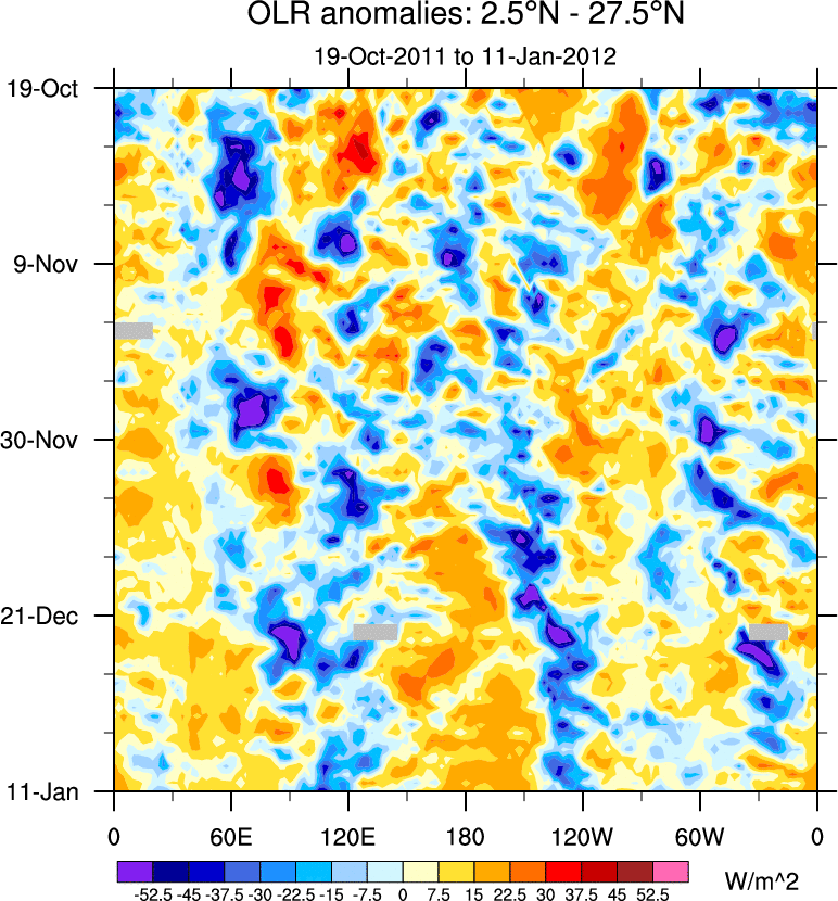 To identify tropical waves in near real-time, the OLR and UTWV data are filtered following Wheeler & Weickmann (2001 MWR). The daily anomalies are calculated using the first 3 harmonics of the seasonal cycle for 1979–2009. Missing values are then filled using linear interpolation in space and time. The most recent 365 days of anomalies are padded with 659 days of zeroes, and the result is filtered for each wave type.