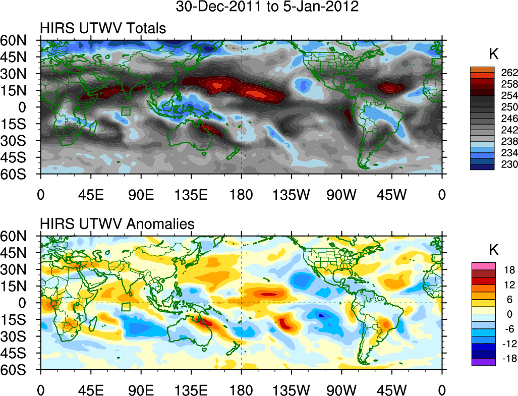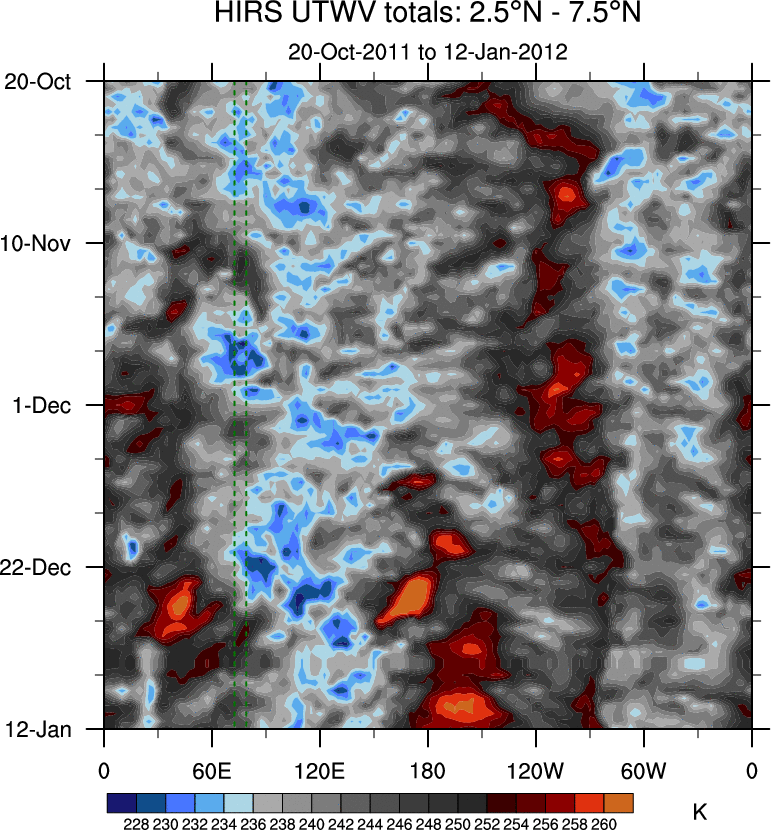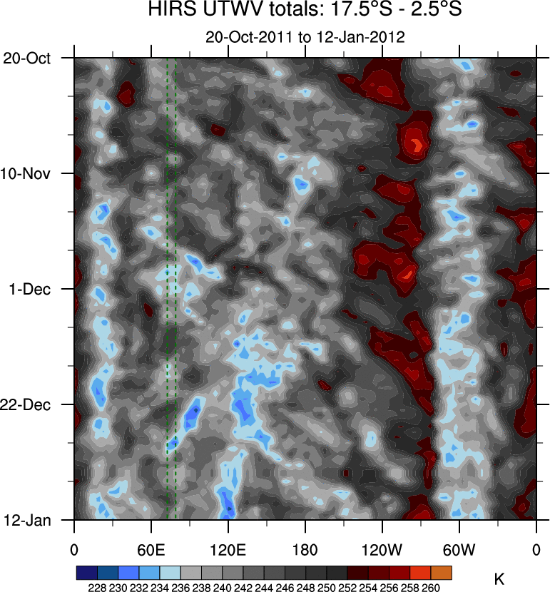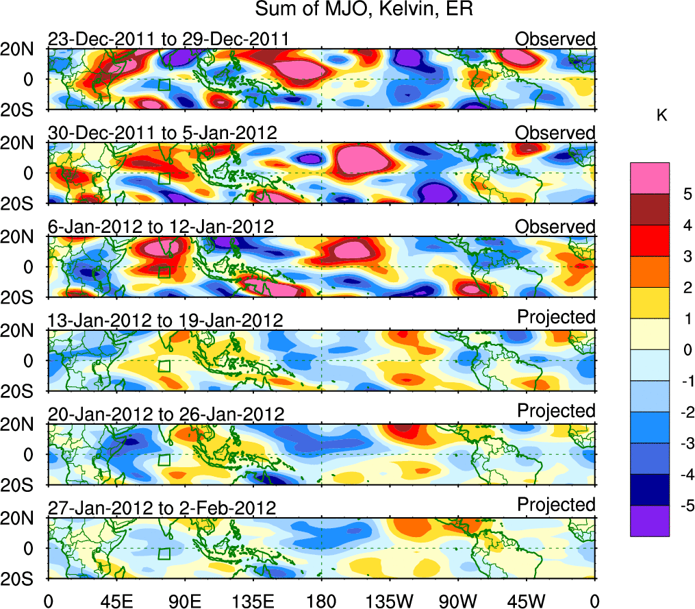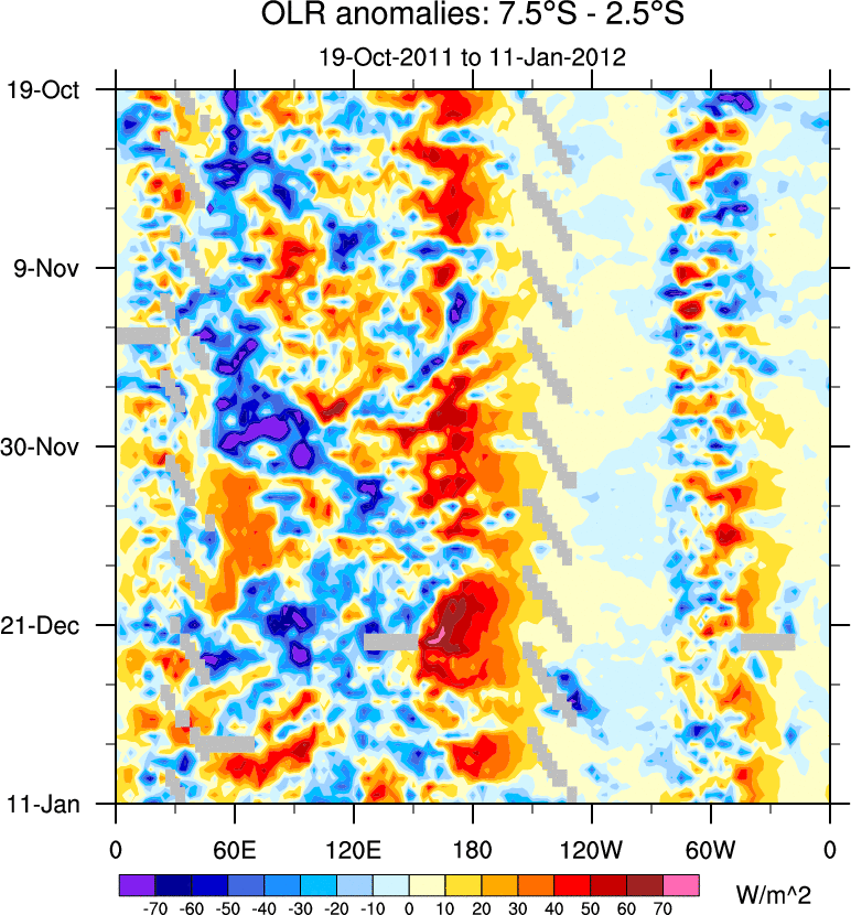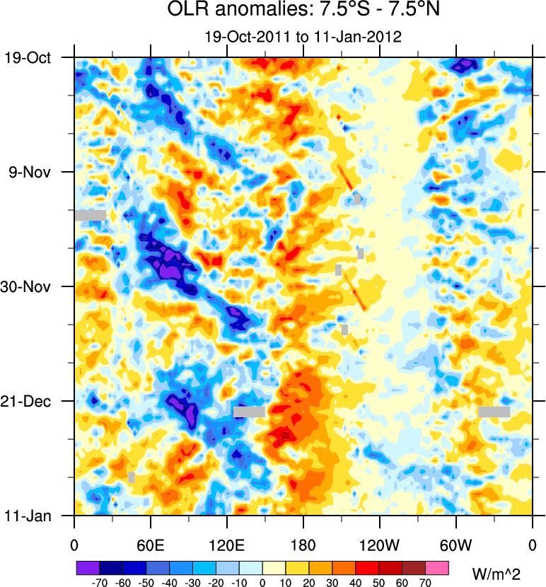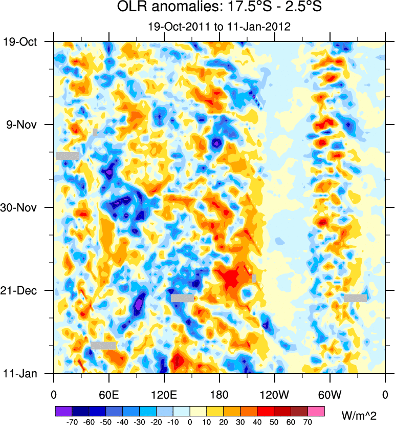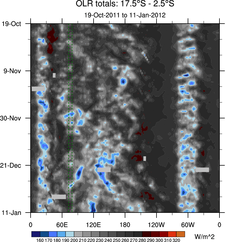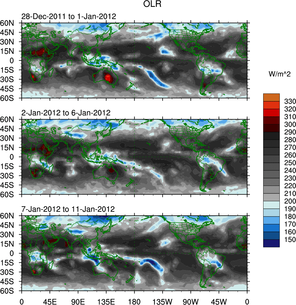 To identify tropical waves in near real-time, the OLR and UTWV data are filtered following Wheeler & Weickmann (2001 MWR). The daily anomalies are calculated using the first 3 harmonics of the seasonal cycle for 1979–2009. Missing values are then filled using linear interpolation in space and time. The most recent 365 days of anomalies are padded with 659 days of zeroes, and the result is filtered for each wave type.