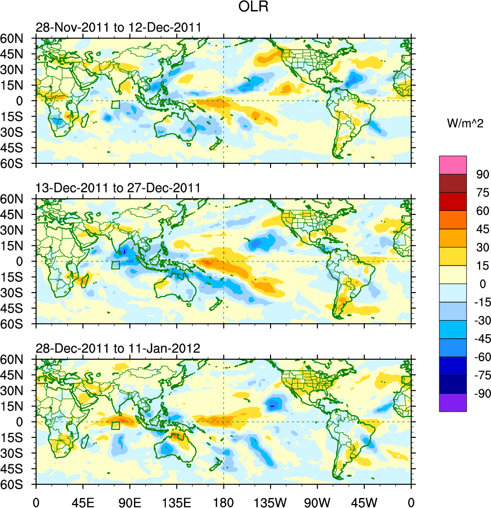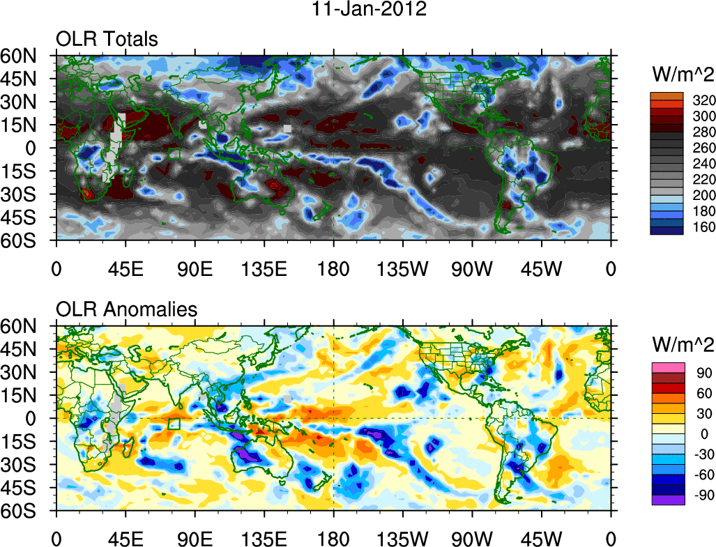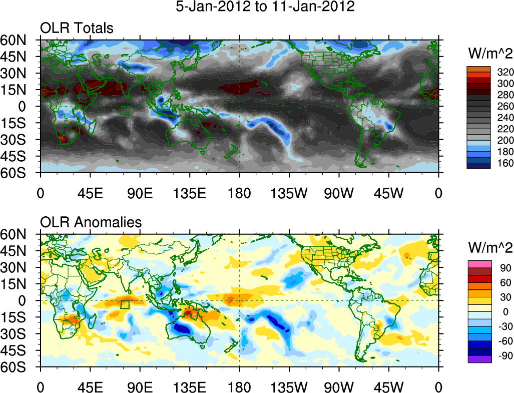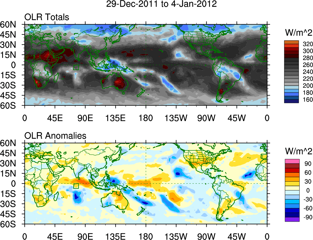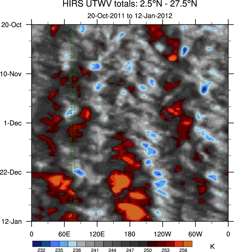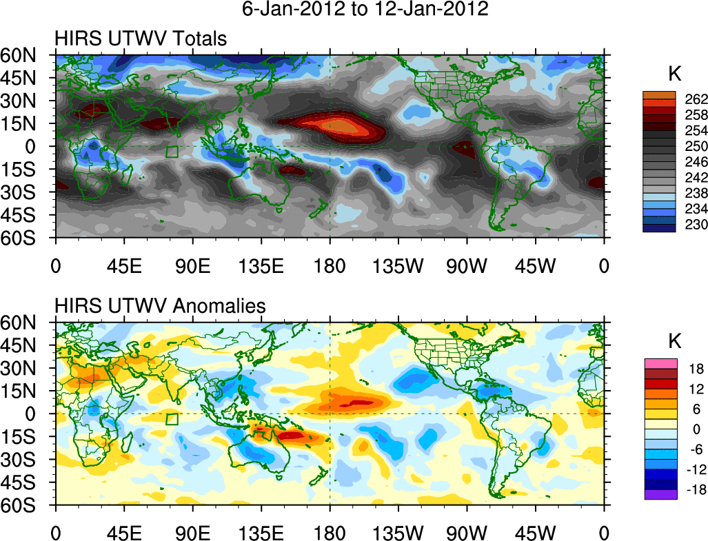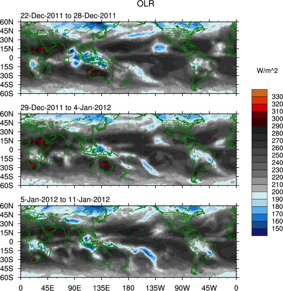 To identify tropical waves in near real-time, the OLR and UTWV data are filtered following Wheeler & Weickmann (2001 MWR). The daily anomalies are calculated using the first 3 harmonics of the seasonal cycle for 1979–2009. Missing values are then filled using linear interpolation in space and time. The most recent 365 days of anomalies are padded with 659 days of zeroes, and the result is filtered for each wave type.