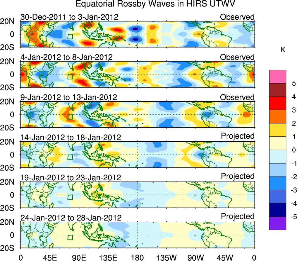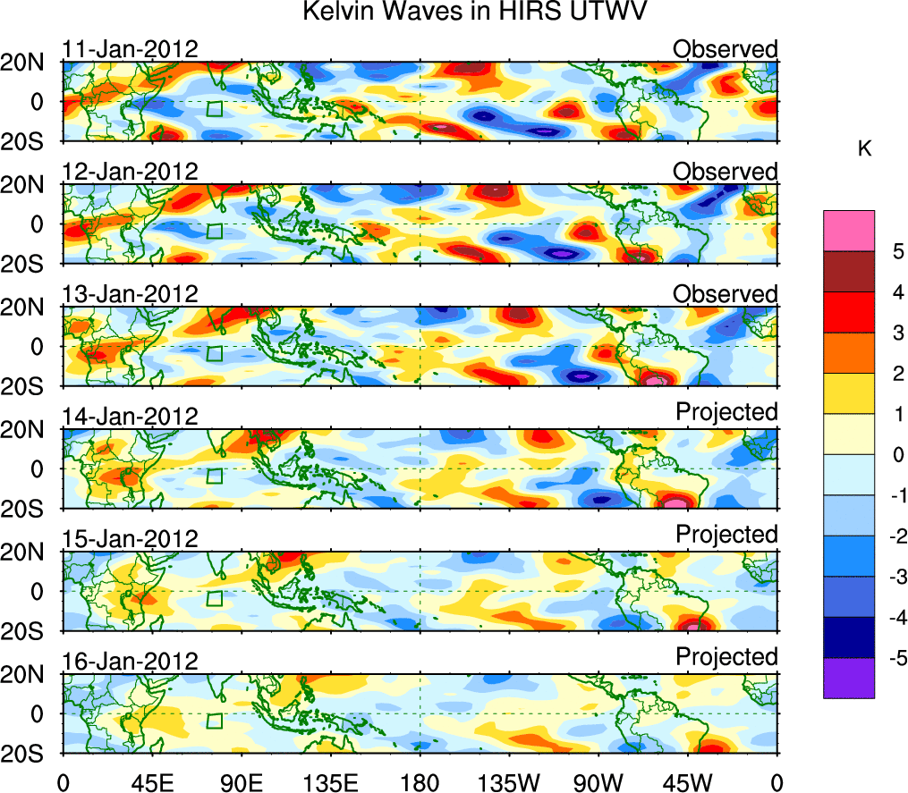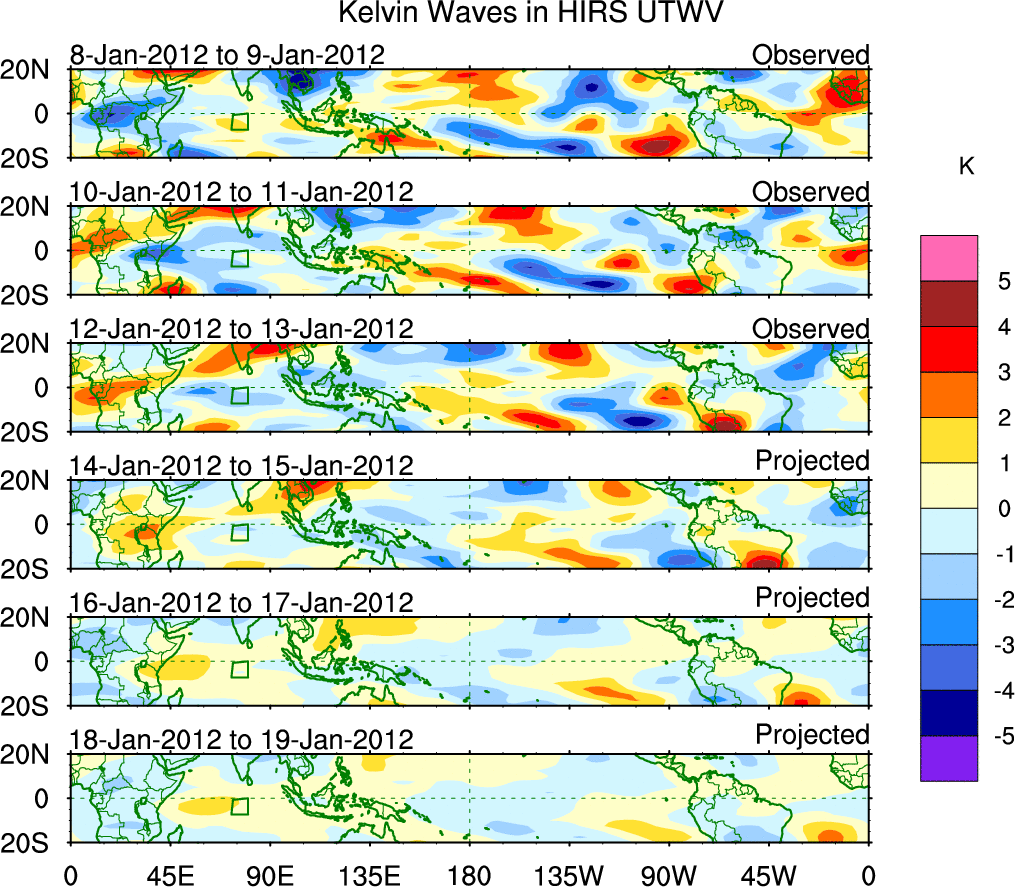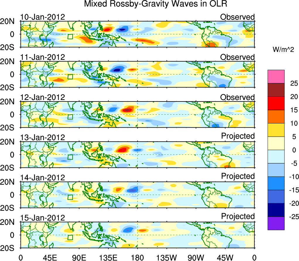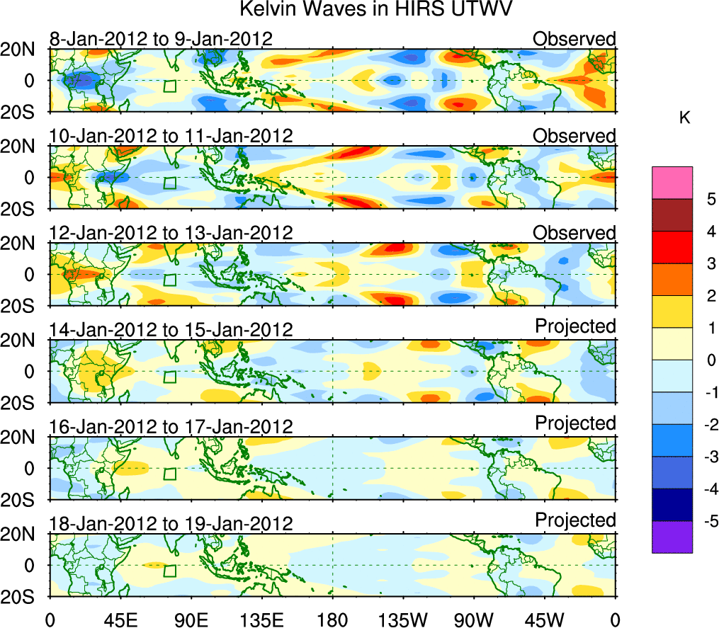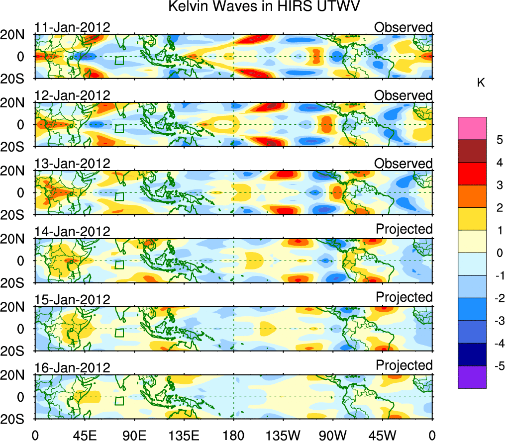 To identify tropical waves in near real-time, the OLR and UTWV data are filtered following Wheeler & Weickmann (2001 MWR). The daily anomalies are calculated using the first 3 harmonics of the seasonal cycle for 1979–2009. Missing values are then filled using linear interpolation in space and time. The most recent 365 days of anomalies are padded with 659 days of zeroes, and the result is filtered for each wave type.