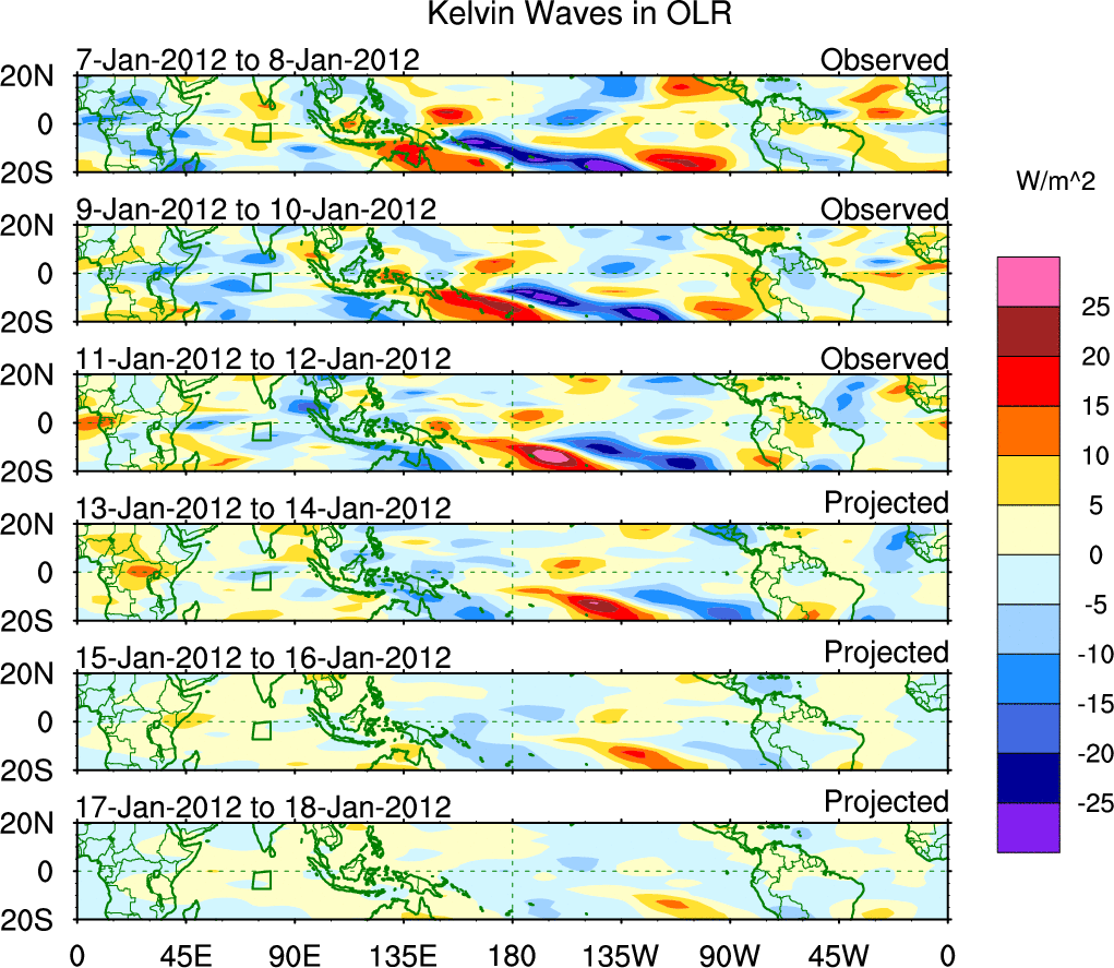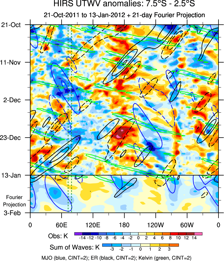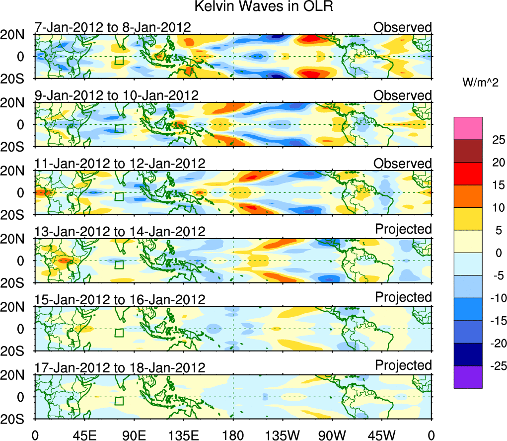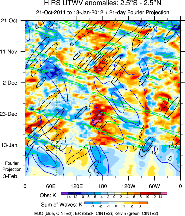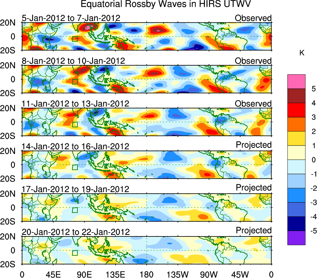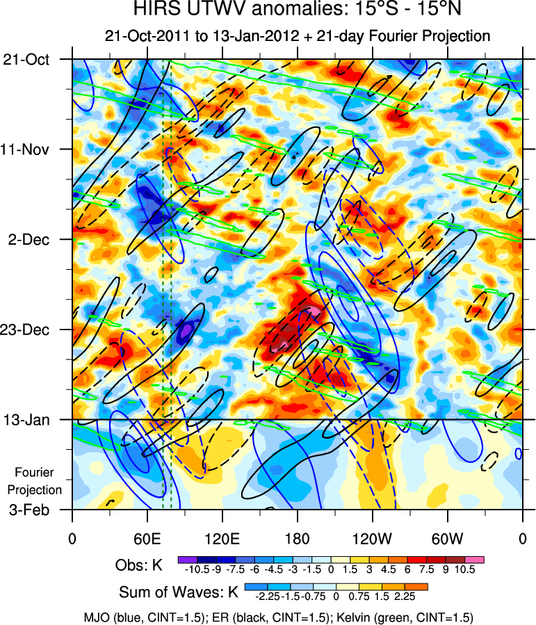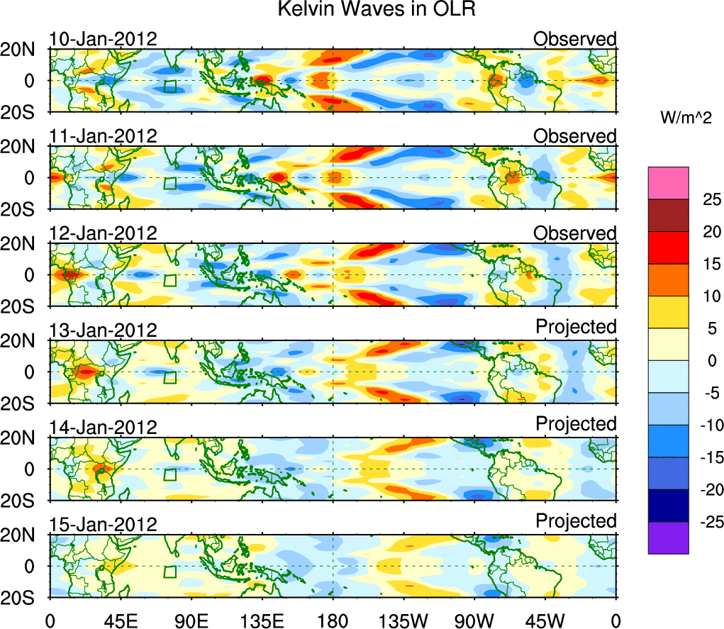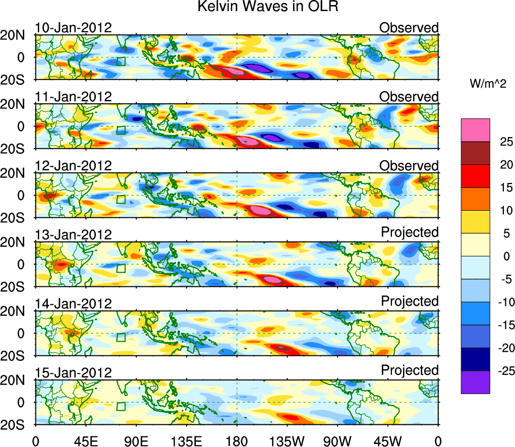 To identify tropical waves in near real-time, the OLR and UTWV data are filtered following Wheeler & Weickmann (2001 MWR). The daily anomalies are calculated using the first 3 harmonics of the seasonal cycle for 1979–2009. Missing values are then filled using linear interpolation in space and time. The most recent 365 days of anomalies are padded with 659 days of zeroes, and the result is filtered for each wave type.