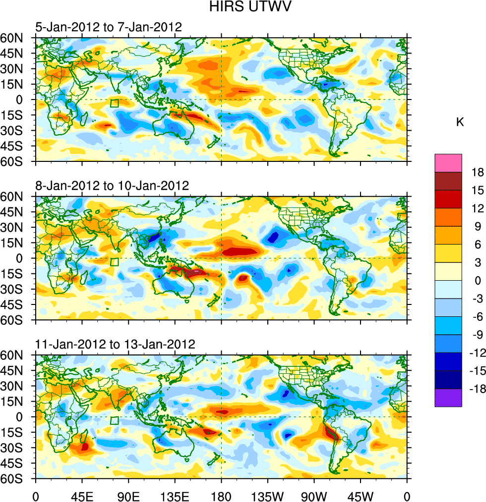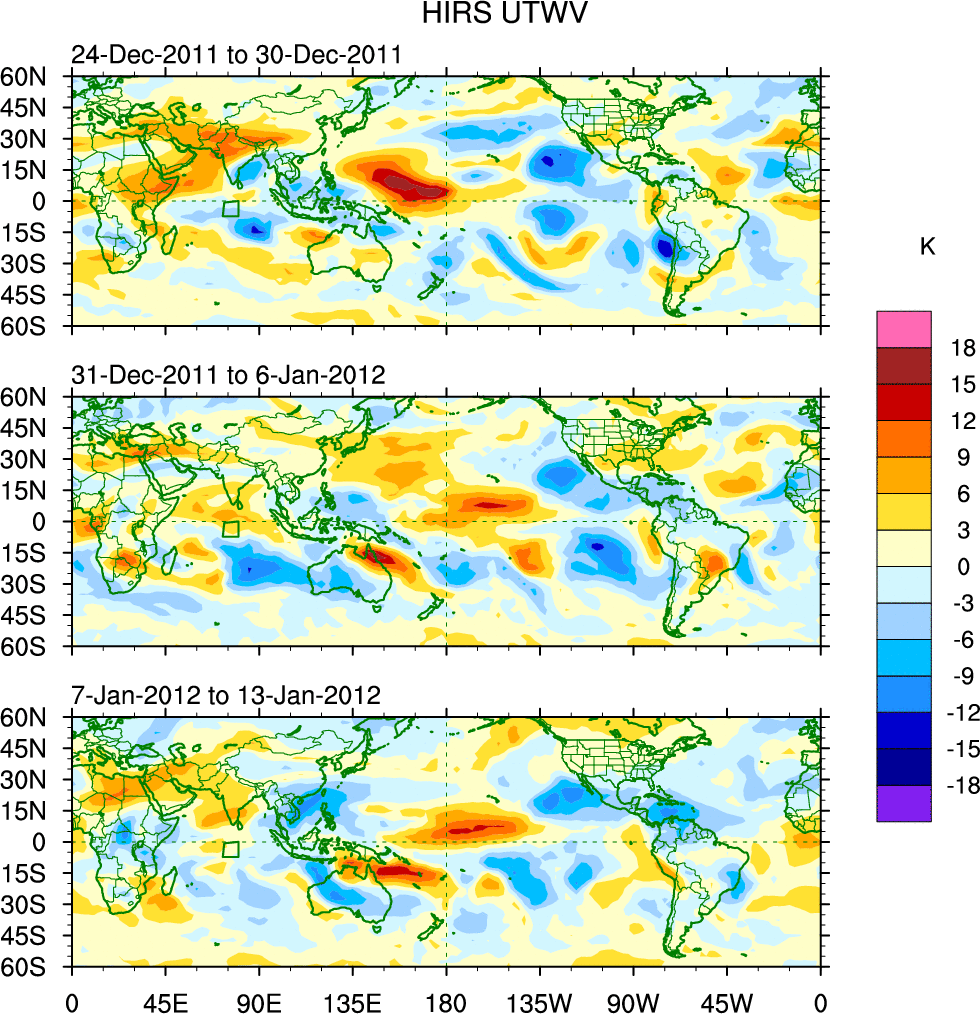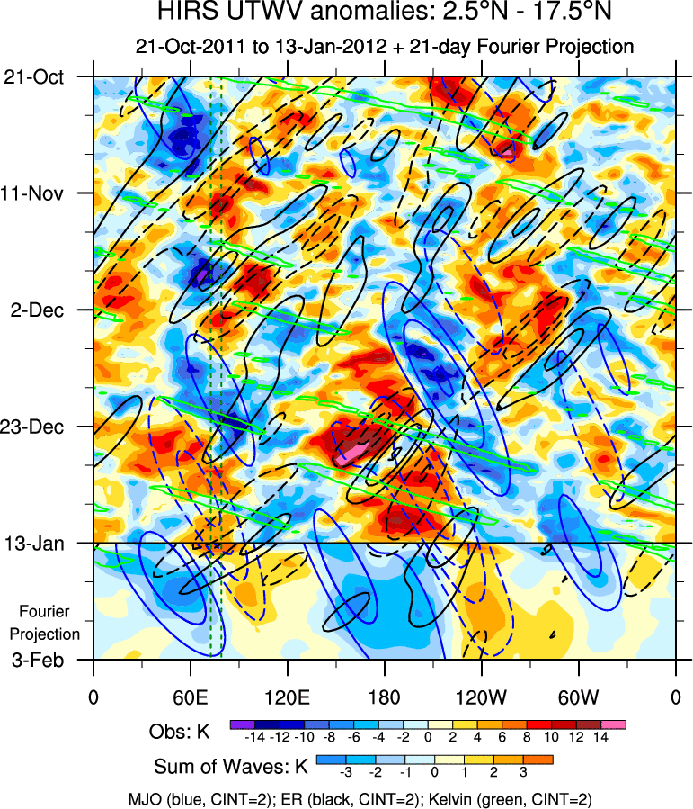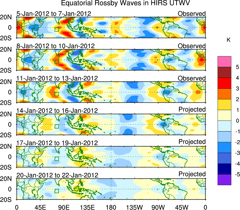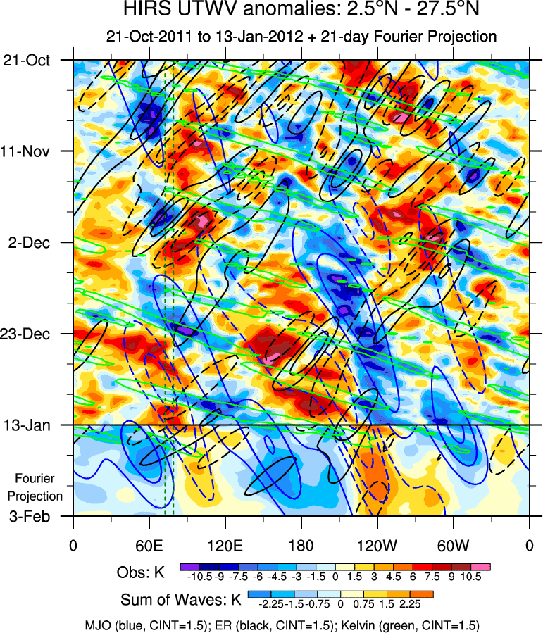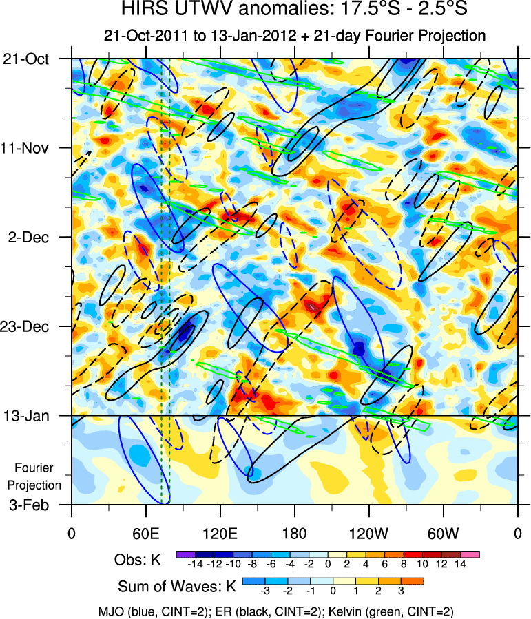 To identify tropical waves in near real-time, the OLR and UTWV data are filtered following Wheeler & Weickmann (2001 MWR). The daily anomalies are calculated using the first 3 harmonics of the seasonal cycle for 1979–2009. Missing values are then filled using linear interpolation in space and time. The most recent 365 days of anomalies are padded with 659 days of zeroes, and the result is filtered for each wave type.