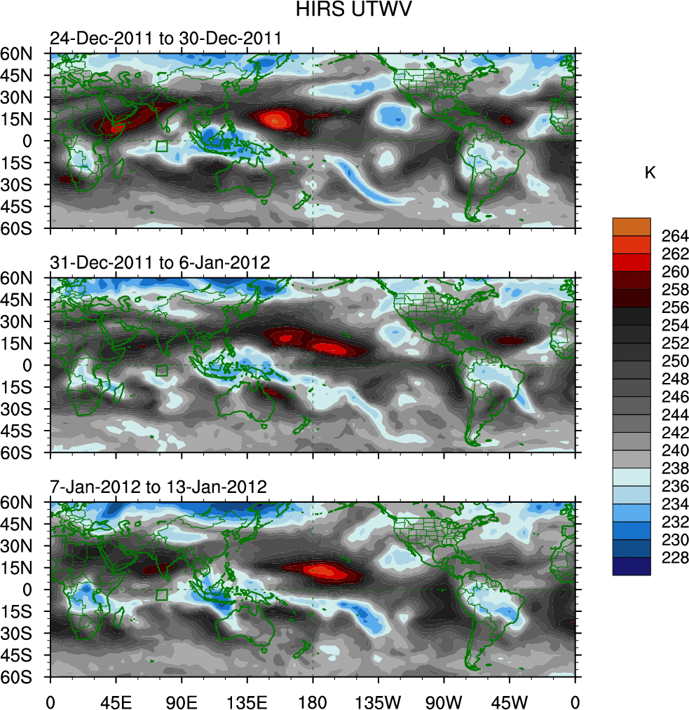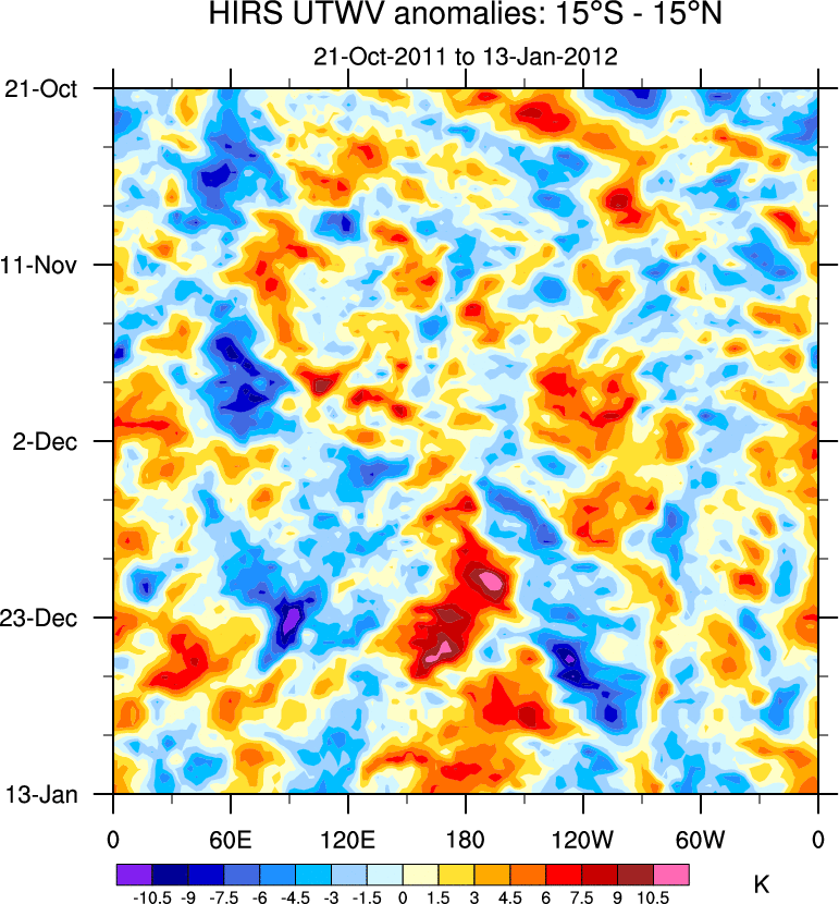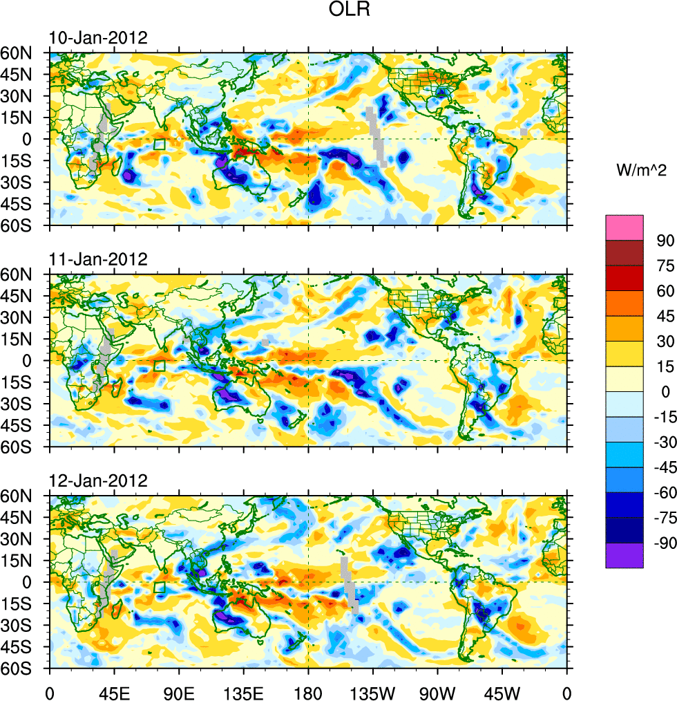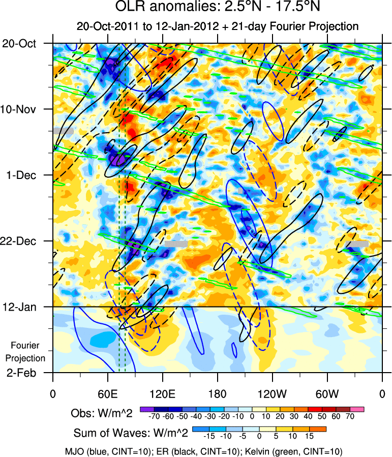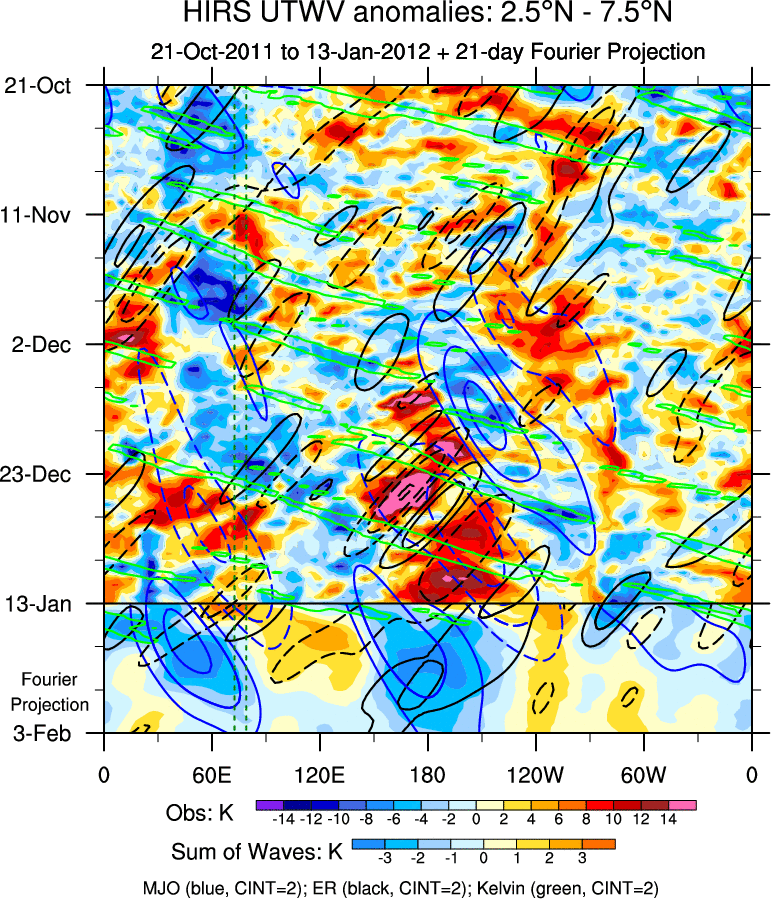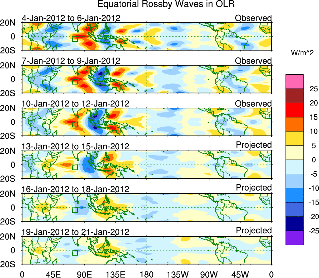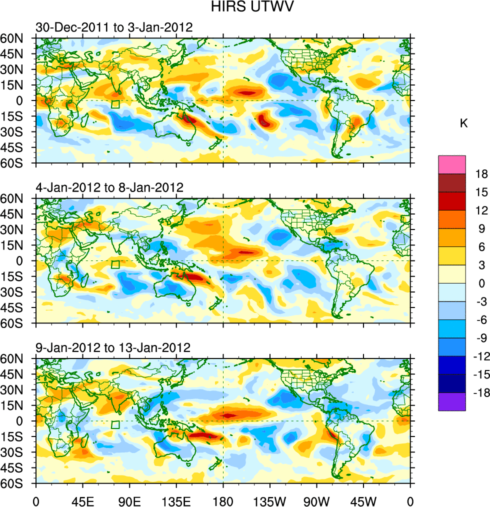 To identify tropical waves in near real-time, the OLR and UTWV data are filtered following Wheeler & Weickmann (2001 MWR). The daily anomalies are calculated using the first 3 harmonics of the seasonal cycle for 1979–2009. Missing values are then filled using linear interpolation in space and time. The most recent 365 days of anomalies are padded with 659 days of zeroes, and the result is filtered for each wave type.