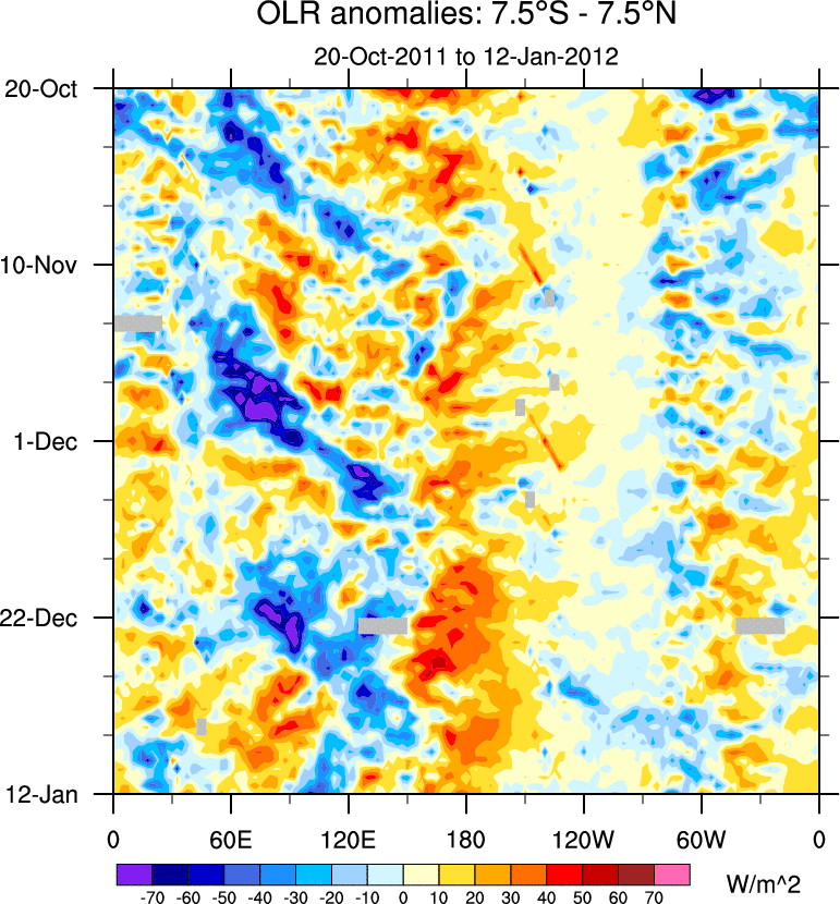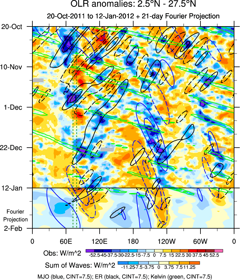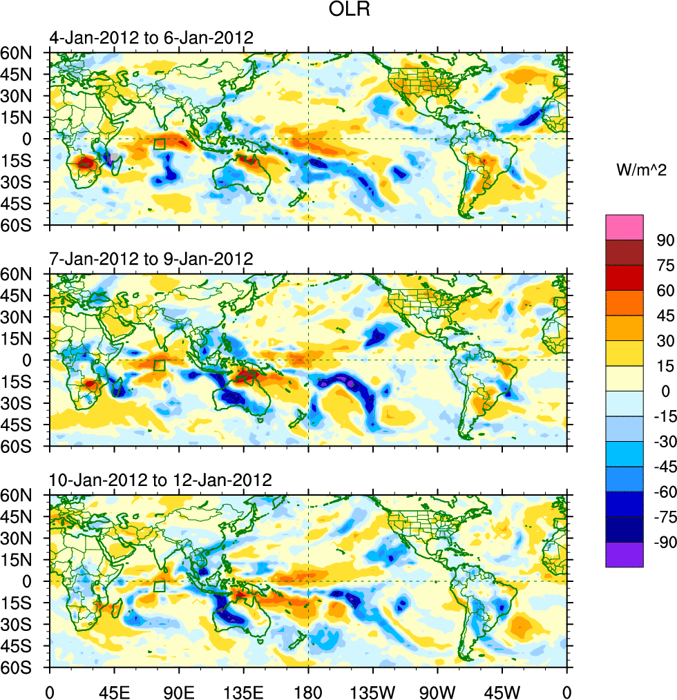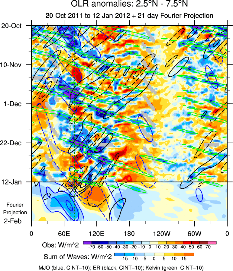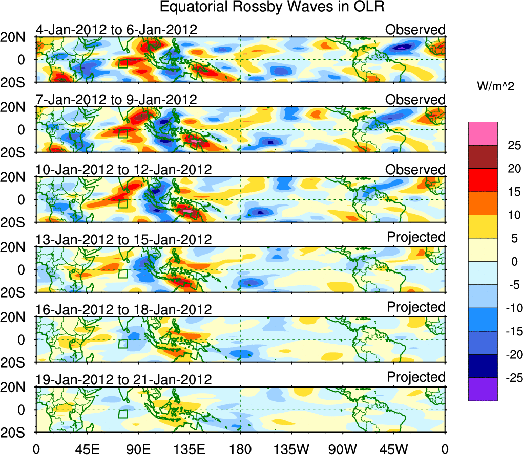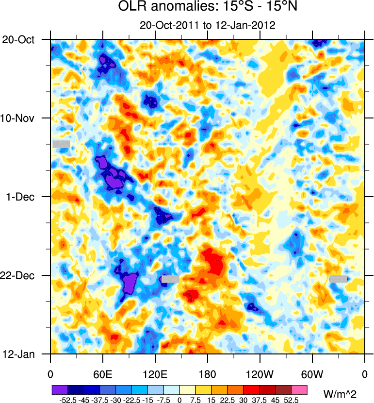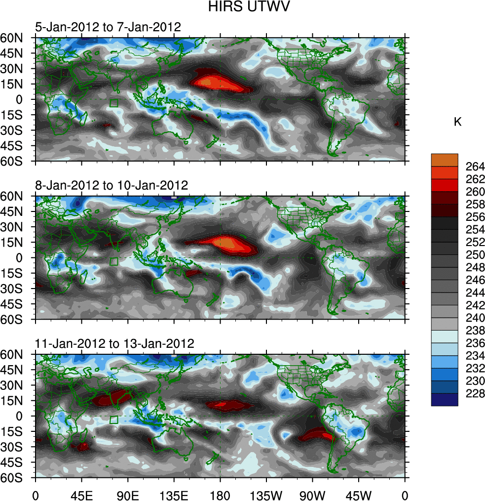To identify tropical waves in near real-time, the OLR and UTWV data are filtered following Wheeler & Weickmann (2001 MWR). The daily anomalies are calculated using the first 3 harmonics of the seasonal cycle for 1979–2009. Missing values are then filled using linear interpolation in space and time. The most recent 365 days of anomalies are padded with 659 days of zeroes, and the result is filtered for each wave type.