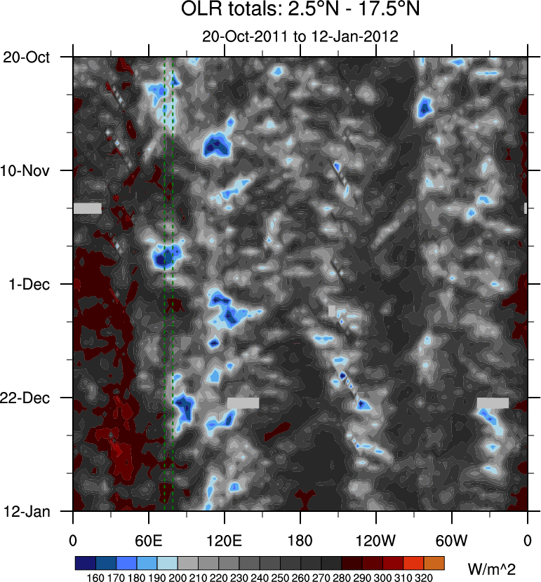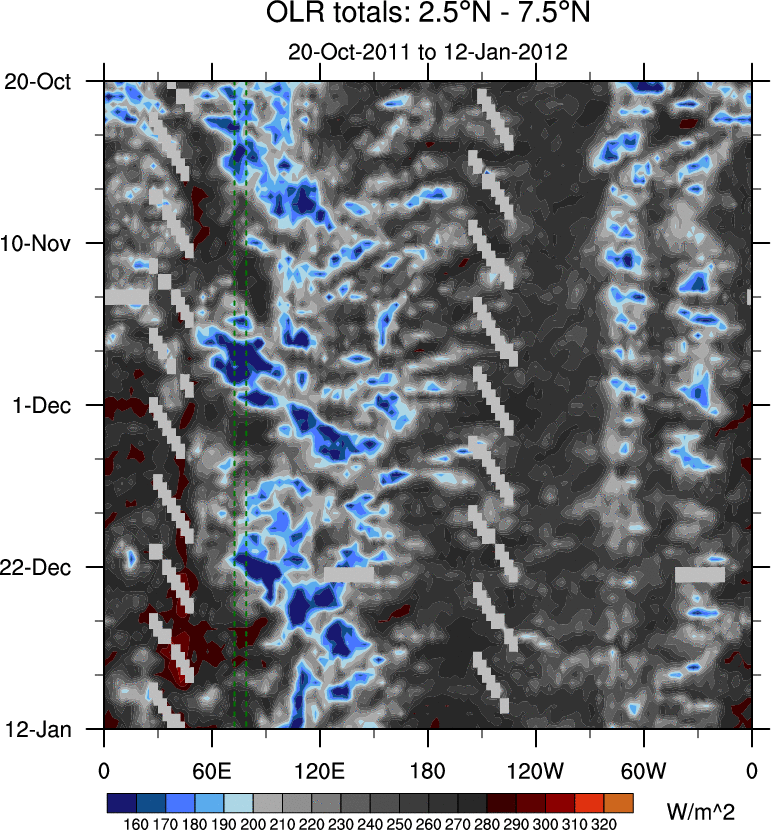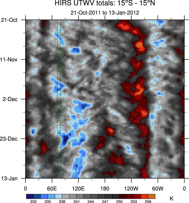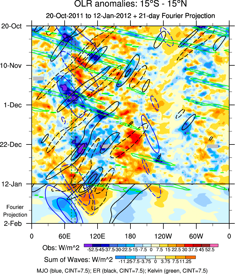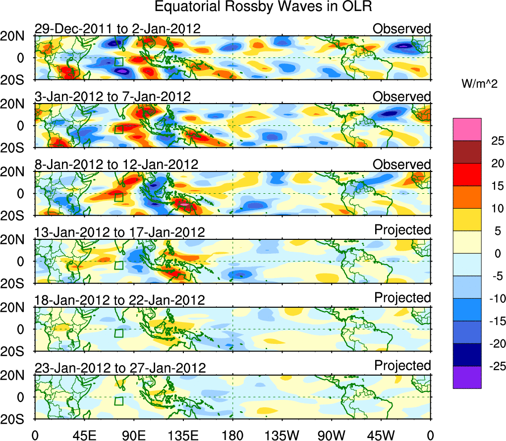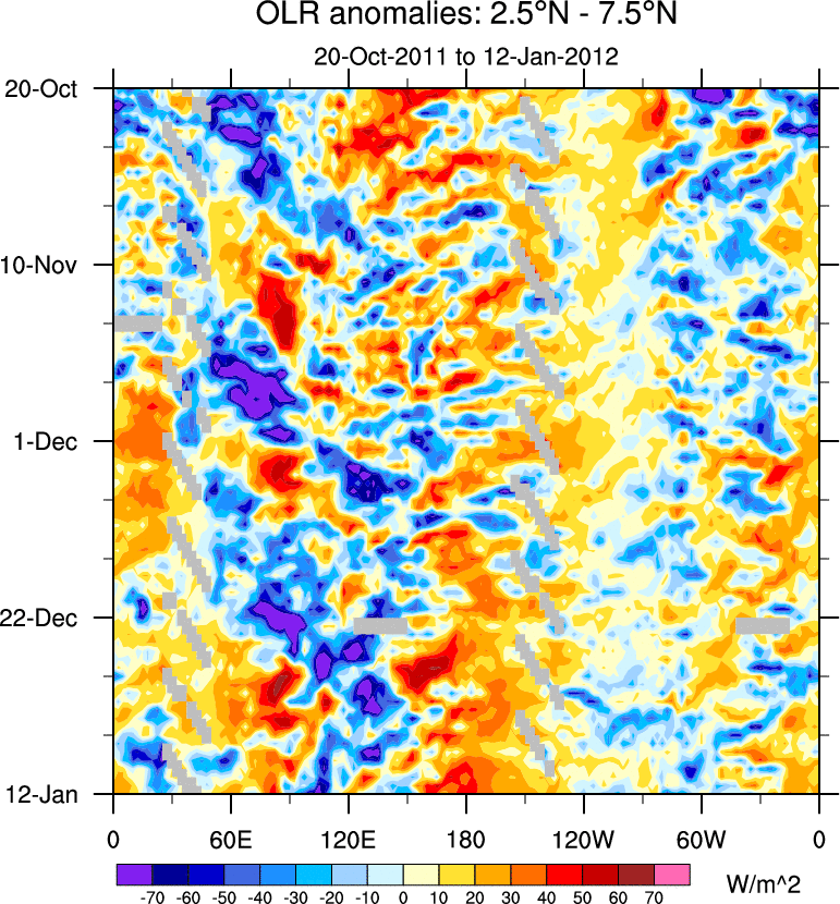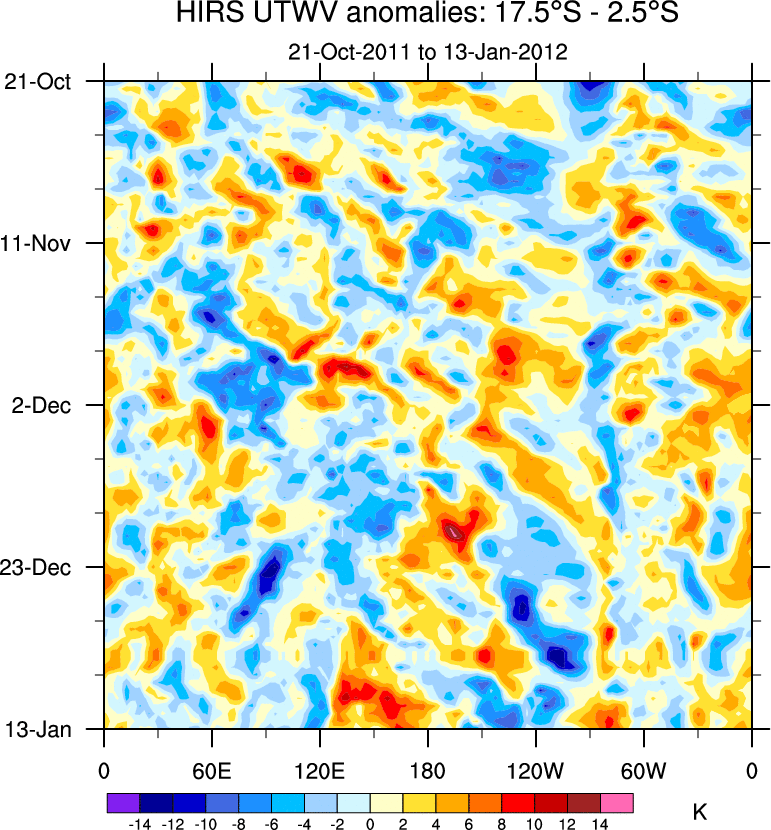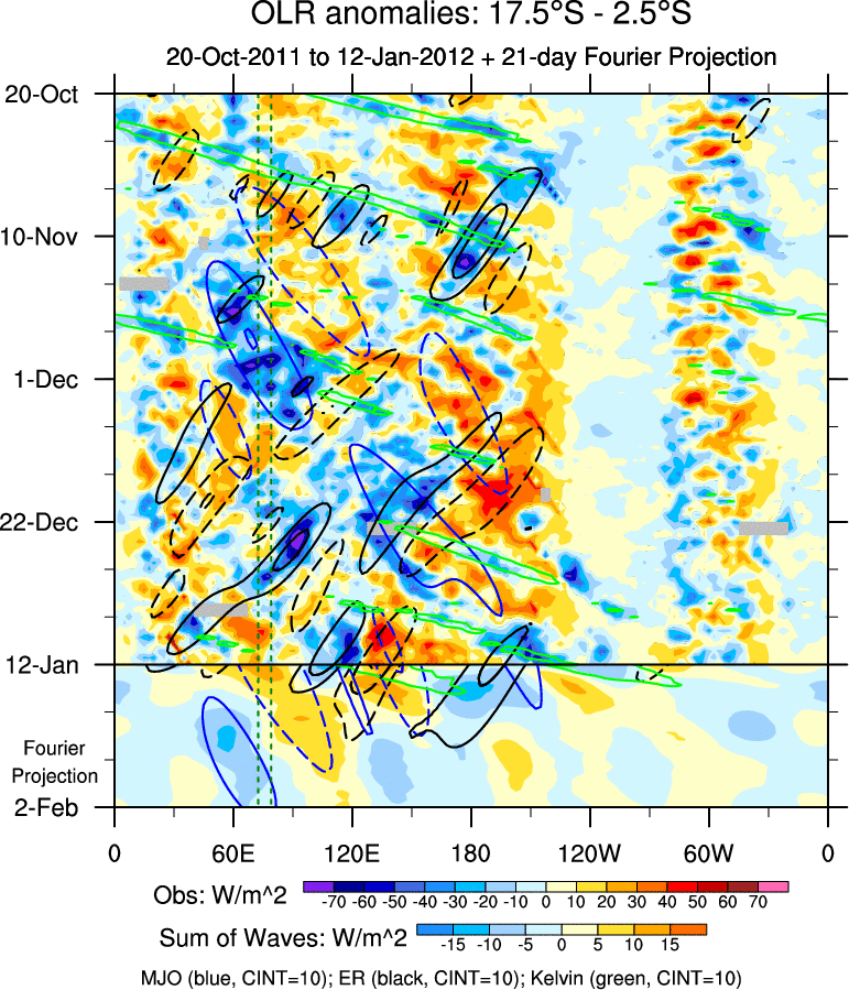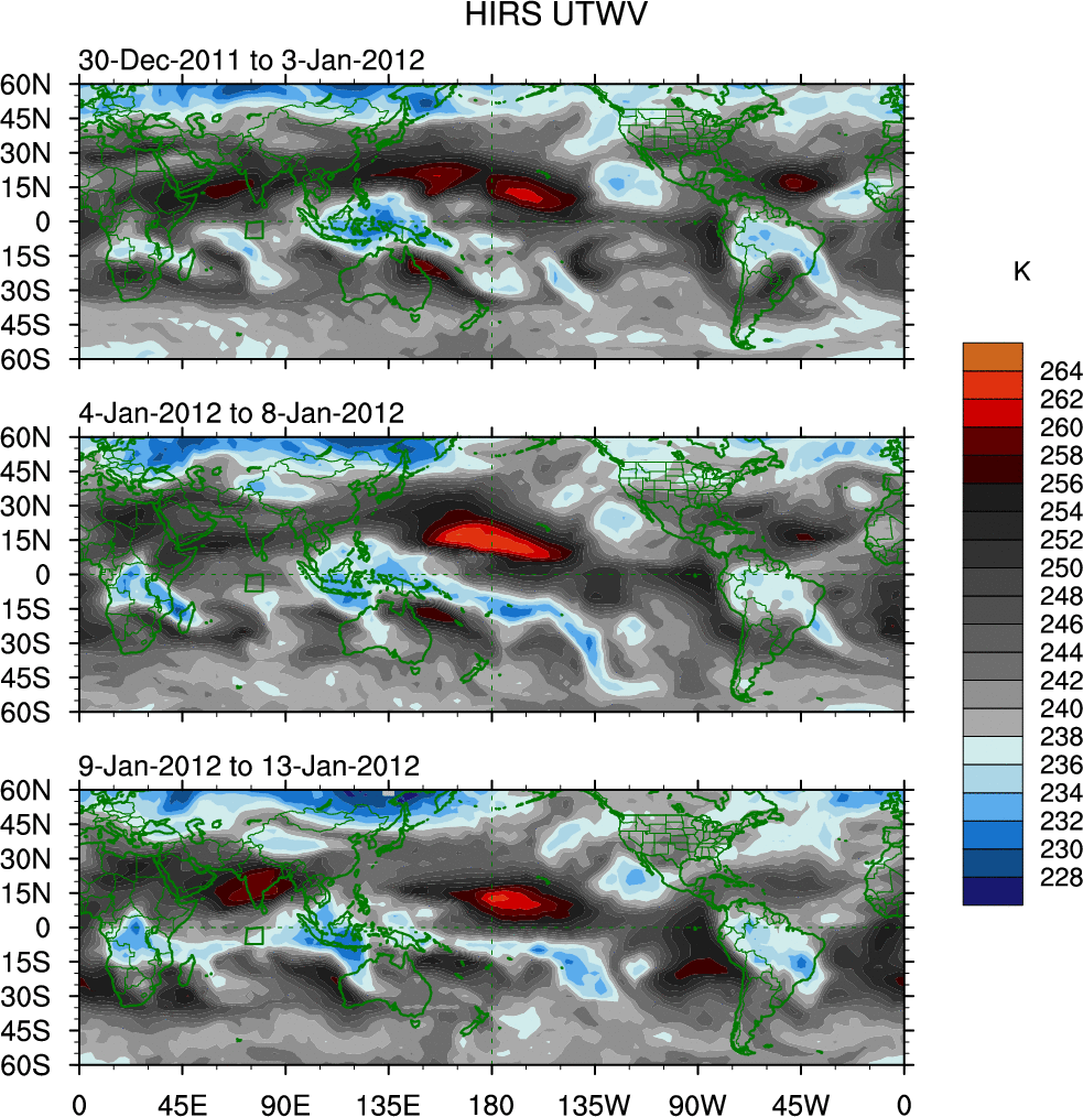 To identify tropical waves in near real-time, the OLR and UTWV data are filtered following Wheeler & Weickmann (2001 MWR). The daily anomalies are calculated using the first 3 harmonics of the seasonal cycle for 1979–2009. Missing values are then filled using linear interpolation in space and time. The most recent 365 days of anomalies are padded with 659 days of zeroes, and the result is filtered for each wave type.