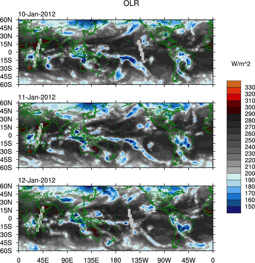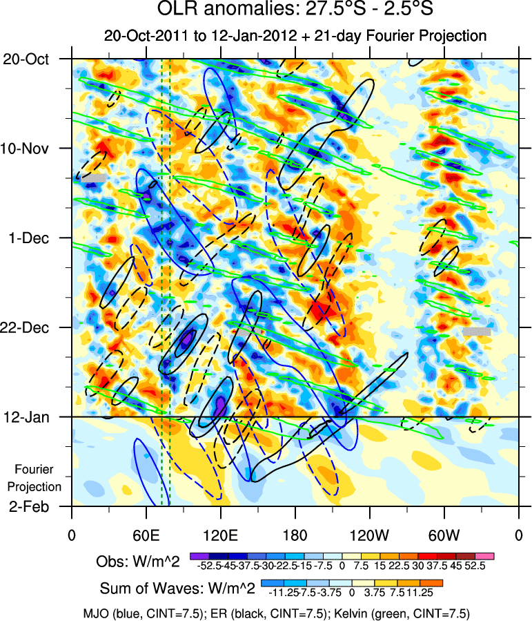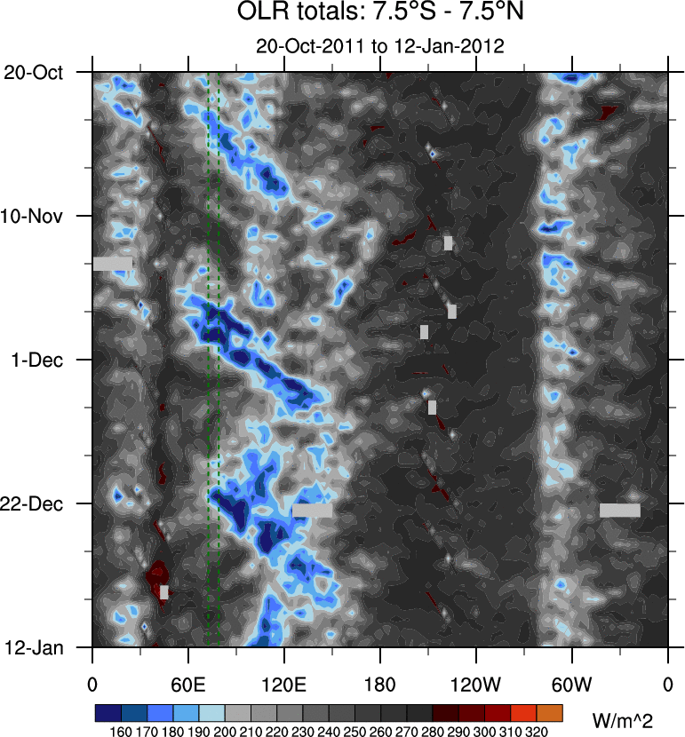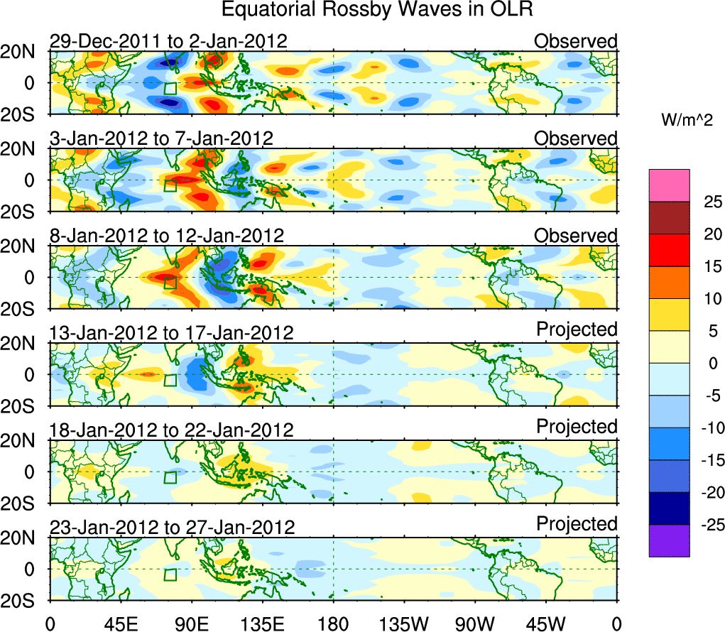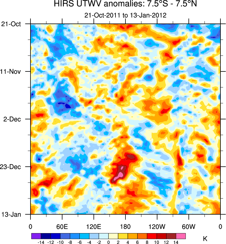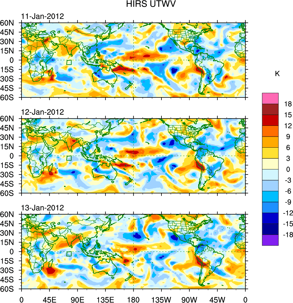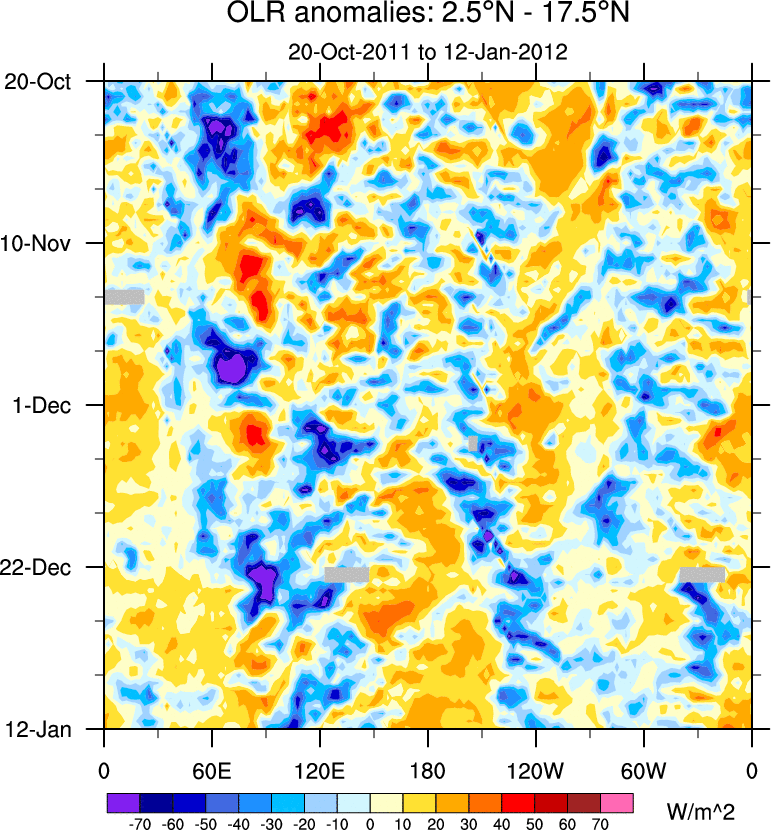 To identify tropical waves in near real-time, the OLR and UTWV data are filtered following Wheeler & Weickmann (2001 MWR). The daily anomalies are calculated using the first 3 harmonics of the seasonal cycle for 1979–2009. Missing values are then filled using linear interpolation in space and time. The most recent 365 days of anomalies are padded with 659 days of zeroes, and the result is filtered for each wave type.