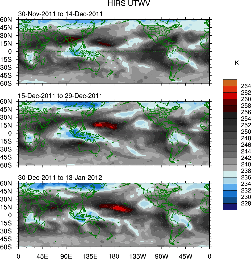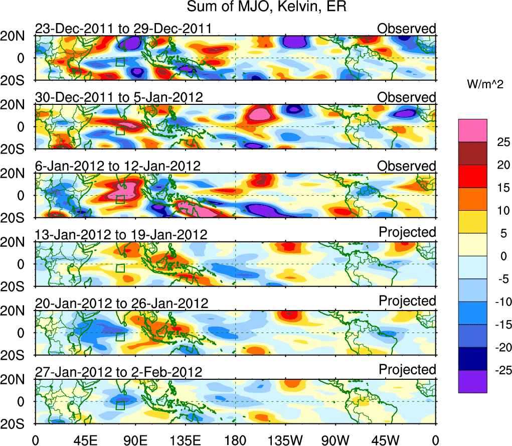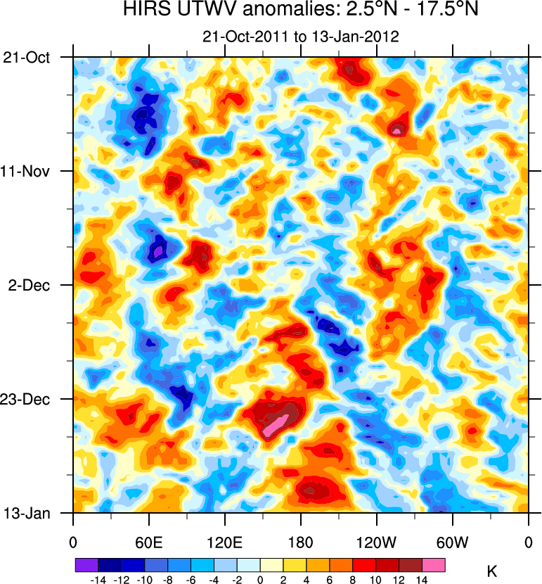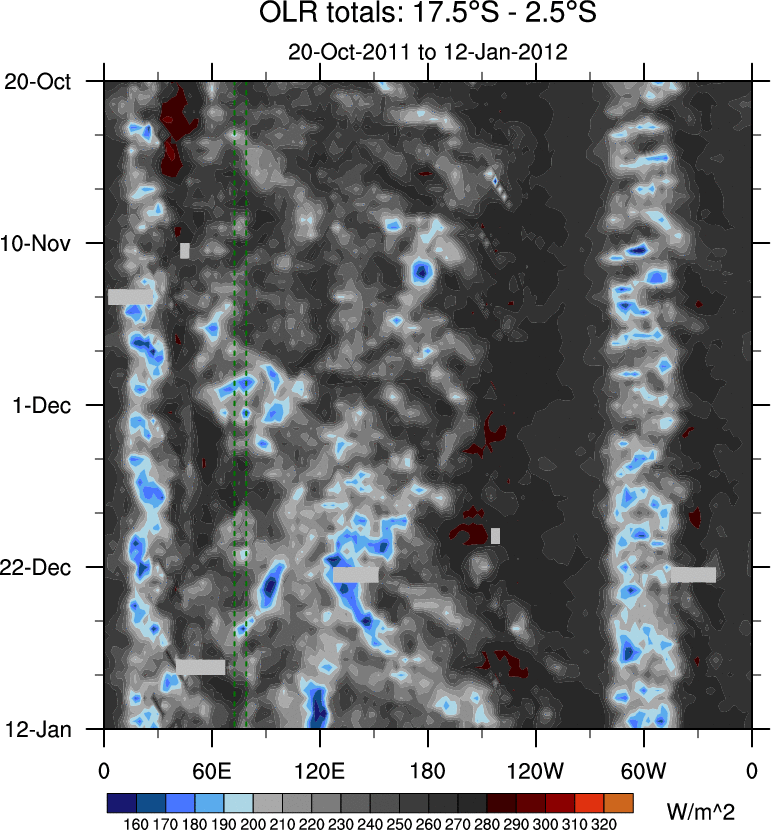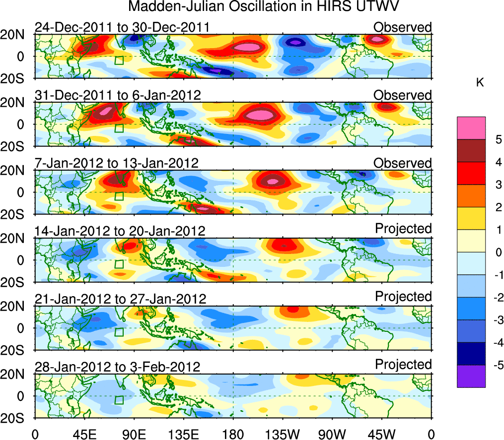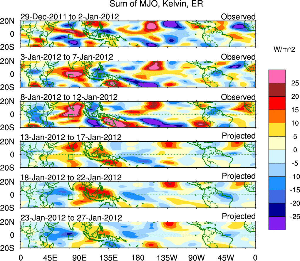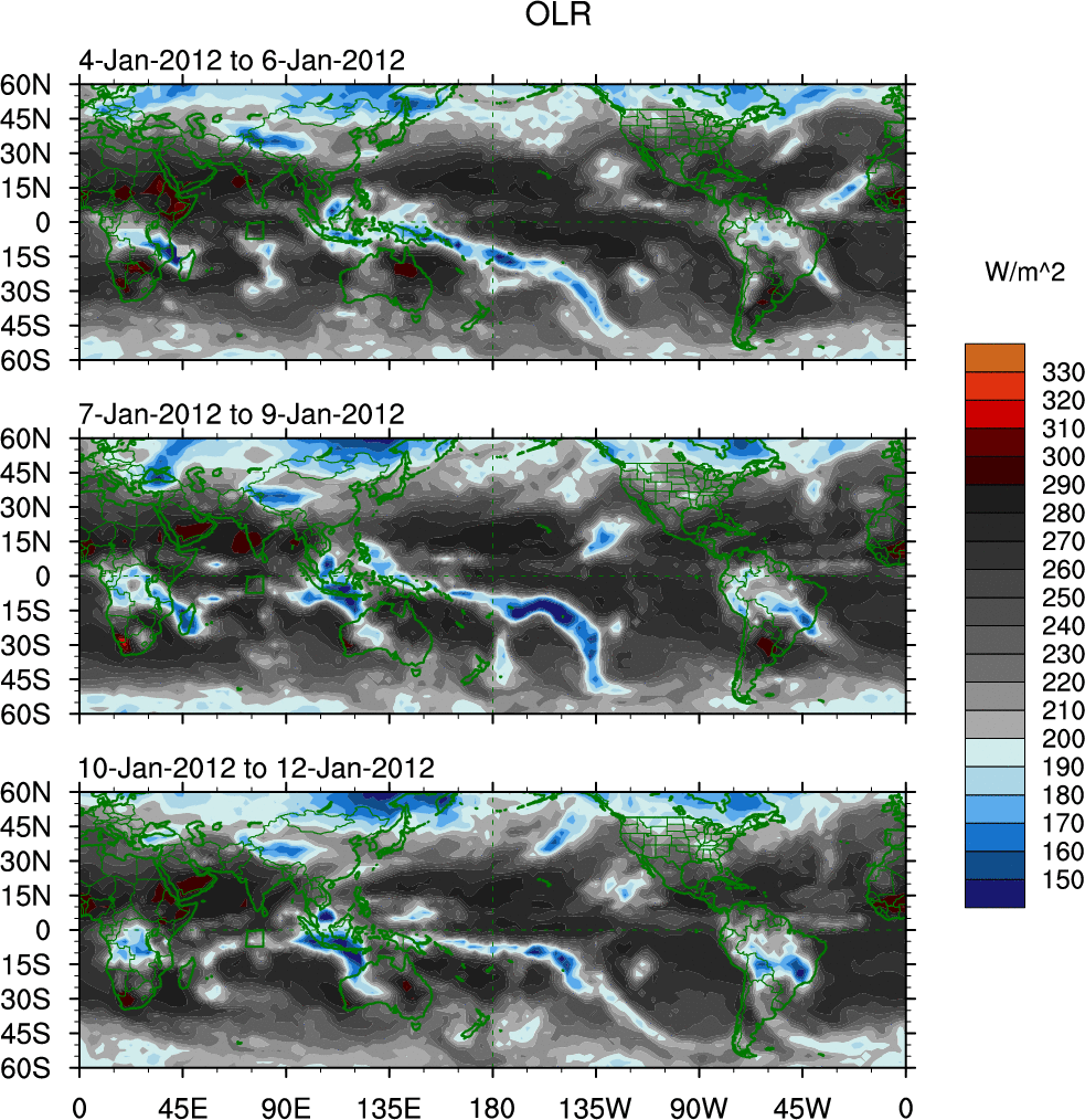 To identify tropical waves in near real-time, the OLR and UTWV data are filtered following Wheeler & Weickmann (2001 MWR). The daily anomalies are calculated using the first 3 harmonics of the seasonal cycle for 1979–2009. Missing values are then filled using linear interpolation in space and time. The most recent 365 days of anomalies are padded with 659 days of zeroes, and the result is filtered for each wave type.