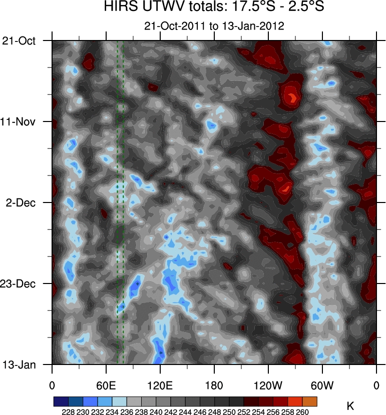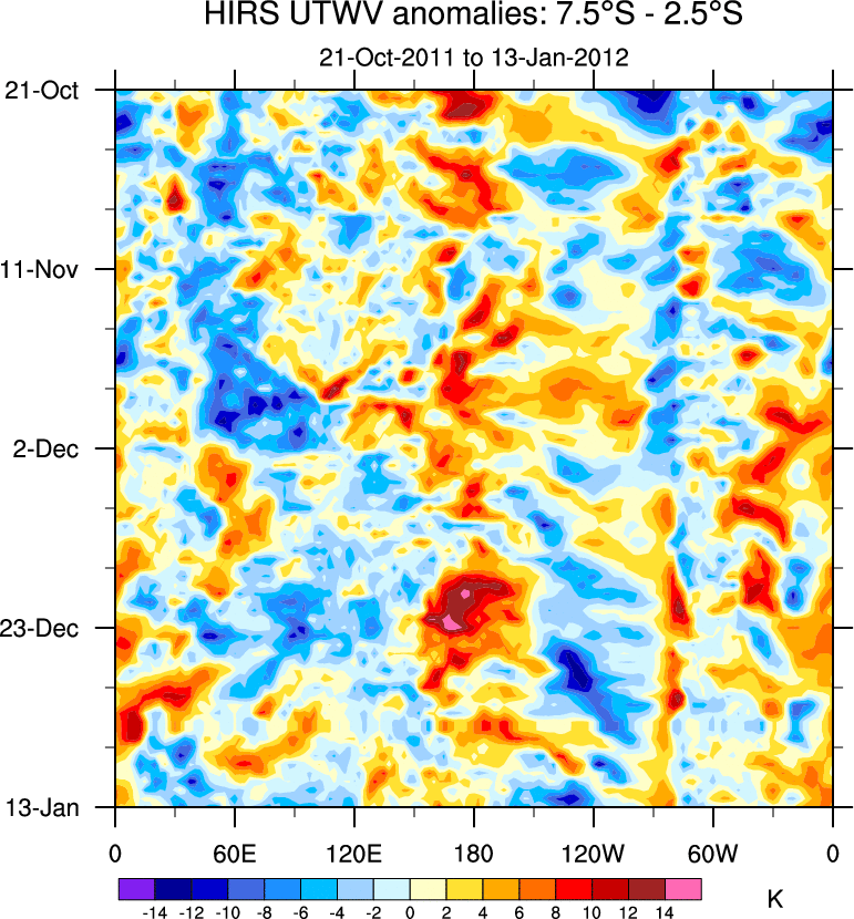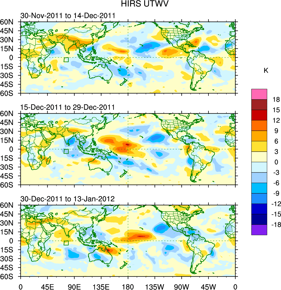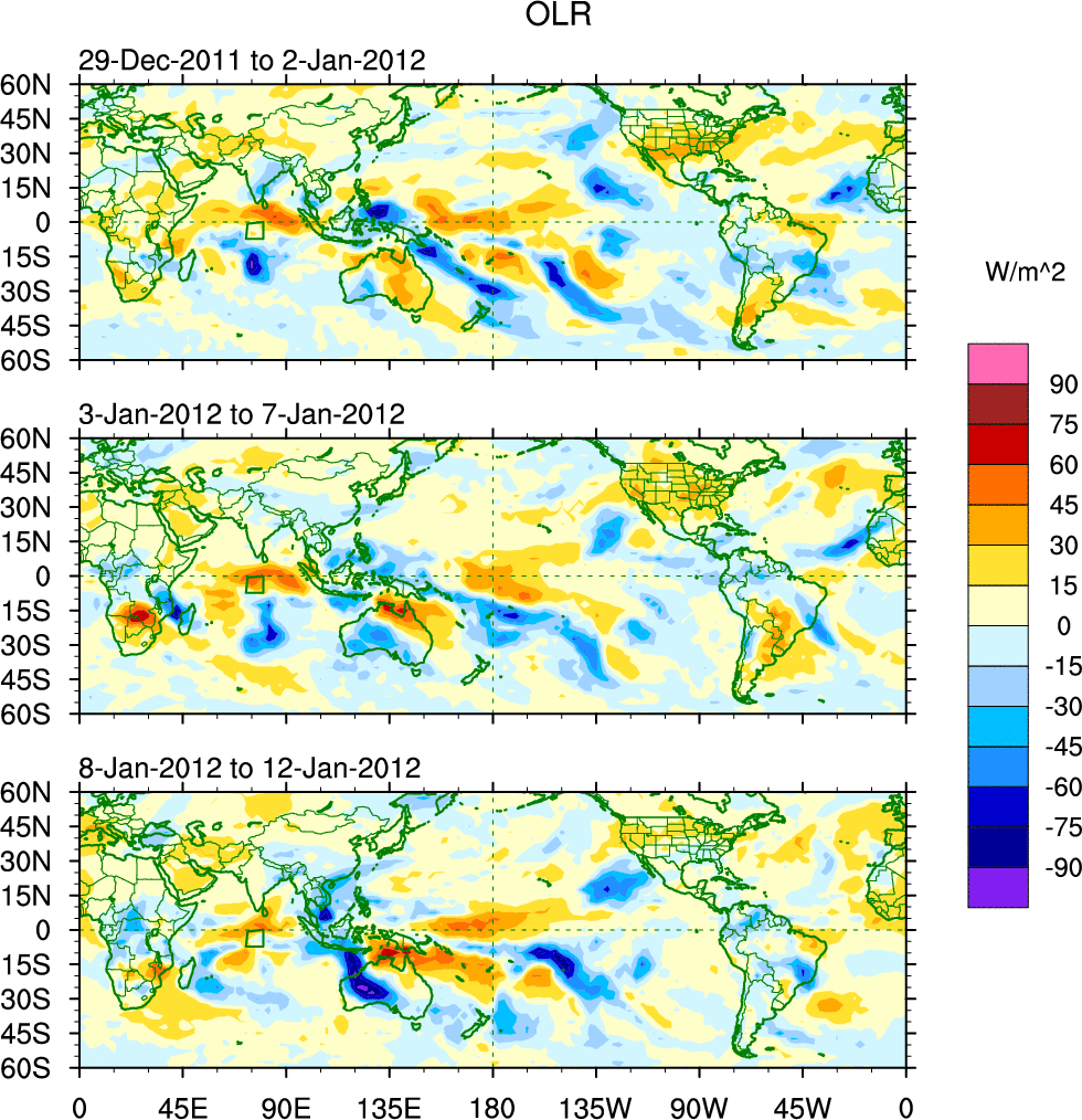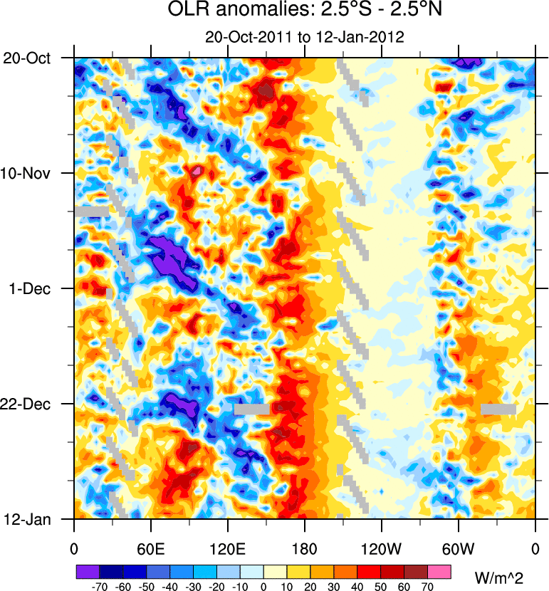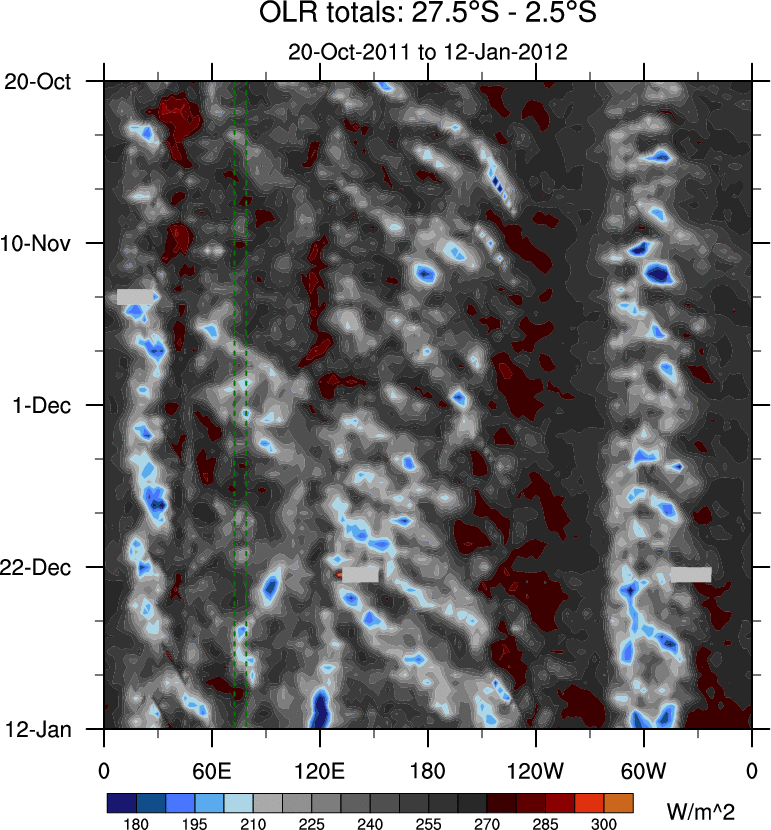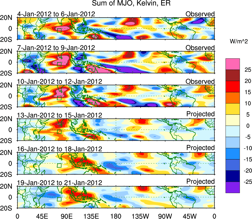 To identify tropical waves in near real-time, the OLR and UTWV data are filtered following Wheeler & Weickmann (2001 MWR). The daily anomalies are calculated using the first 3 harmonics of the seasonal cycle for 1979–2009. Missing values are then filled using linear interpolation in space and time. The most recent 365 days of anomalies are padded with 659 days of zeroes, and the result is filtered for each wave type.
