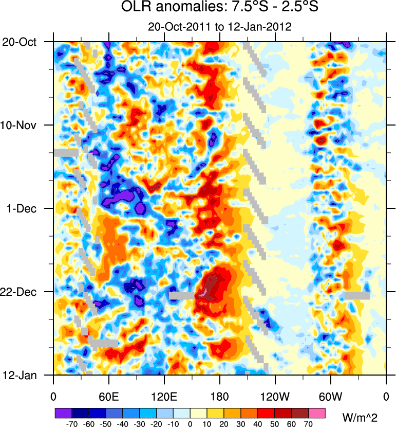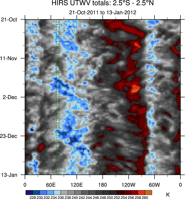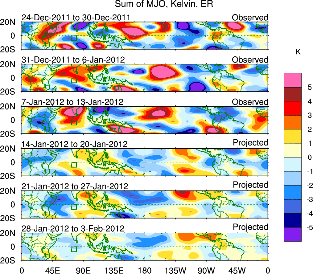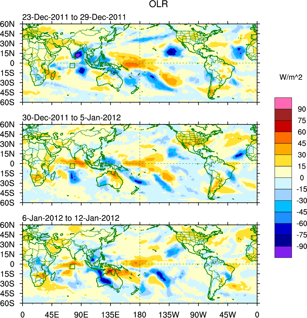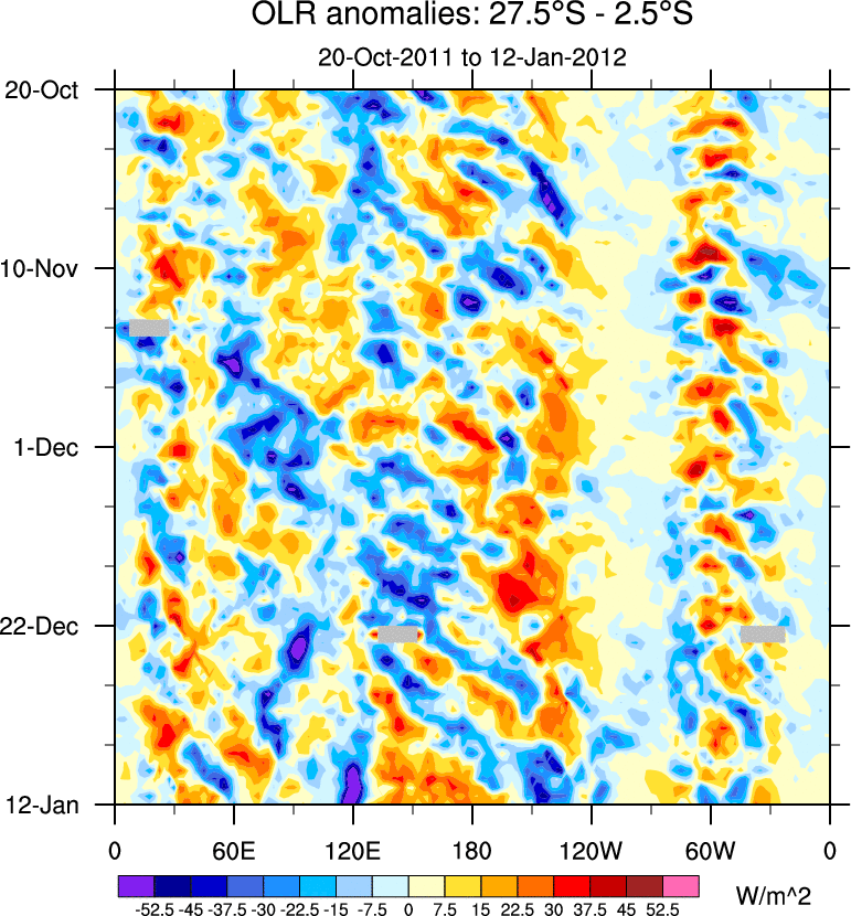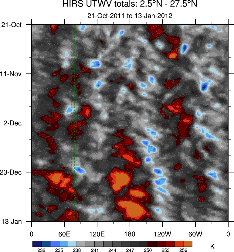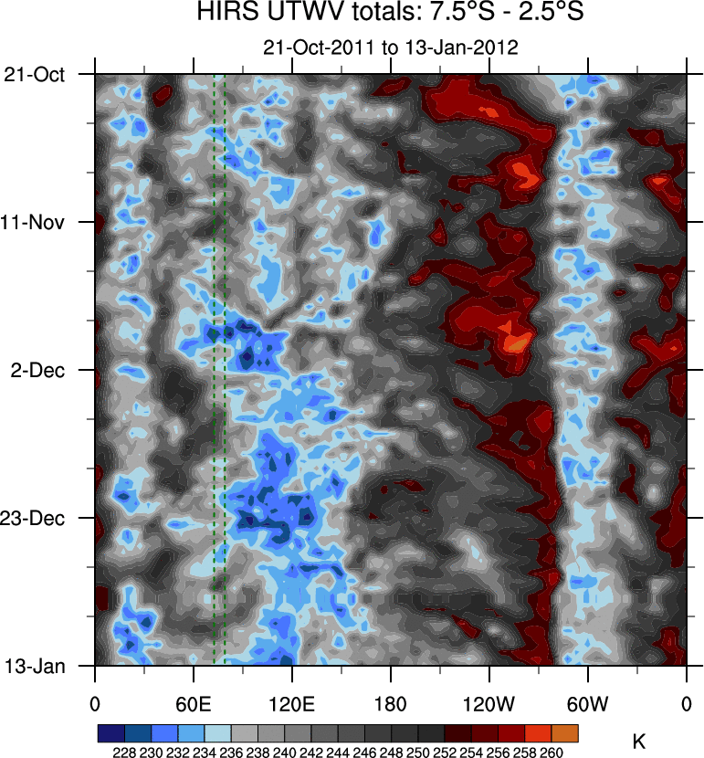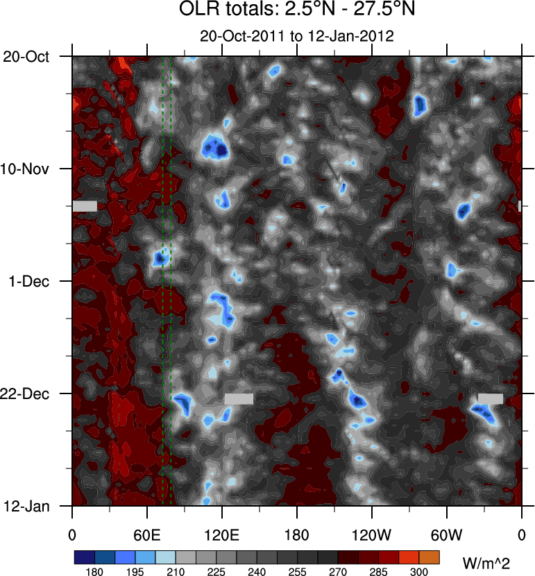 To identify tropical waves in near real-time, the OLR and UTWV data are filtered following Wheeler & Weickmann (2001 MWR). The daily anomalies are calculated using the first 3 harmonics of the seasonal cycle for 1979–2009. Missing values are then filled using linear interpolation in space and time. The most recent 365 days of anomalies are padded with 659 days of zeroes, and the result is filtered for each wave type.